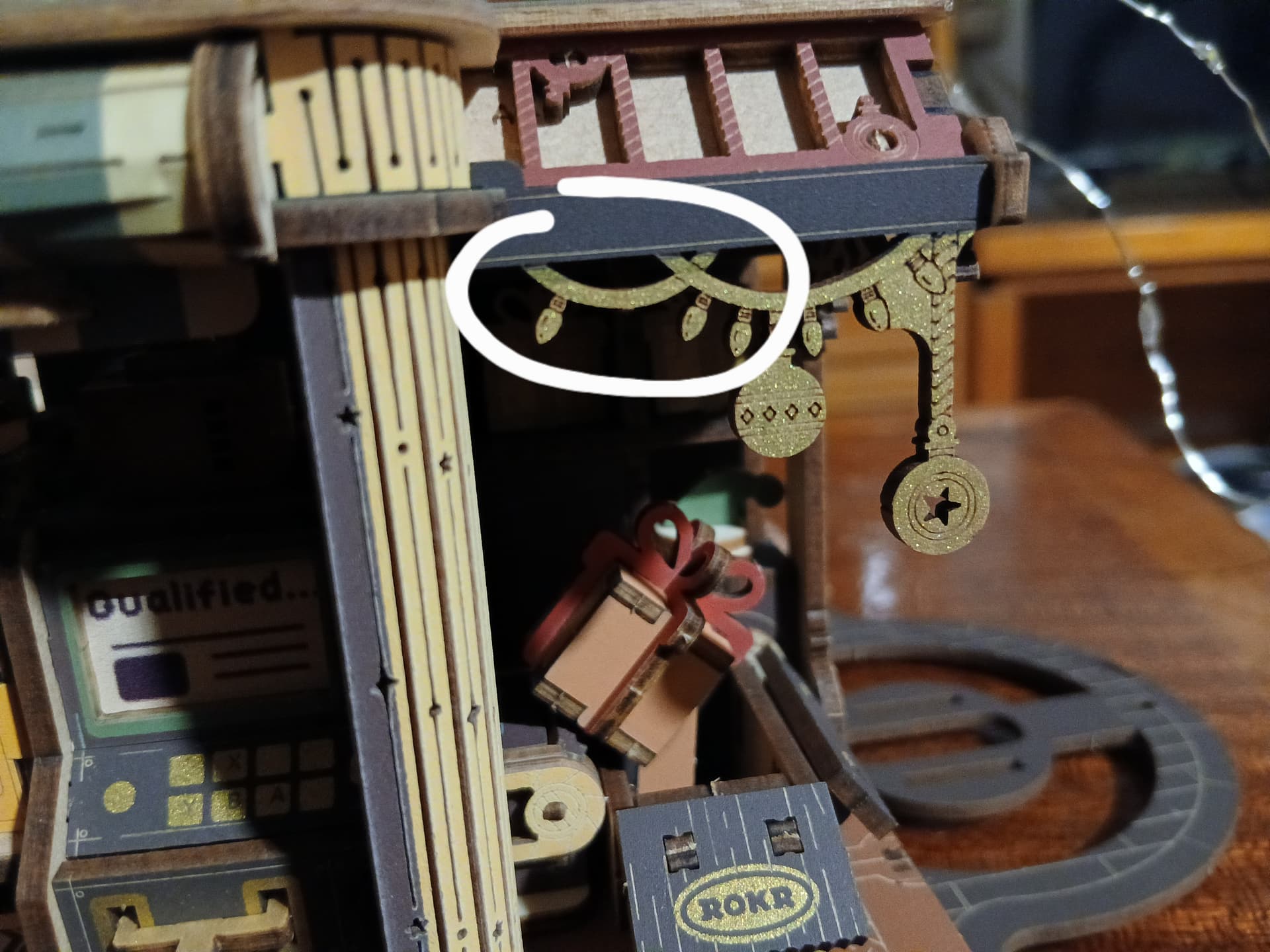 PS: I just found out I left one light of the long cord behind the “Qualified” machine thing, so you can kind of see the small gift moving behind it through the small gap between the pieces. I’m not sure if I’m explaining myself correctly. Is that supposed to happen? I’m pretty sure you’re not supposed to notice that lol