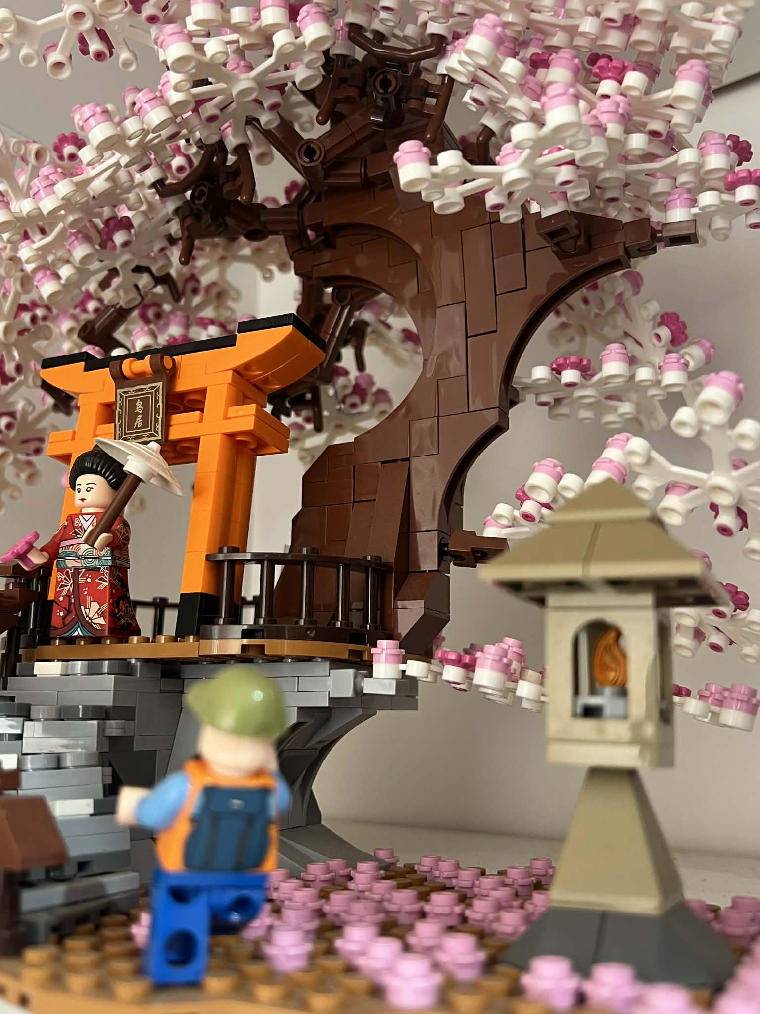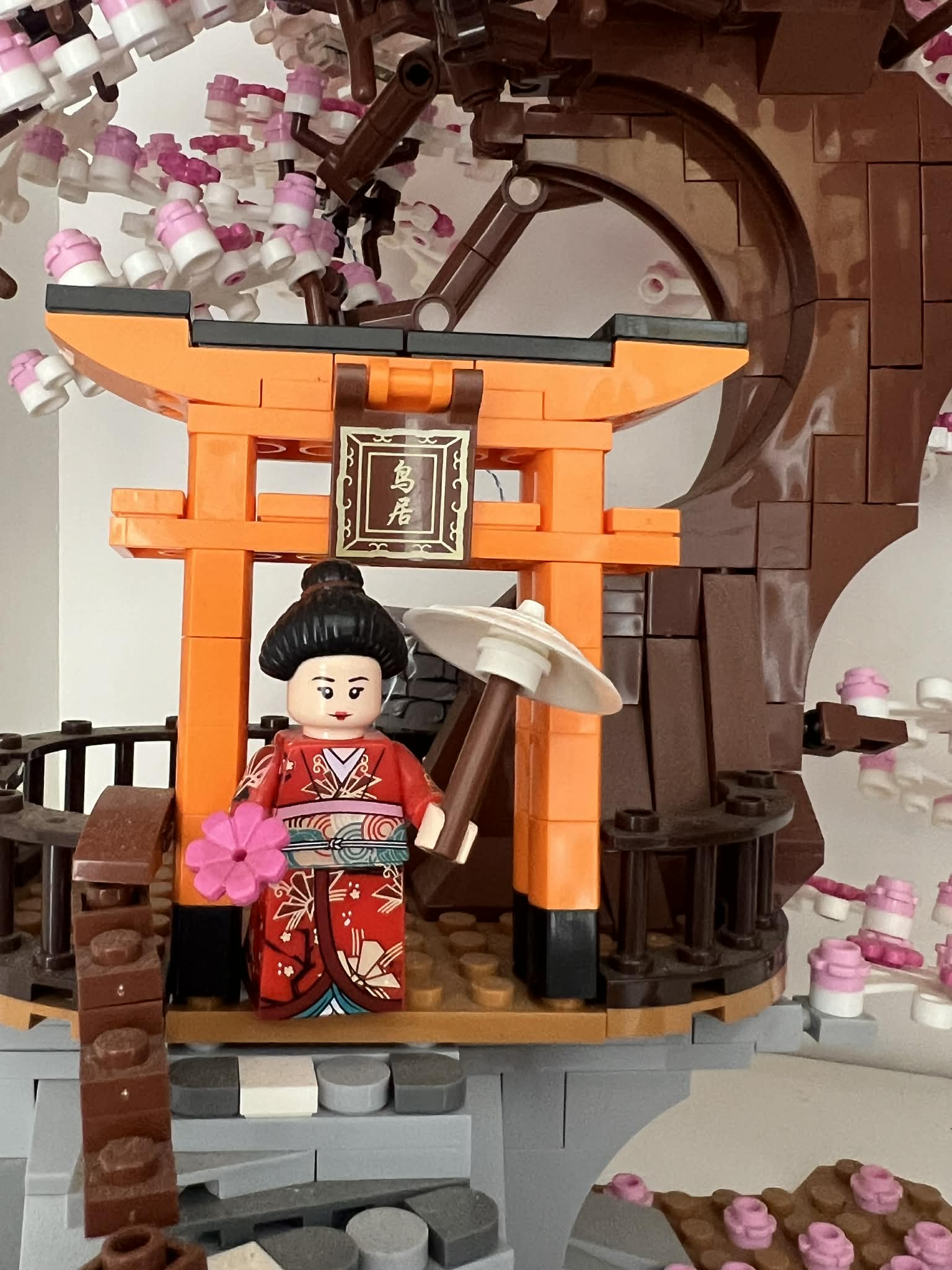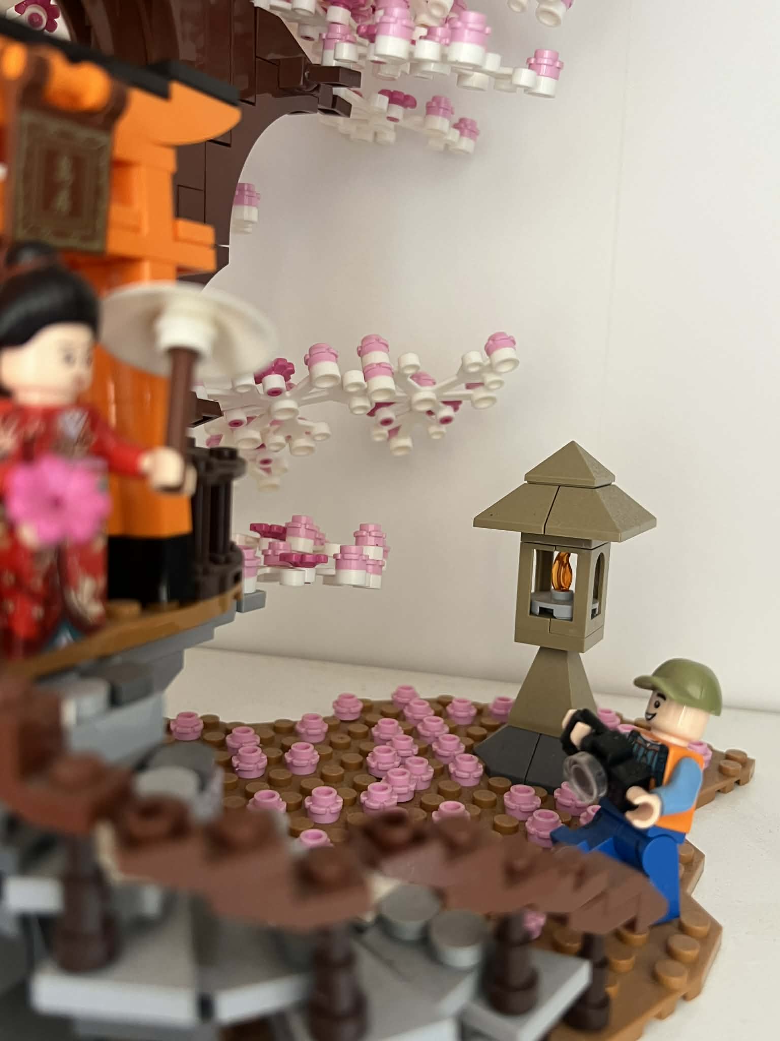 It has a large sakura tree, a torii gate with a geisha, petals scattered on the ground, a traditional lamp, and a photographer (I don’t need this one, haha).