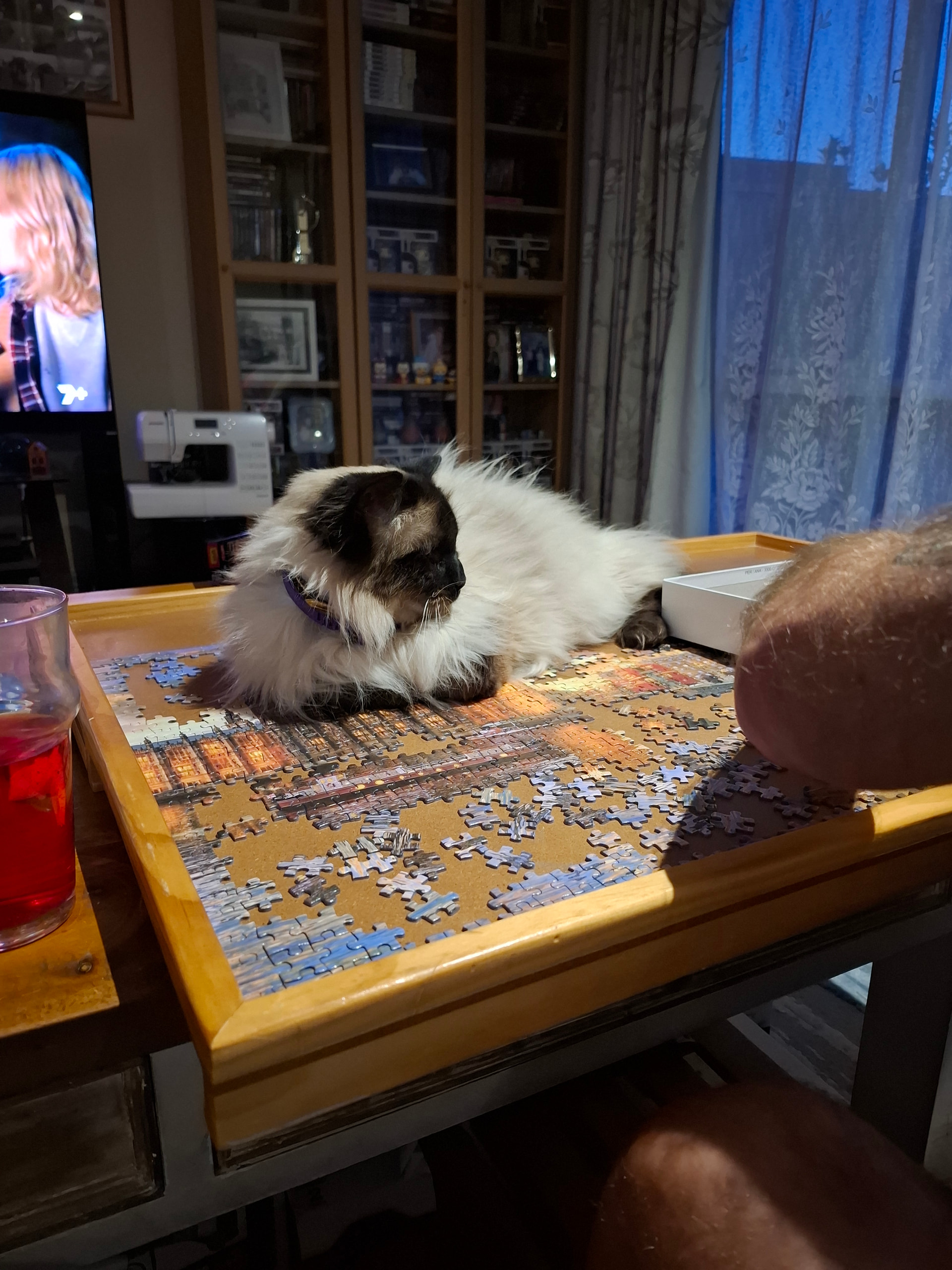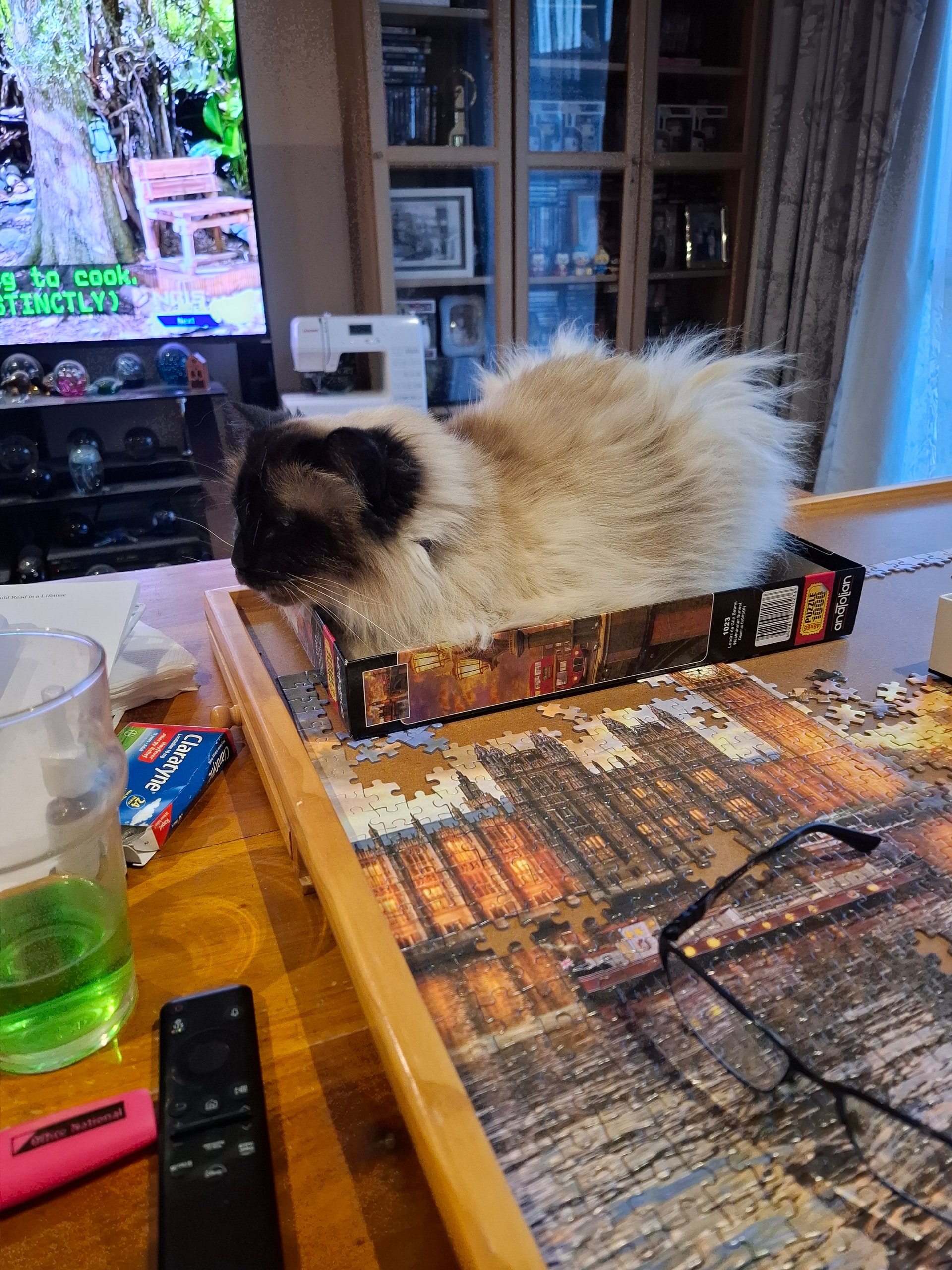 My cat is like that when I do jigsaw puzzles… he likes to sit on them or in the lid.