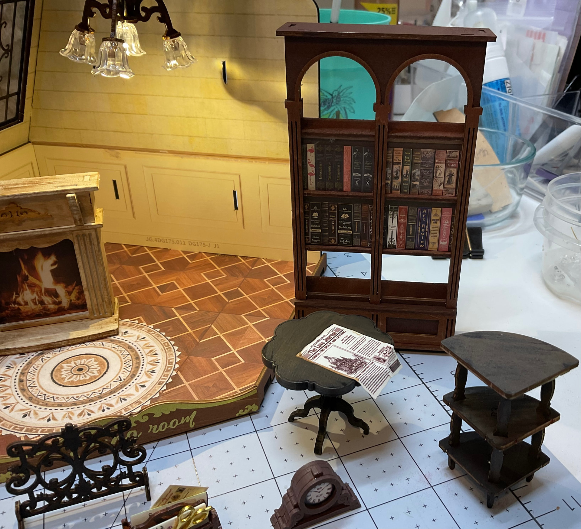 I included a few other things made. That rectangle above the books is a throw cover which goes on the couch. I did paint that from a black and white to a brown and beige.