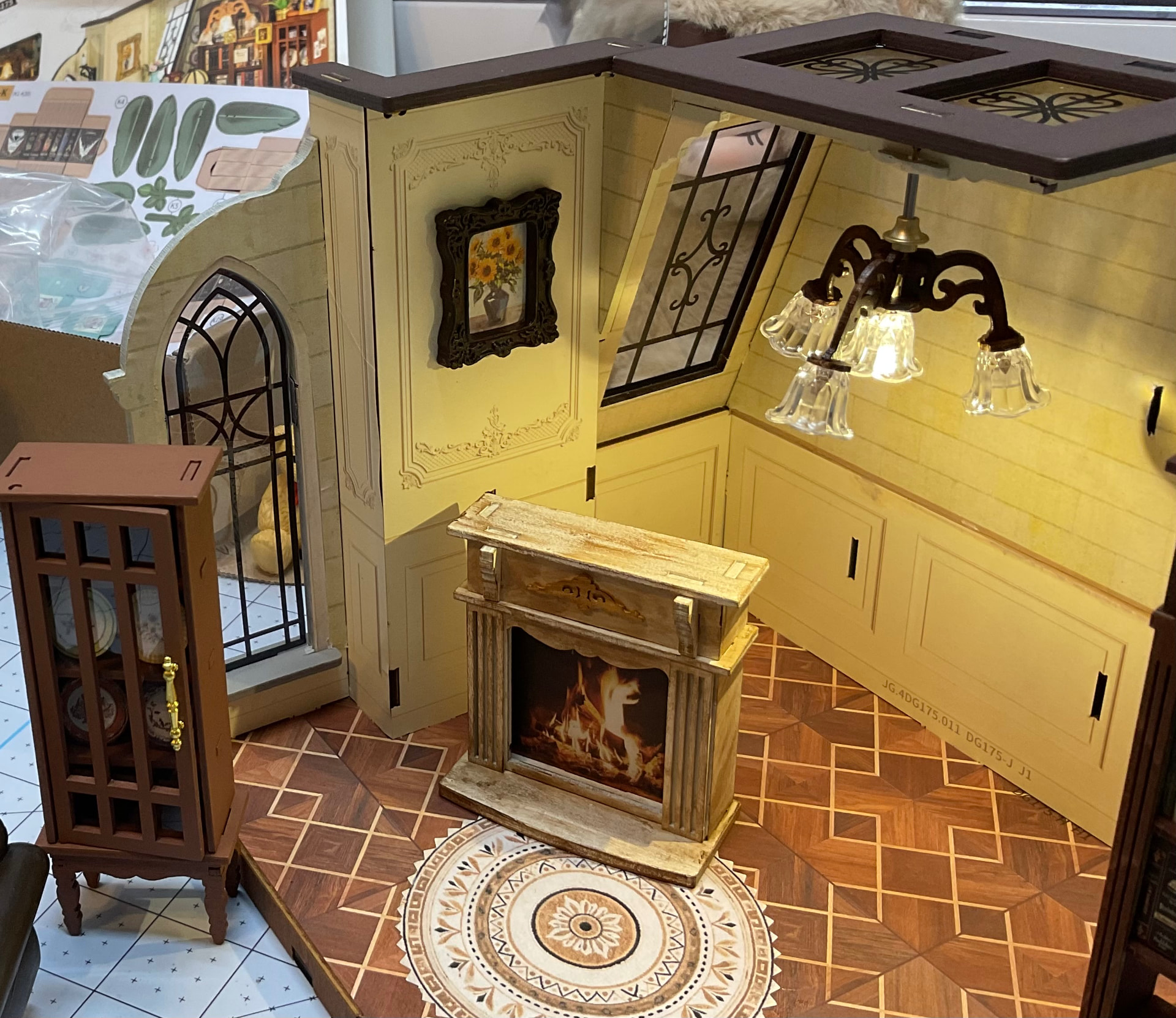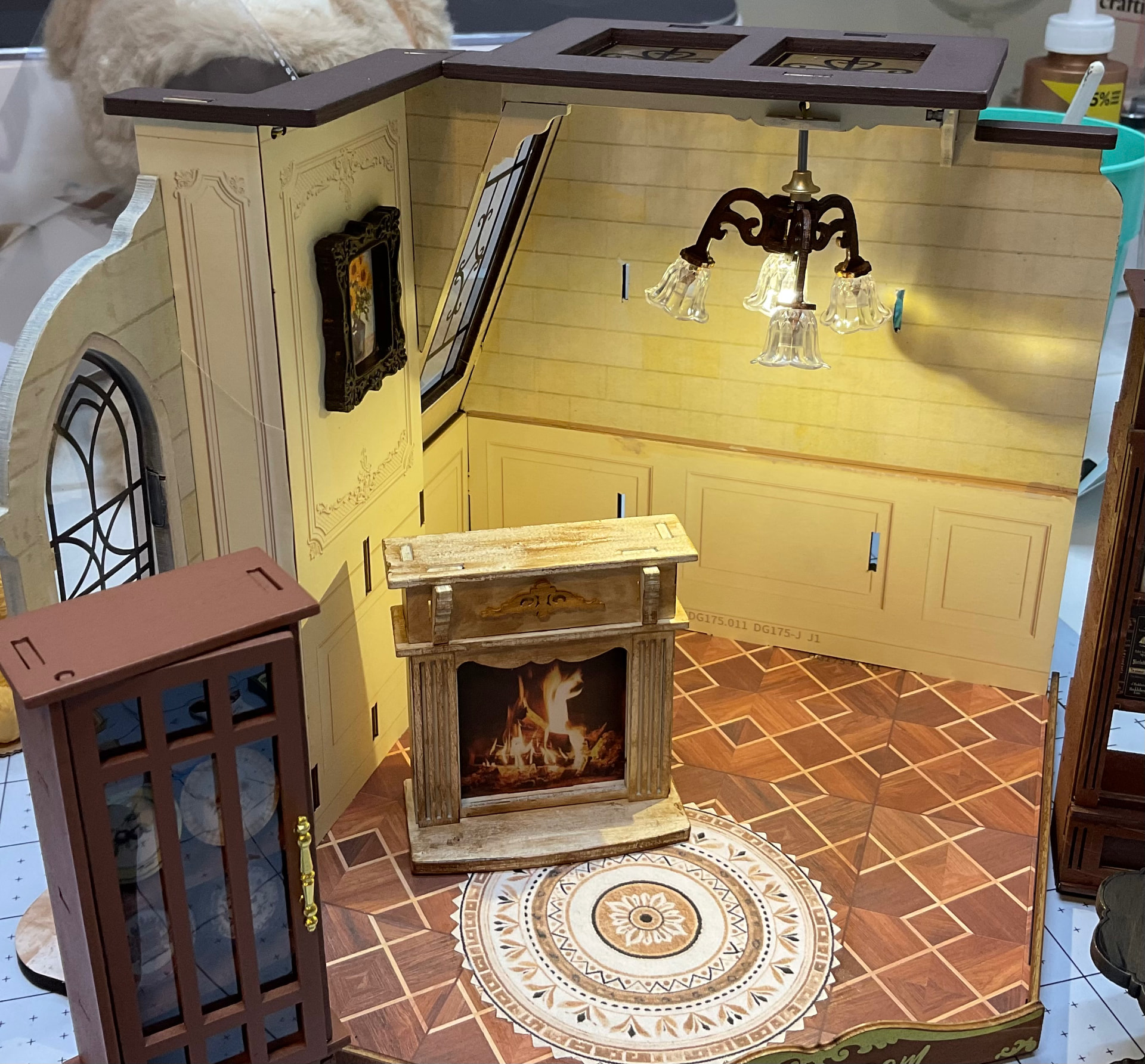 The fireplace was a very light cream and I painted that. The chandelier was gold and I painted that brown.