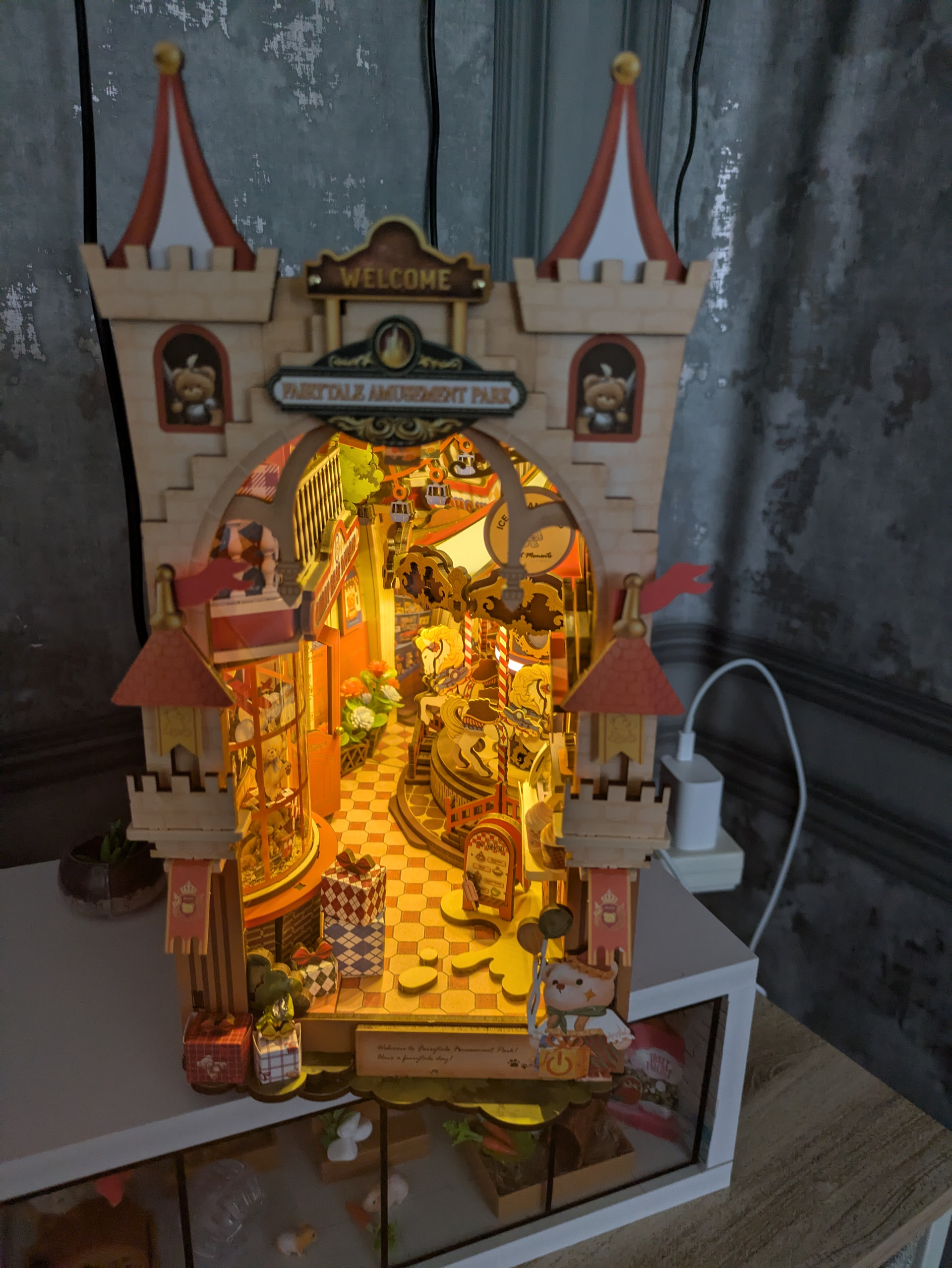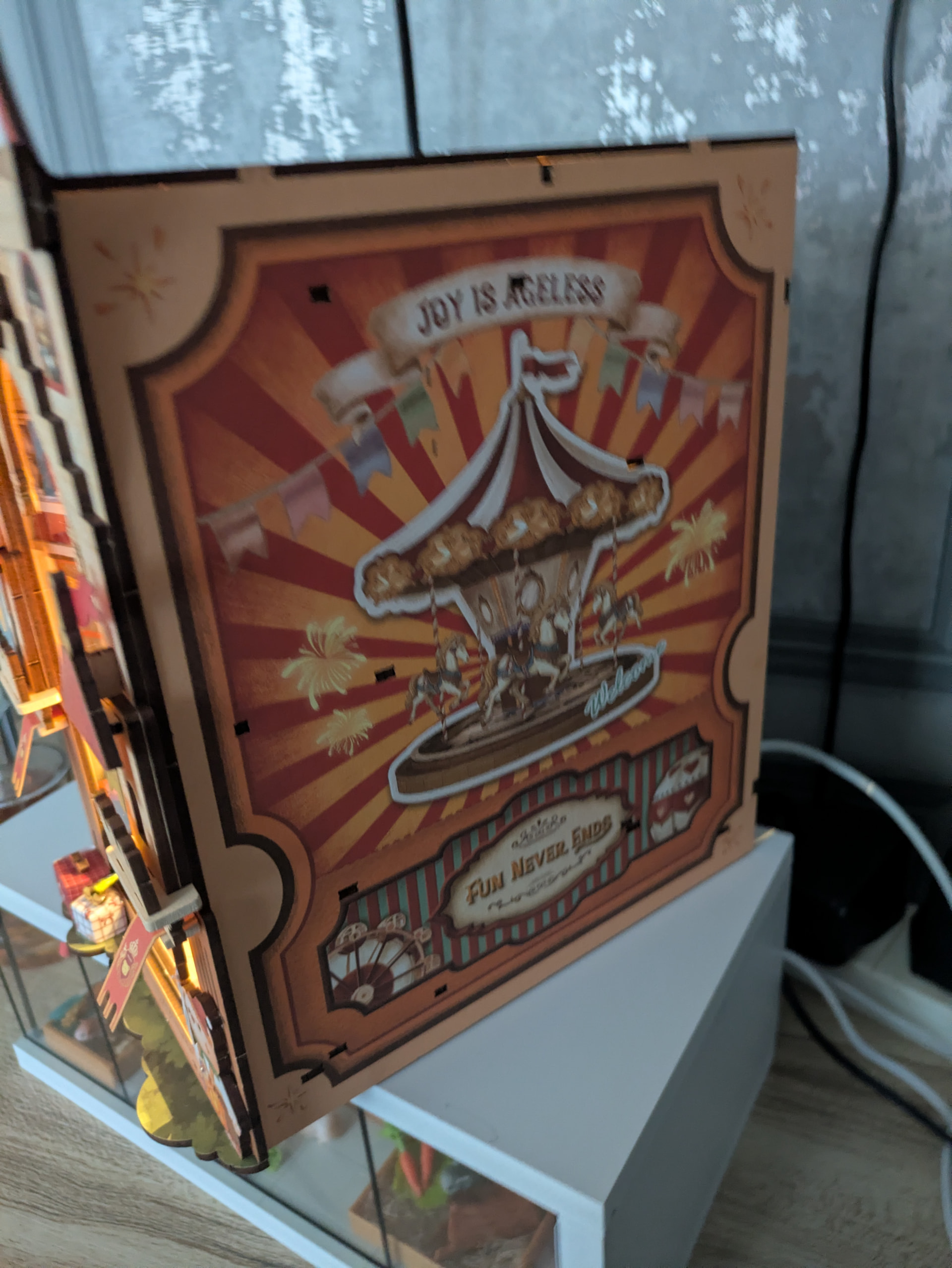 So i finished the Amusement park yesterday morning! My thumb is bruised definetly but worth it from how gorgeous this kit is! I recommend it to everyone who loves carnivals or Colourfull kits, i do hope robotime brings more of these out soon as i really enjoy it! Congrats Robotime for making such a good booknook, and one of my first and i also had to figure out how to wire up a kit which i failed at multiple times.