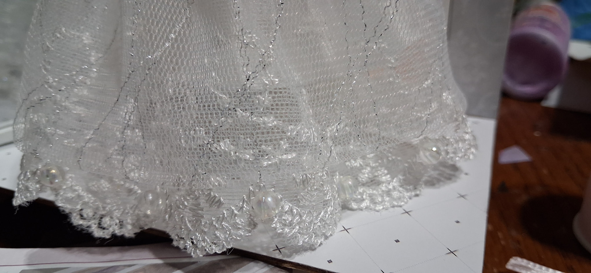 I did cut away the sheer fabric that was showing at the BOTTOM of the scallops on my dress…and I added the translucent beads to each scallop.