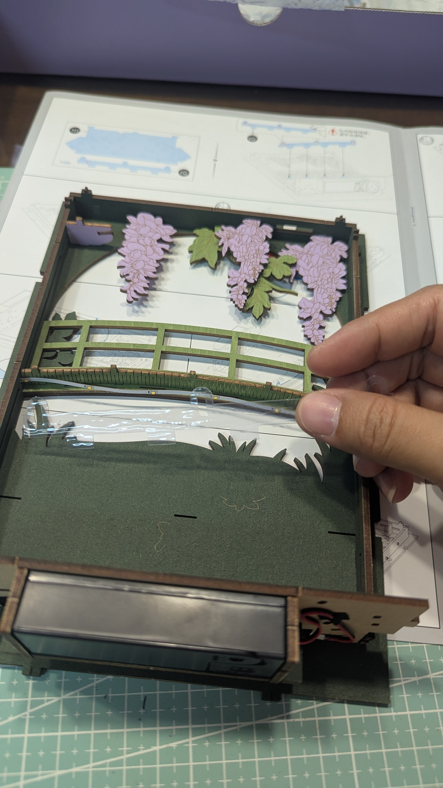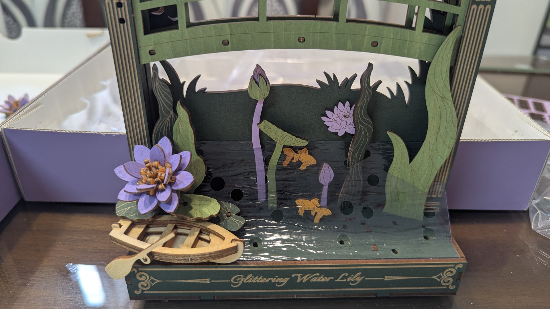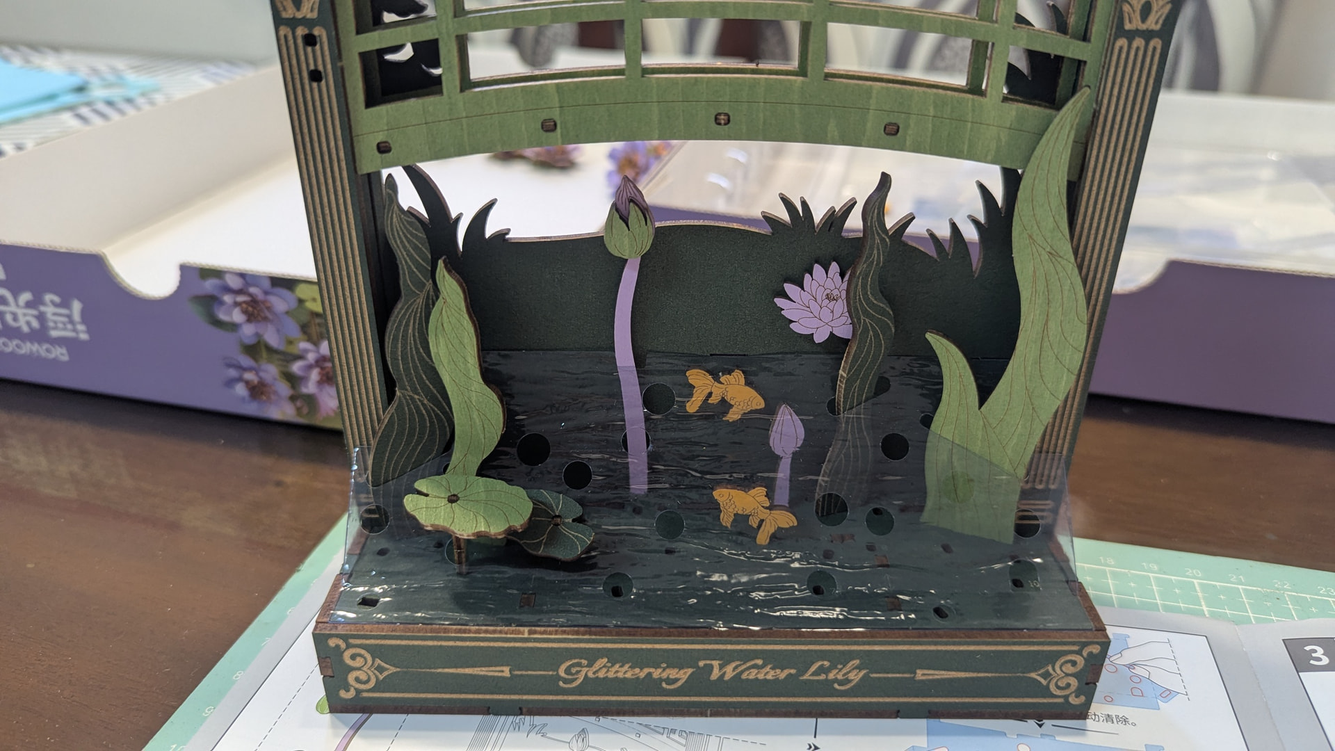 The same clear plastic material will be placed on the base to give the illusion that it’s a pond. Such a genius idea! Then I placed each lilies and pads one by one. The little boat is also so cute.