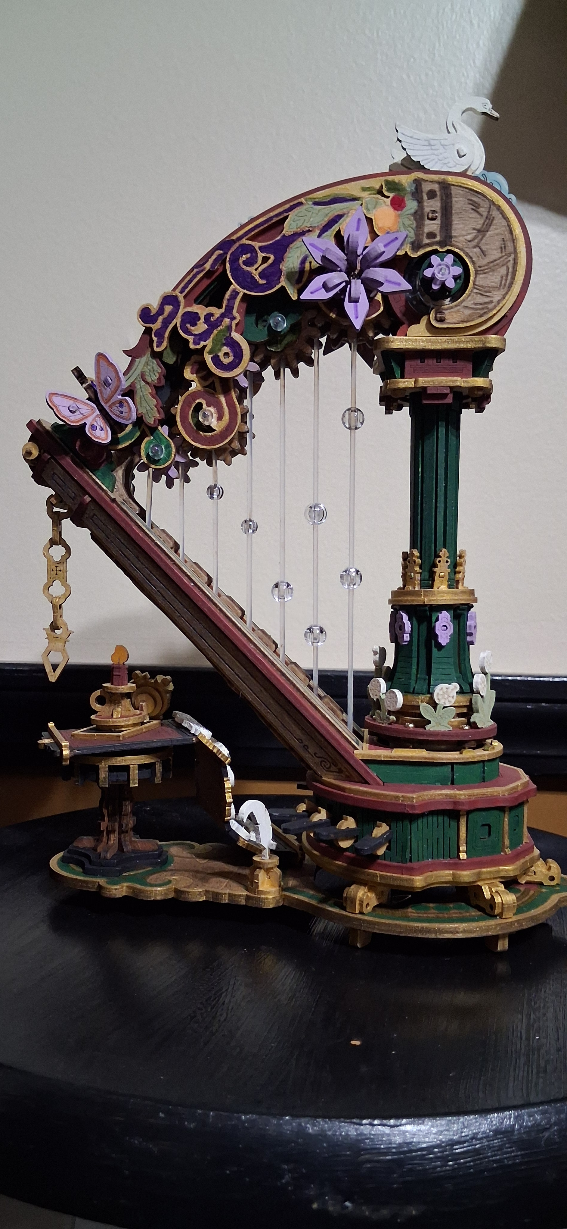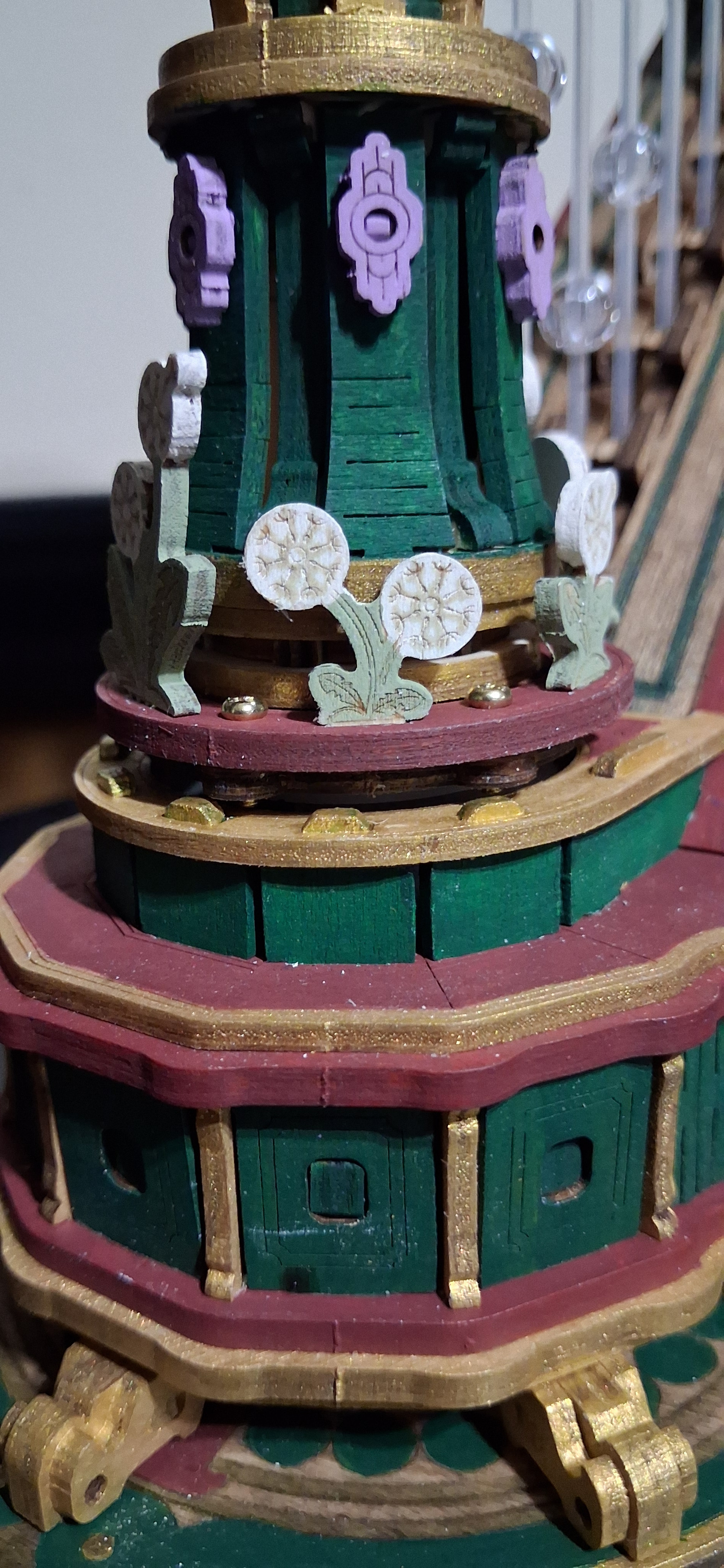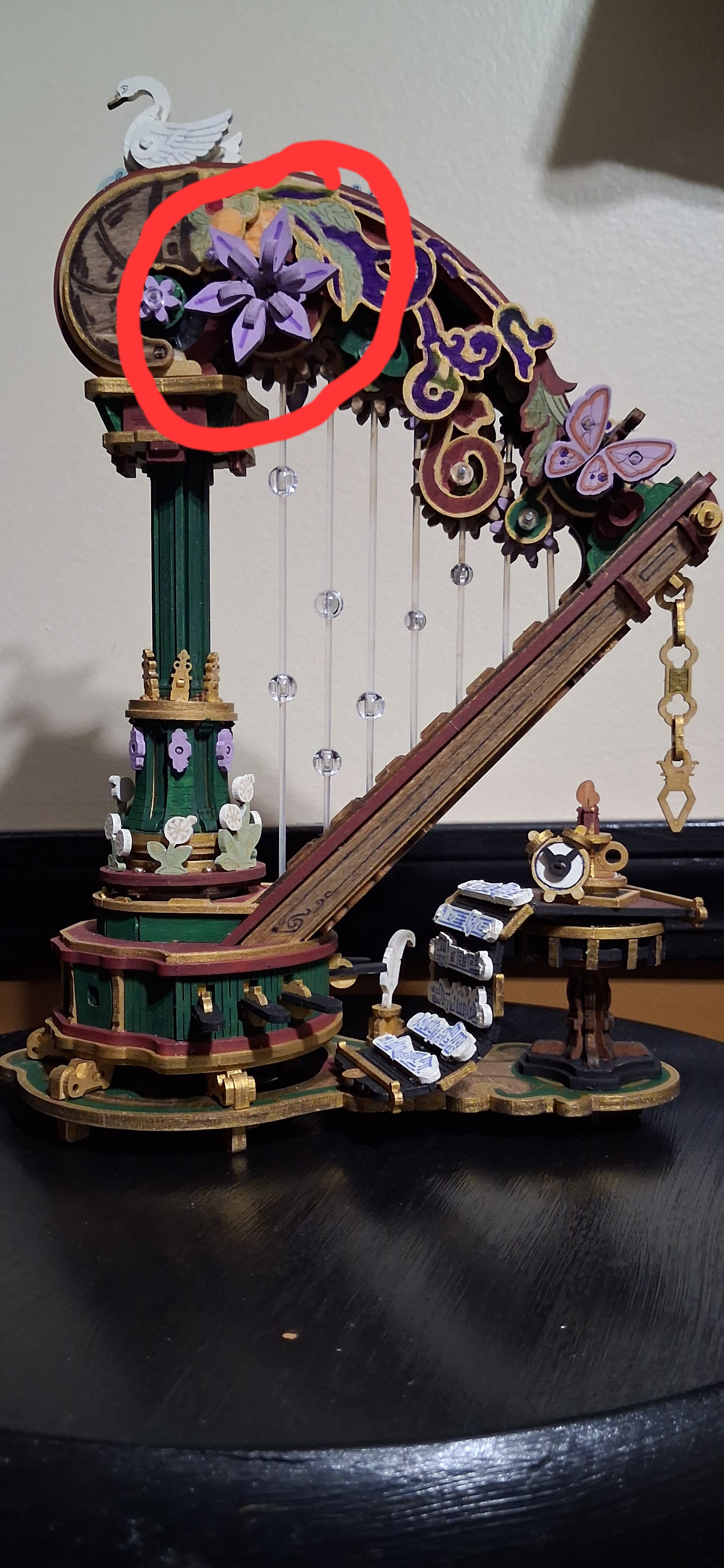 I have finally completed my magic harp.. well, sort of. I have completed all of the painting. It worked after I reinstalled the top and then after installing all of the stuff that comes after that, it’s not working again. The bottom carousel will spin with the music. The top column of the carousel is supposed to spin in the opposite direction. I can freely turn it in that direction but they won’t spin together on their own. That little red circle shows where that flower had become a bit loose during further assemblies but I did tighten it up again. I have a feeling that could be where the problem is. Not sure. I have absolutely no idea where the problem could be for the connection between that carousel and the other one. It seems as though one of them is off sync from the way it was put on or maybe something tweaked while I was adjusting other things. I’m not quite sure. I am hoping that @Robotime can offer some suggestion…or maybe @Lucia_Anderson