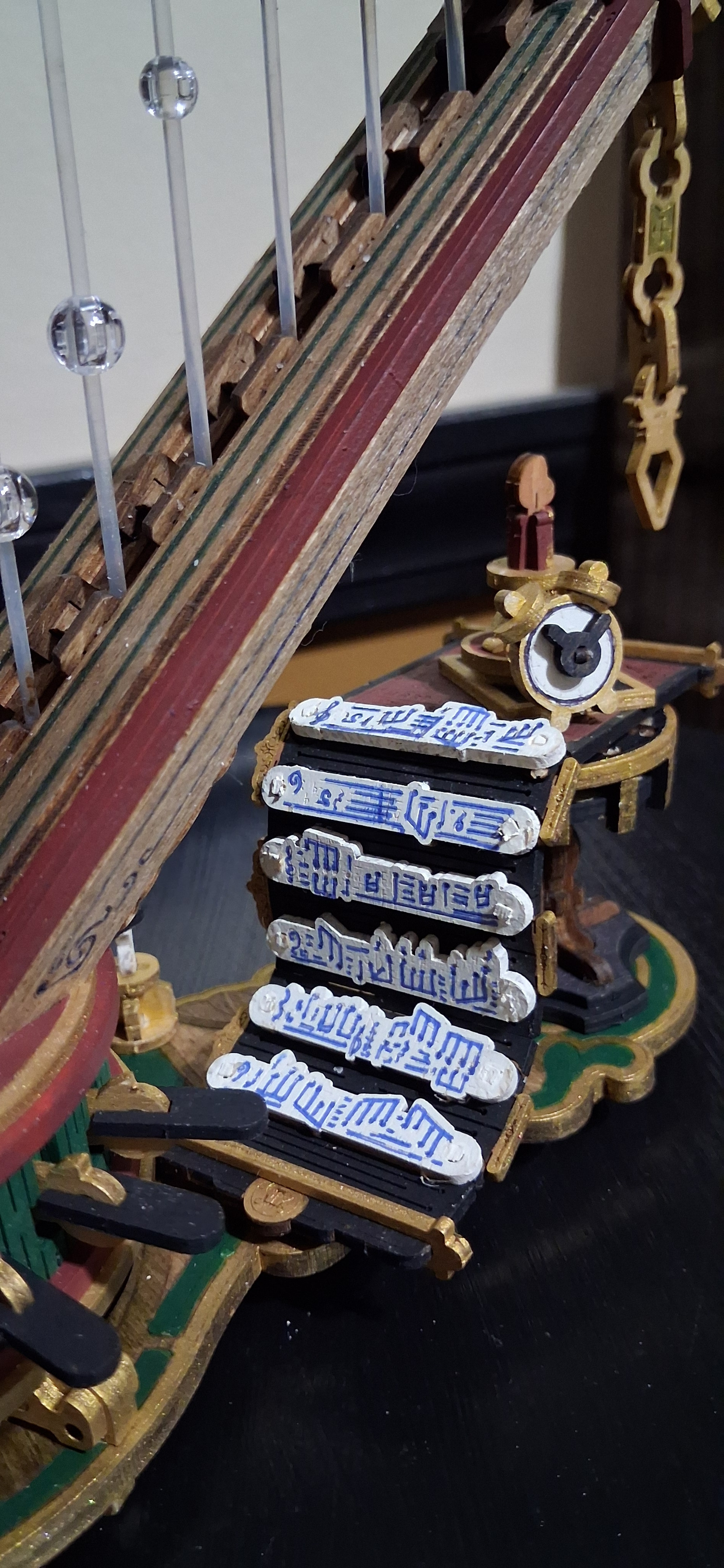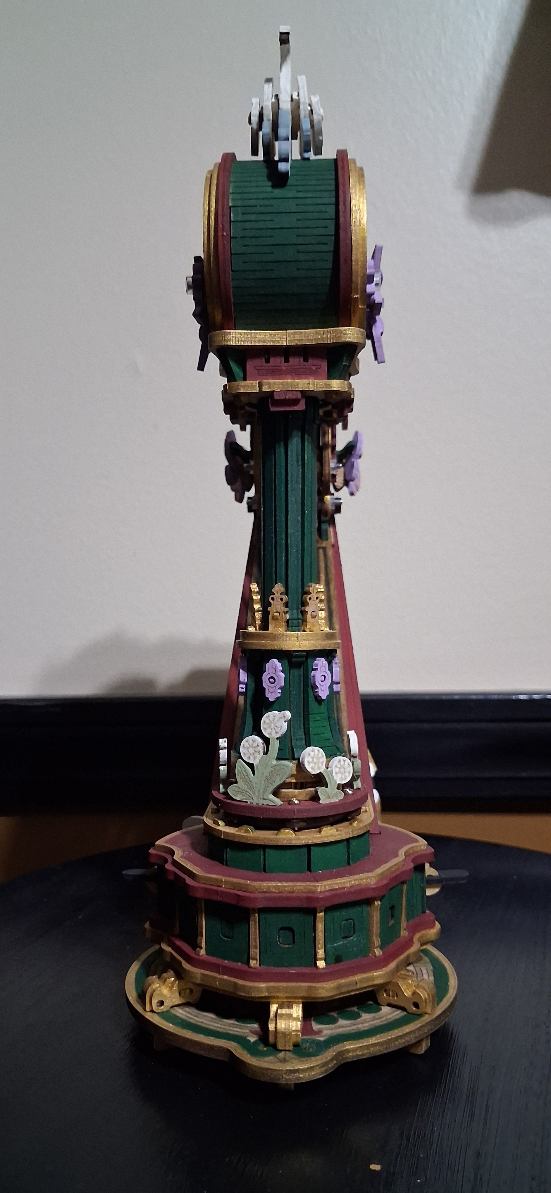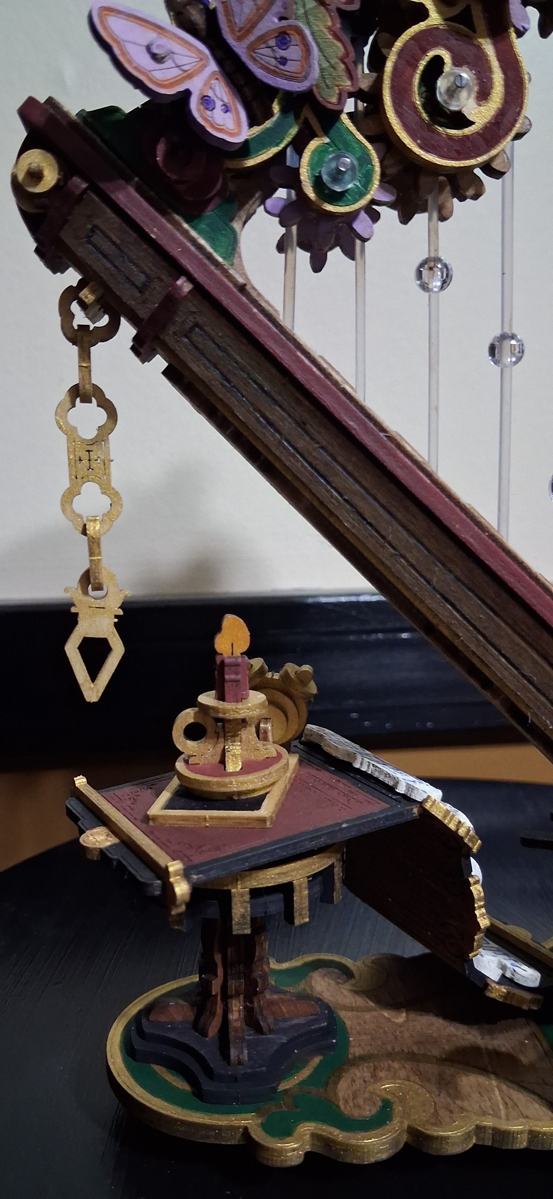 I have finally completed my magic harp.. well, sort of. I have completed all of the painting. It worked after I reinstalled the top and then after installing all of the stuff that comes after that, it’s not working again. The bottom carousel will spin with the music. The top column of the carousel is supposed to spin in the opposite direction. I can freely turn it in that direction but they won’t spin together on their own. That little red circle shows where that flower had become a bit loose during further assemblies but I did tighten it up again. I have a feeling that could be where the problem is. Not sure. I have absolutely no idea where the problem could be for the connection between that carousel and the other one. It seems as though one of them is off sync from the way it was put on or maybe something tweaked while I was adjusting other things. I’m not quite sure. I am hoping that @Robotime can offer some suggestion…or maybe @Lucia_Anderson