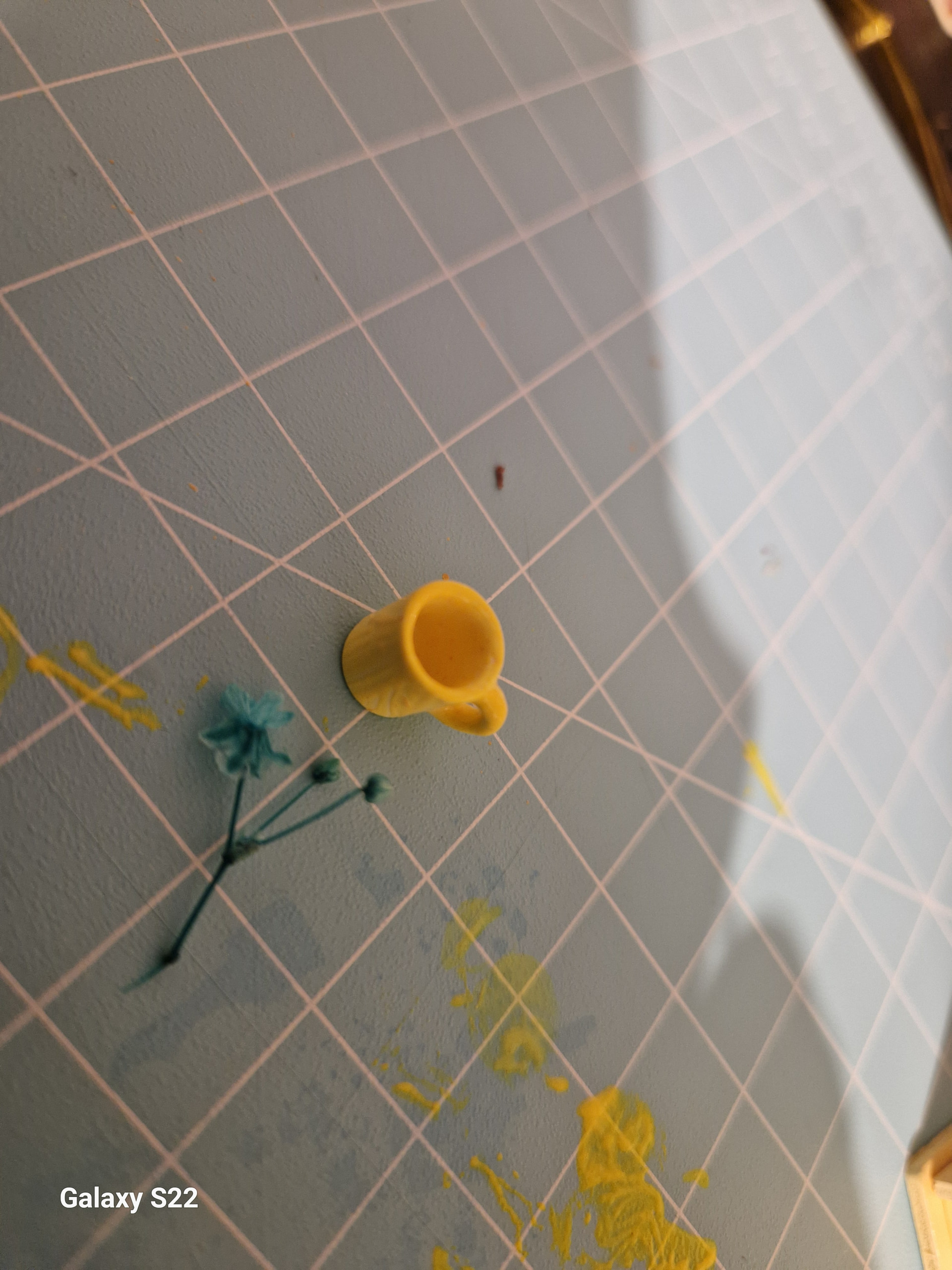 also im painting the little cup yellow for the cabinet and adding a tiny blue flower onto it !