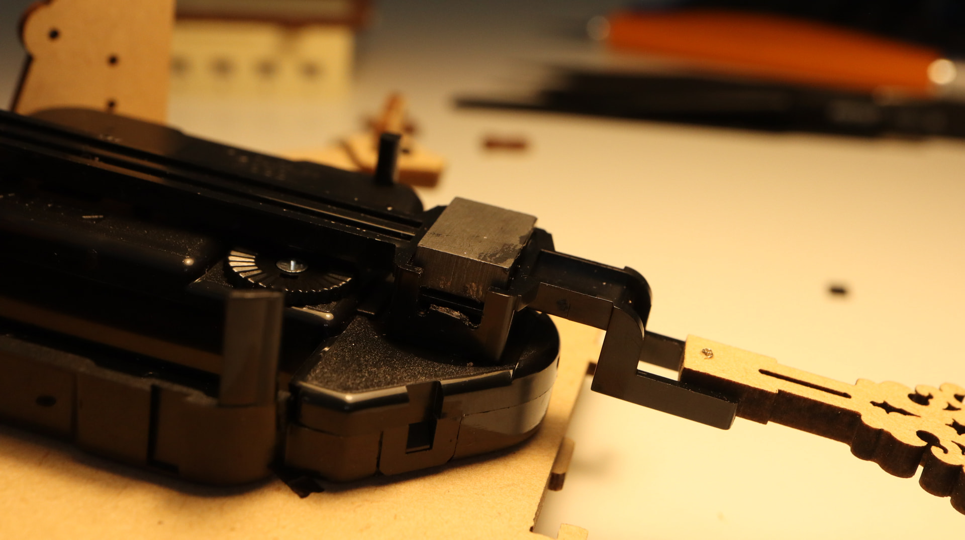 Hi, in my build i needed a new battery box and clock as the clock wouldnt work. Rokr was good and sent the parts which arrived yesterday. I went back to building and I also found that the pendulum arm was swinging way to far each direction. It would seem to gain momentum and hit both the right and left stops making obvious noise. I followed this thread and clipped out the stops. This however allowed the arm to swing to the point of hitting the right wall (if looking from the front). I adjusted the clock position which it had a bit of give to rotate it ccw despite being screwed in which allowed the arm to not hit the wall and the noise was greatly quited. The remaining noise seems to be from the axis of the arm which has stops in the circular axis. In looking at it closely I will end up putting a thin bumper up at the axis of the arm so that it will slow the motion. My initial attempt is just a tiny folded piece of paper on one side of the axis. This immediately slowed the motion and shortened the travel of the arm. The remaining noise from the axis was eliminated. Seems like the clock piece gains too much momentum.