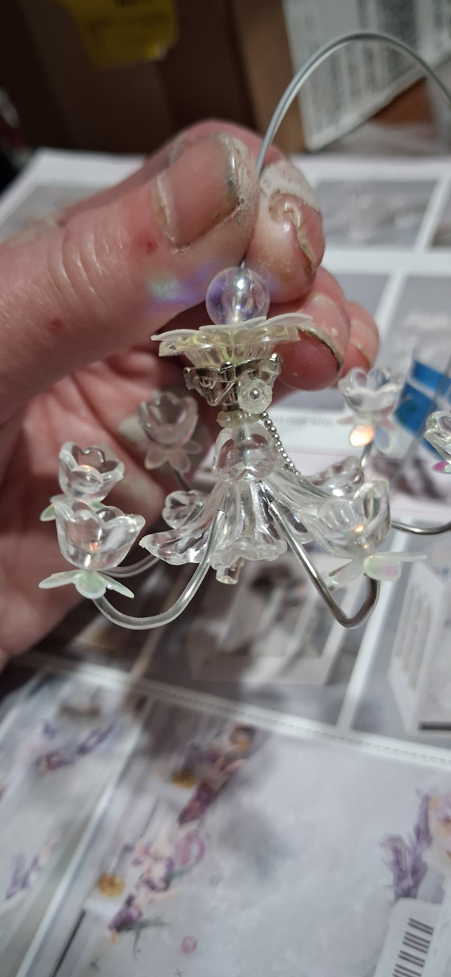 Well, since I am only working next door I got a few things finished on my lunch break. My dress is completed and I have done the first step of adding stuff on my Chandelier. It has these really cool iridescent flowers on it that make it look like opal does. You can tell better on the picture taken from above it. On a good note, I have finished cutting about half of my lotuses, so I guess this evening I will be working on some flowers.. Maybe