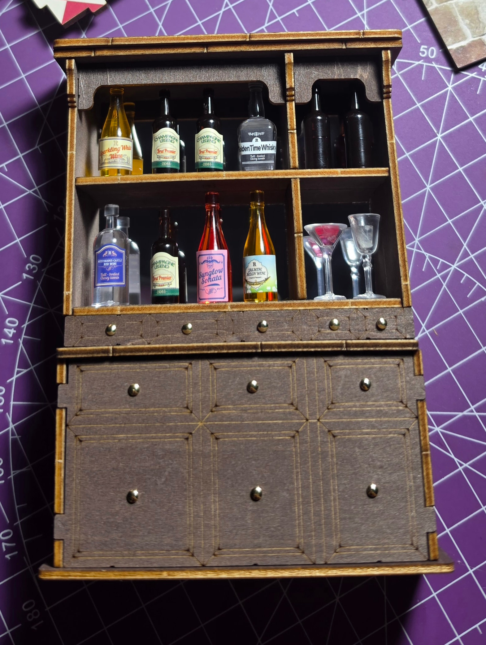 For Day 2, I made really good progress and I’m so happy with how the Cheers Bar & Dining is turning out. My current favorite is the bar cabinet. The labeled bottles look incredibly cute and realistic. It even has a mirror at the back to make the bottle display stand out more.