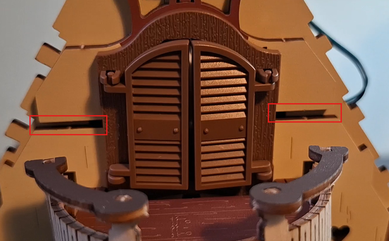 In this second video we can see that there is a small gap between piece G6 (the part that supports the clock) and piece G13 (which supports the upper roof.