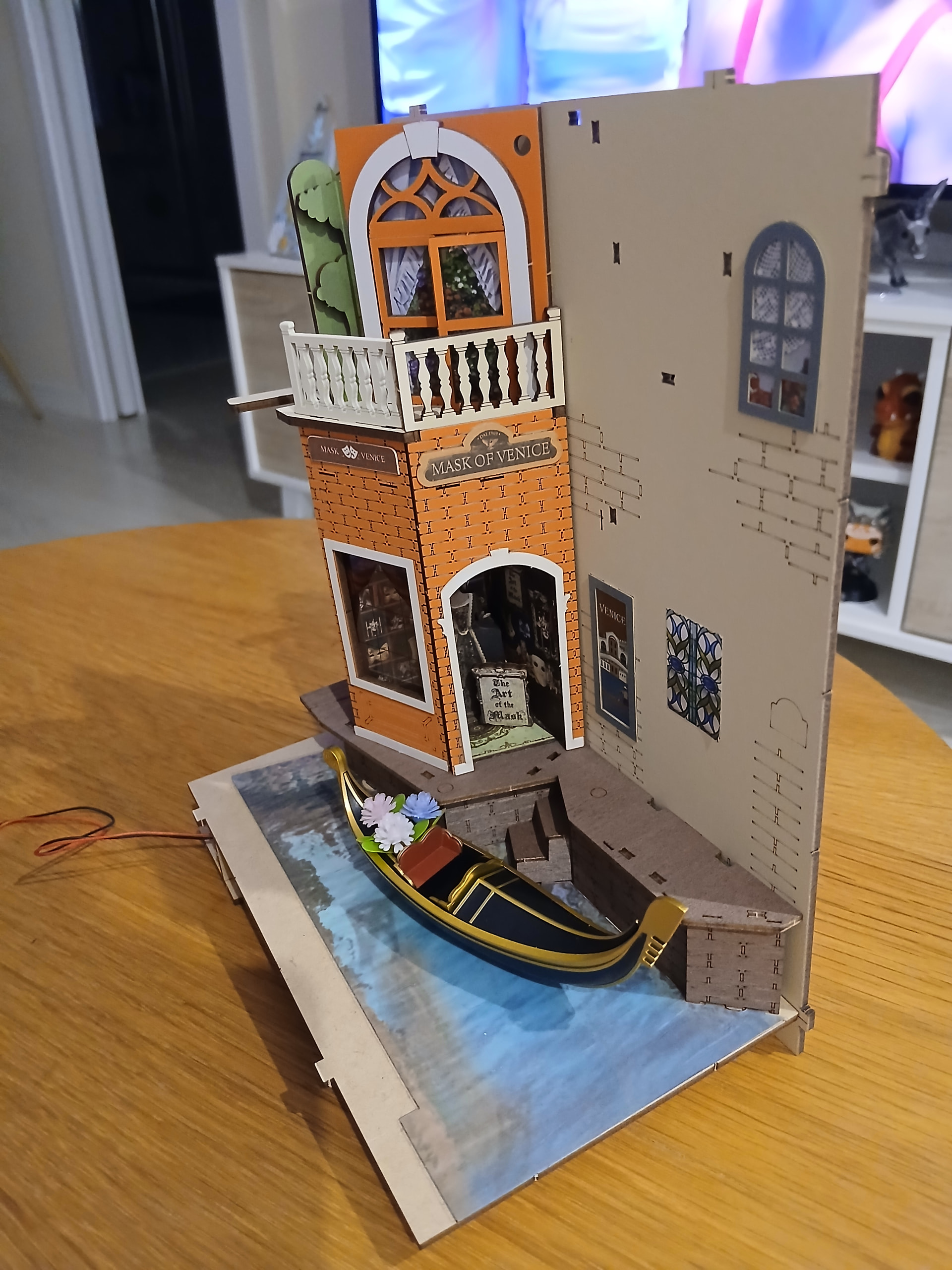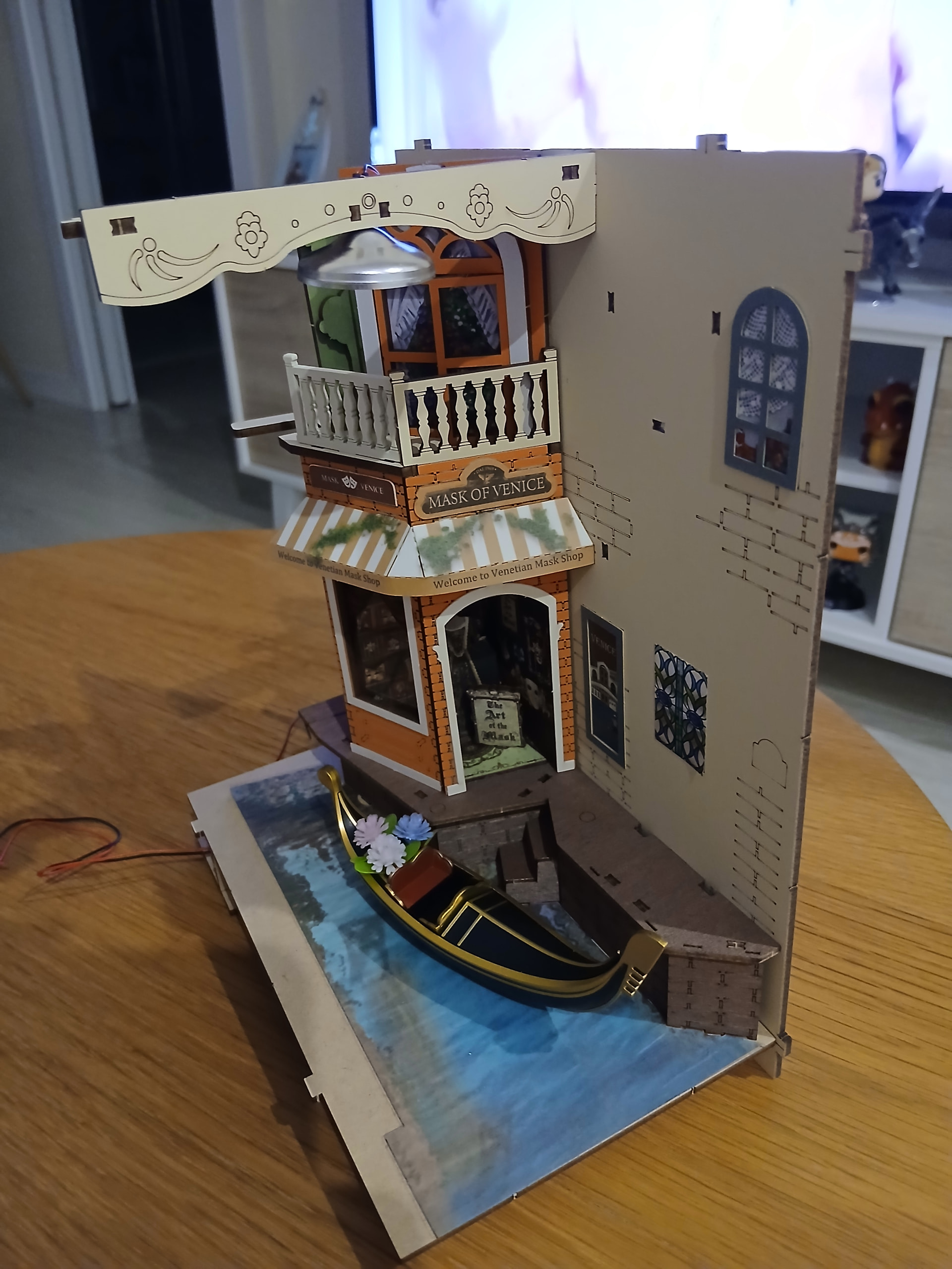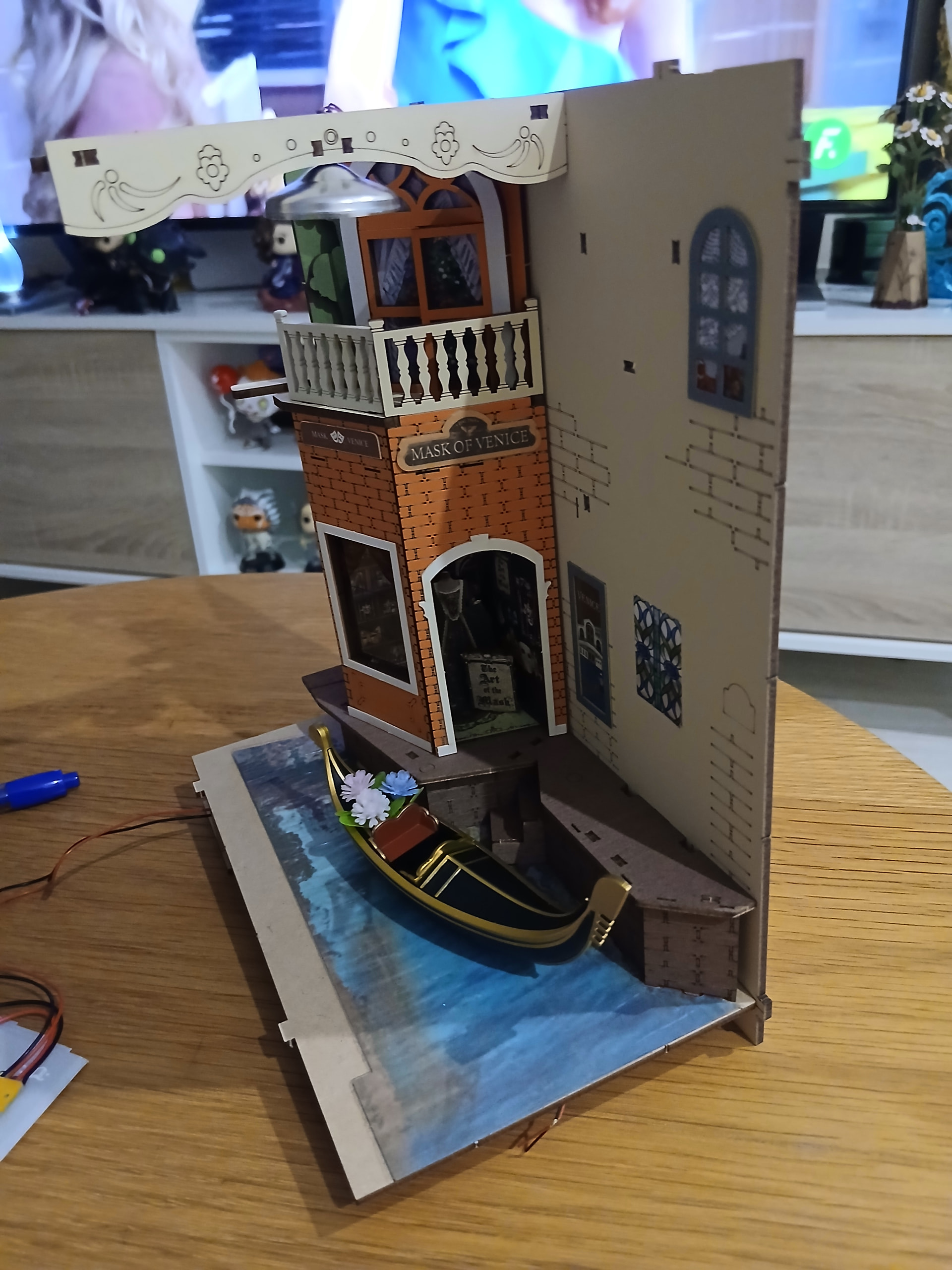 But no, it seems like we’re adding the main light of this Book Nook! It’s not complicated to put together, although those tiny wire-holders were particularly tricky to fit, mainly because of the position of the other parts and the fact that you need to keep those wires in between. It took some time! But it wasn’t impossible. I wasn’t able to 100% fit them through the holes though…