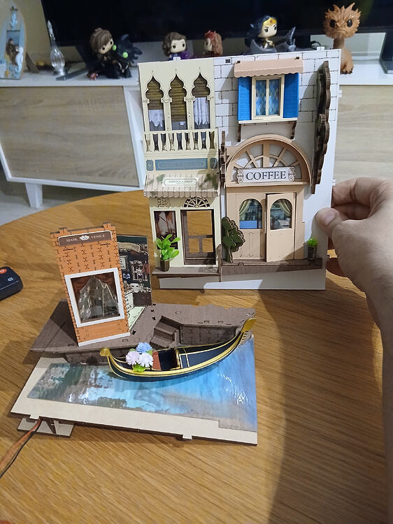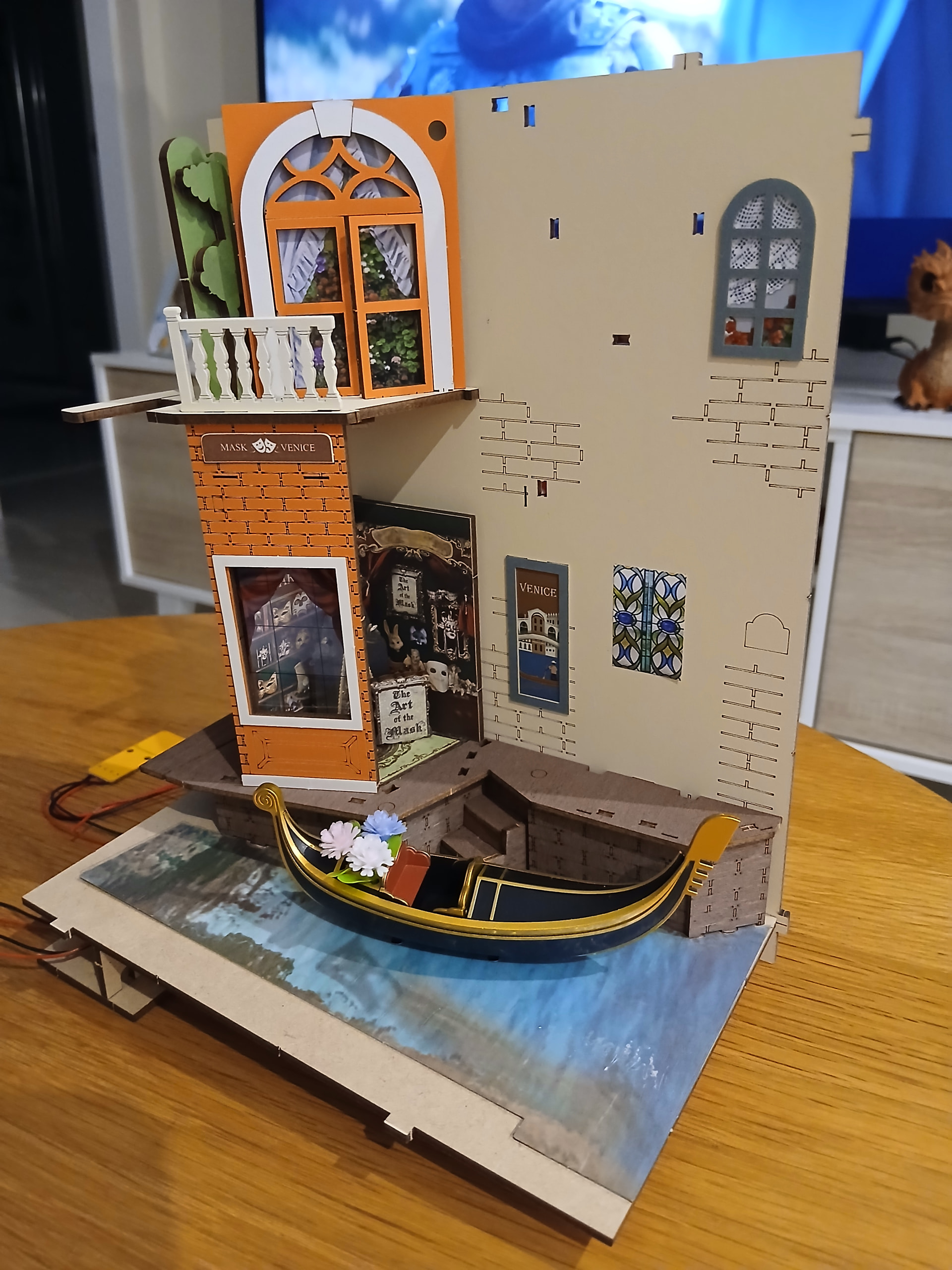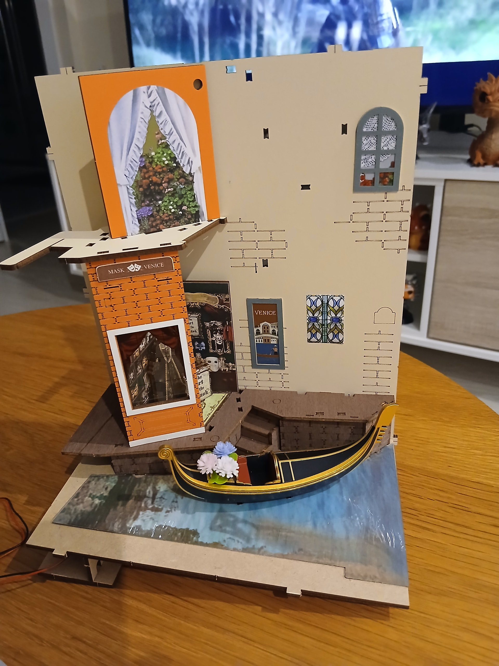 But no, it seems like we’re adding the main light of this Book Nook! It’s not complicated to put together, although those tiny wire-holders were particularly tricky to fit, mainly because of the position of the other parts and the fact that you need to keep those wires in between. It took some time! But it wasn’t impossible. I wasn’t able to 100% fit them through the holes though…