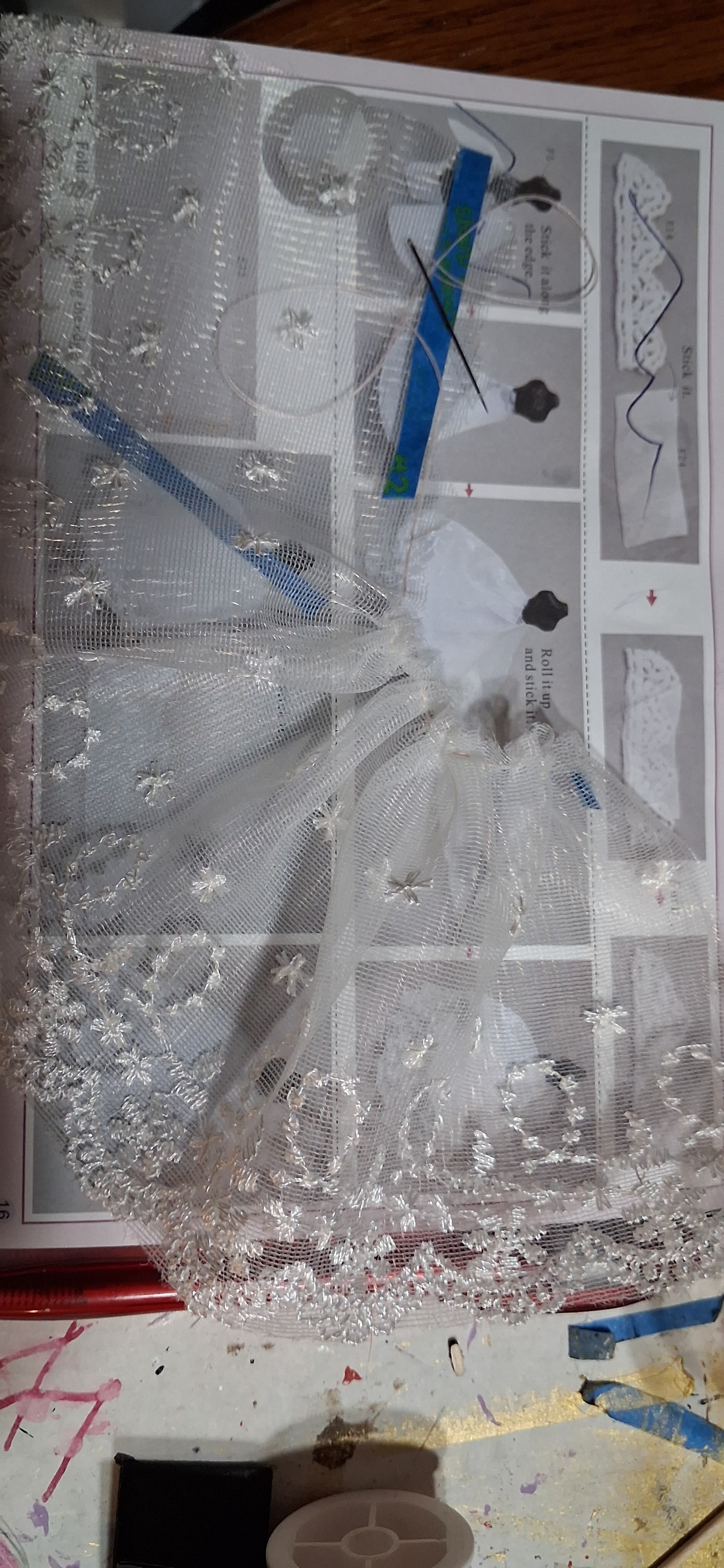 This tiny little waist is going to get a bit thicker. On another note, the white glossy “paper” that I thought I was missing in a previous post is actually the satin fabric. . I opted to use some extra lavender crepe paper that I used for the backing so that is how it will be.