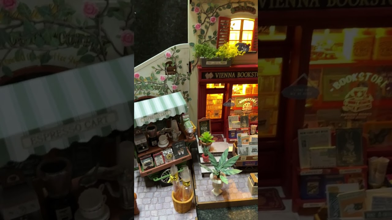 The coffee cart is gently parked next to the bookstore. Everything blends together to create a scene that is both cozy and romantic—like a gentle story about a slow-paced life, where one can stop, enjoy a cup of coffee, and get lost in the world of books.