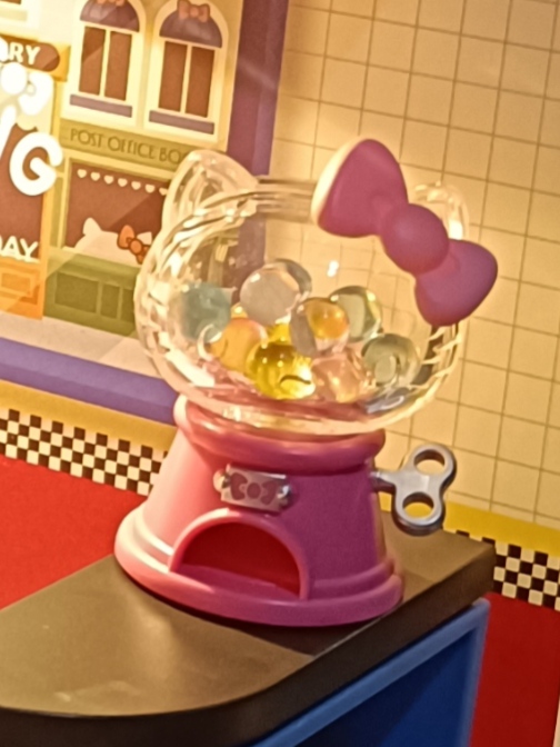 I don’t have a better picture yet but this tiny gumball machine works for real. When you turn the knob, one of the mini gumballs will fall and roll out. It’s so cute!!