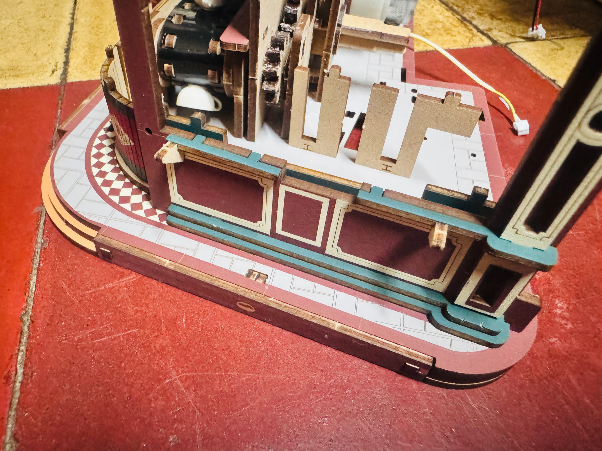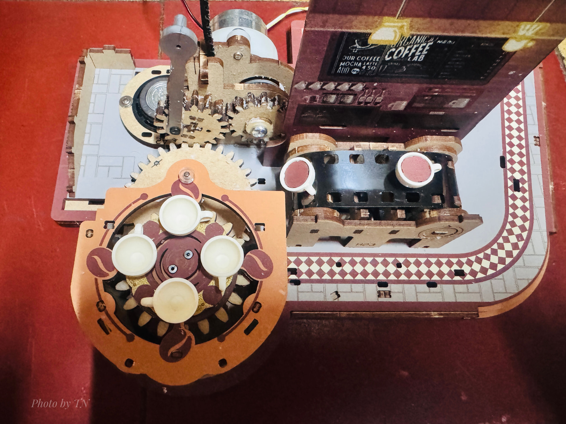 The coffee, once brewed, will be served. The serving table is also a moving part, so the swivel joints must be perfectly aligned to ensure smooth movement.