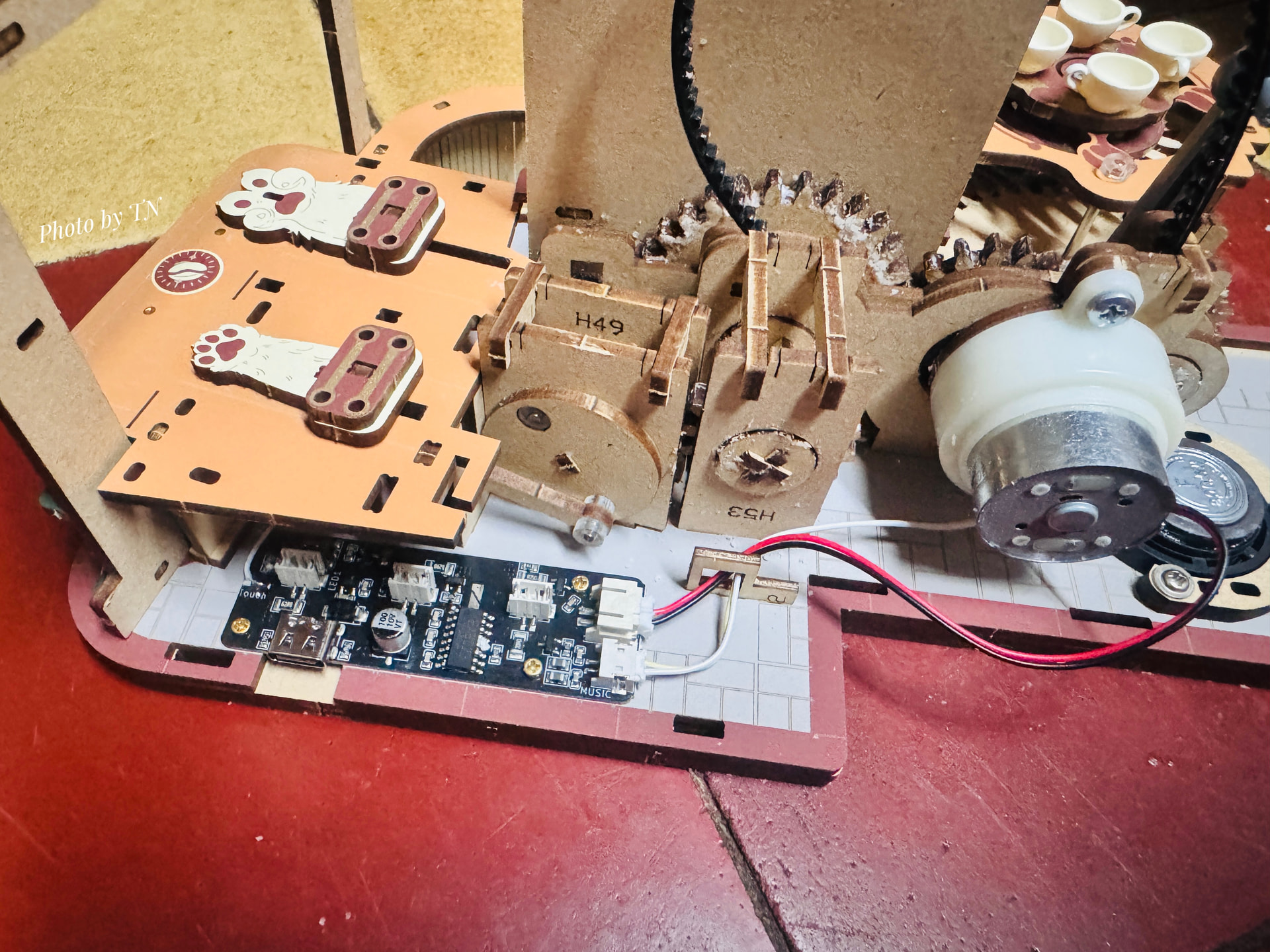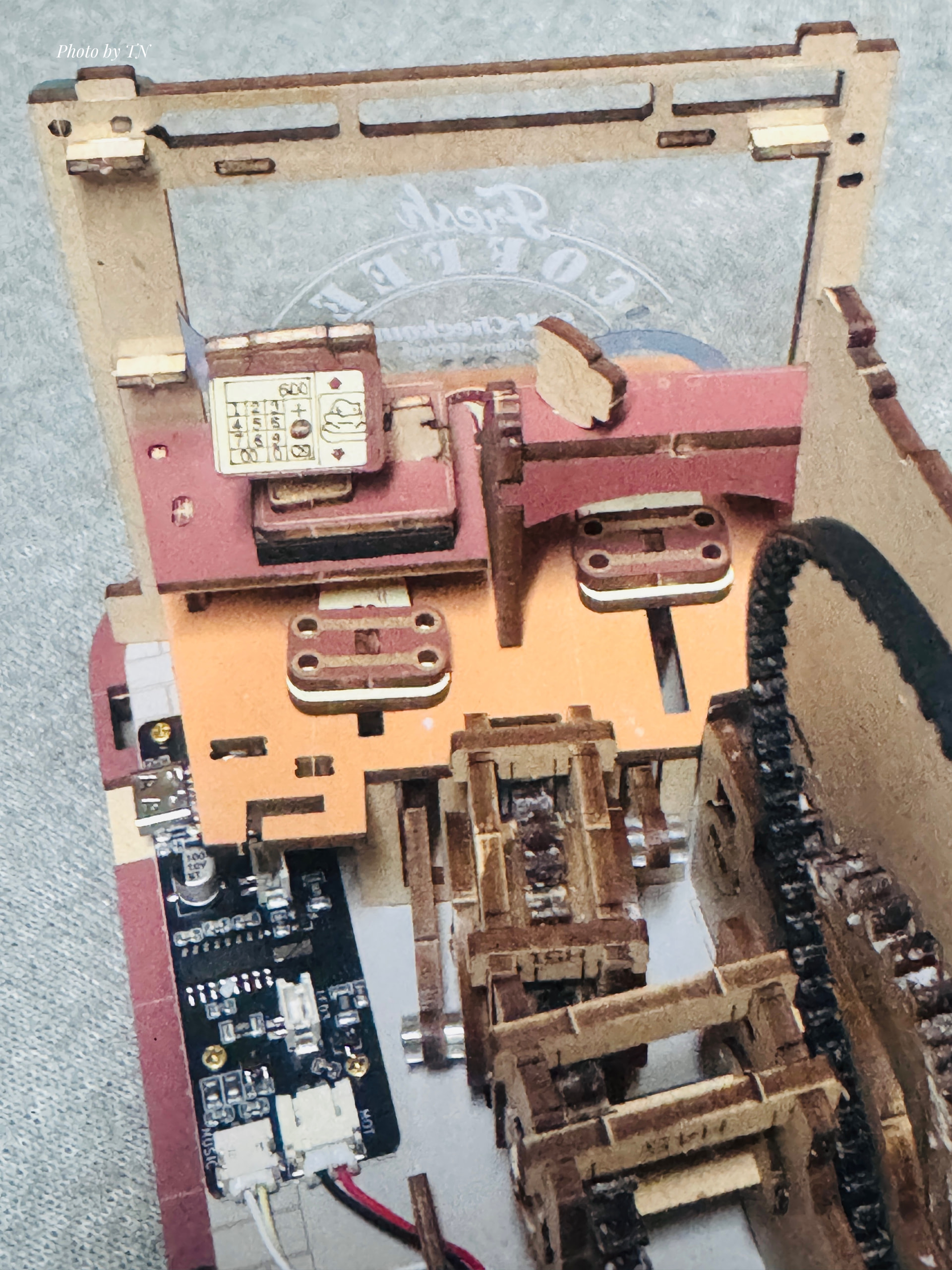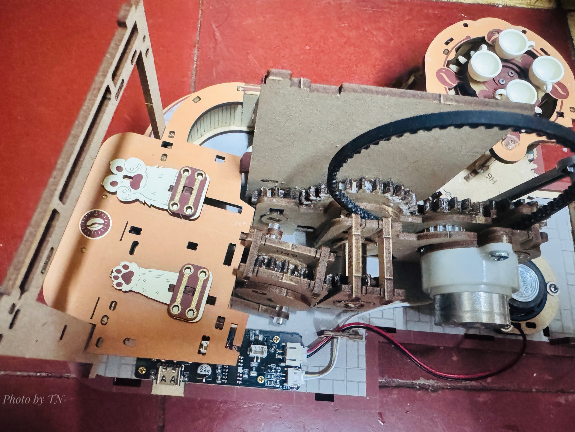 Today I’ll be continuing with the coffee conveyor belt. The conveyor belt is made of plastic, so I have to be very careful when attaching it to avoid tearing it. We can’t replace it, so any mistake will ruin everything. Next is the waxing process; if it’s not done carefully, it will get snagged. Luckily, everything went smoothly.