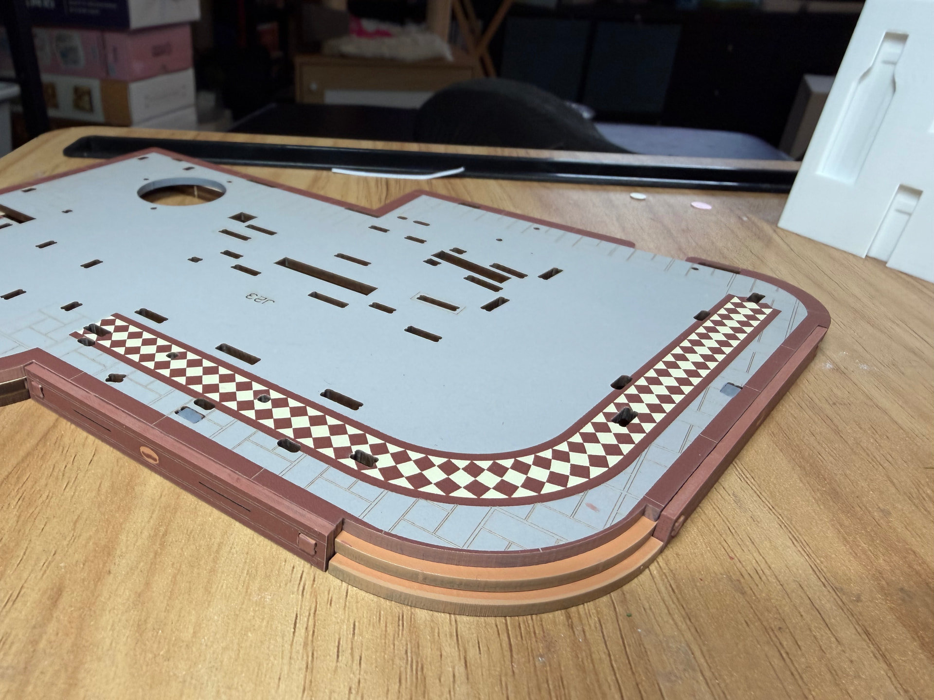 Organizing boards alphabetically with a tablet stand in the back of the box to keep them upright and easy to flip through. First piece (floorboard) started—can’t wait to see this come together!