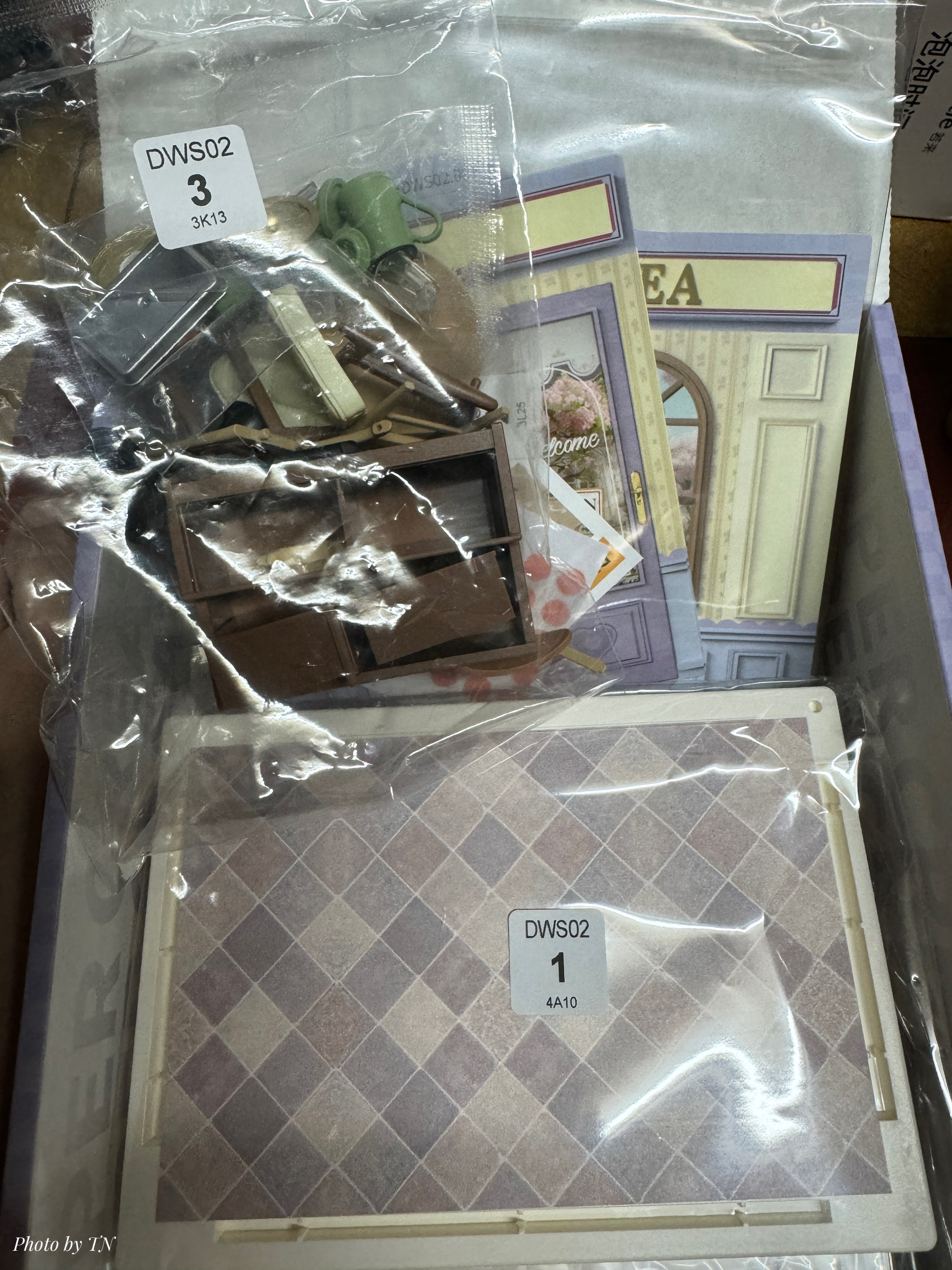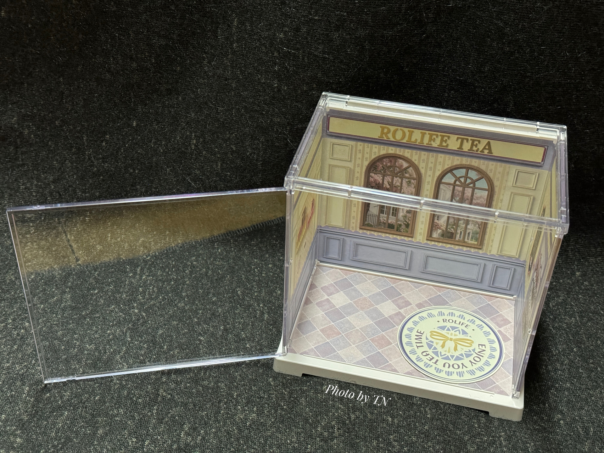 The back wall features an elaborately decorated display cabinet filled with pastries, tea boxes, and other boxes. Large windows framed in soft hues allow natural light to flood the shop. The tiled floor and wall art complete the cozy, classic atmosphere.