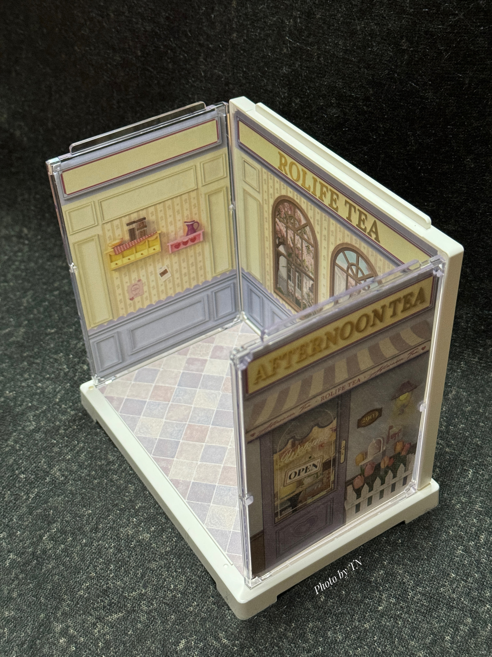 Inside, the cozy space feels warm and inviting. A small, round wooden table sits in the center, adorned with delicate white teacups and saucers. A pale blue teapot with a floral pattern is the focal point, accompanied by a slice of cake on a pastel-colored plate. A small fork beside it adds to the authentic feel, as if someone has just stopped by for afternoon tea.