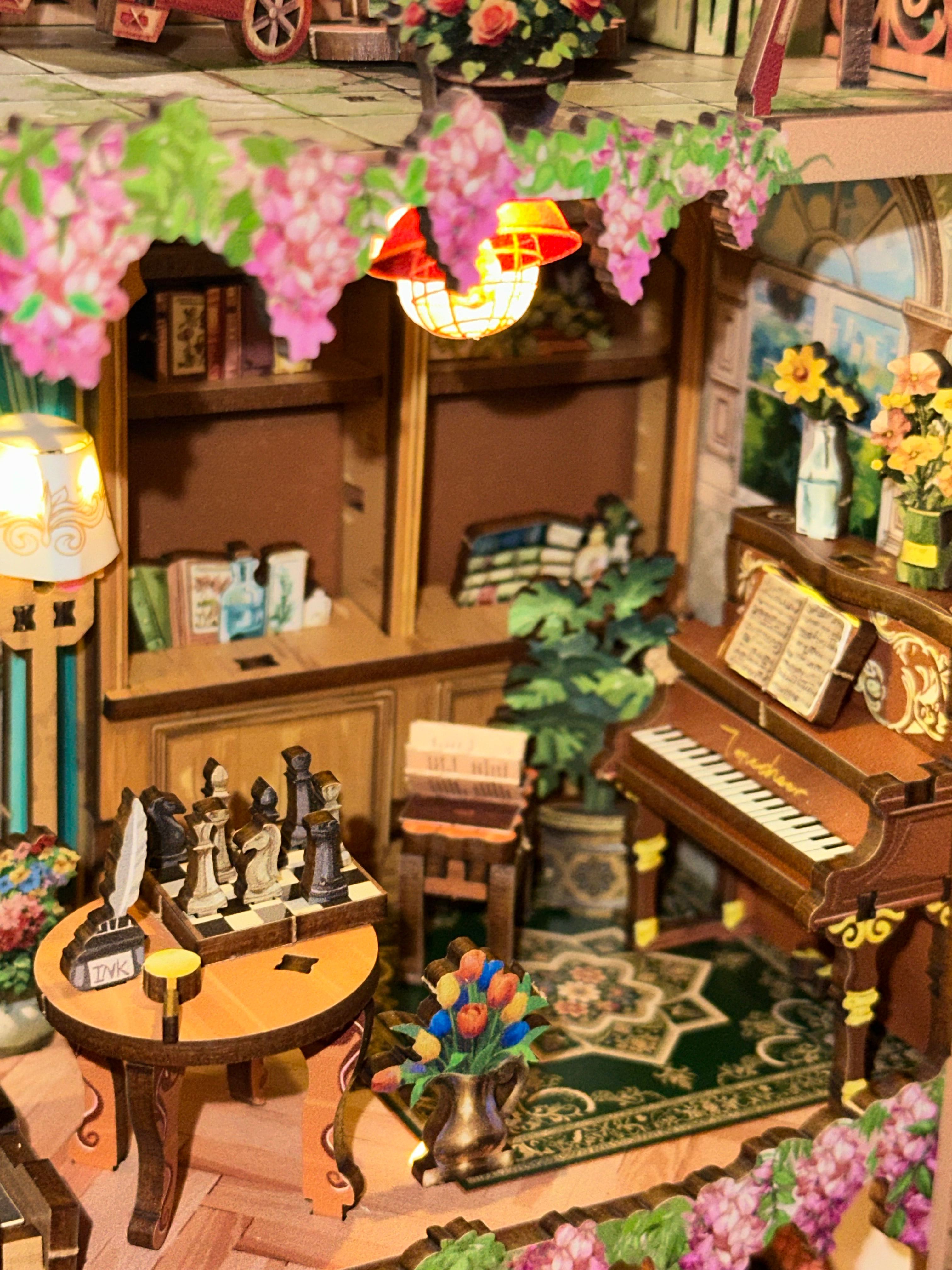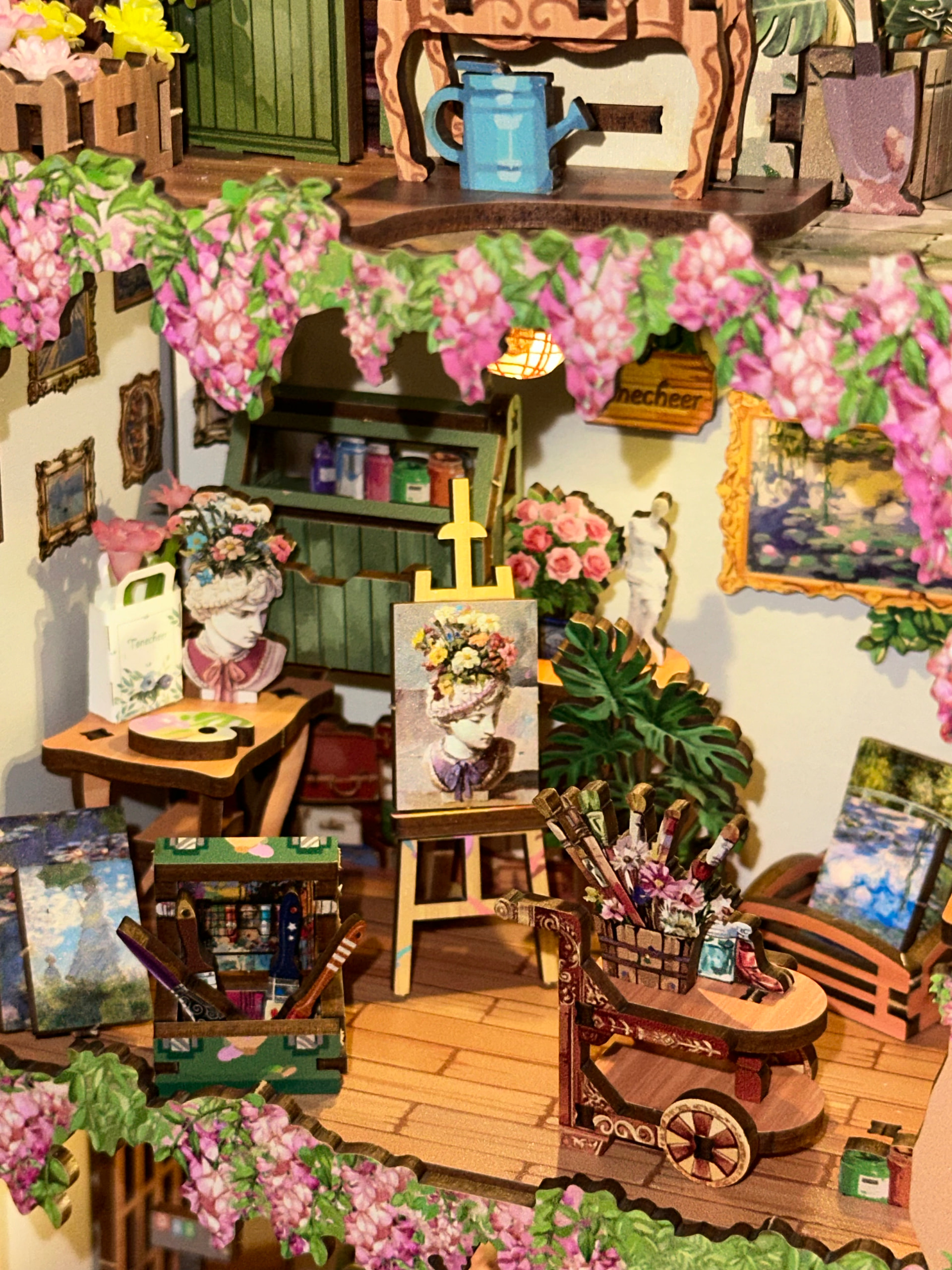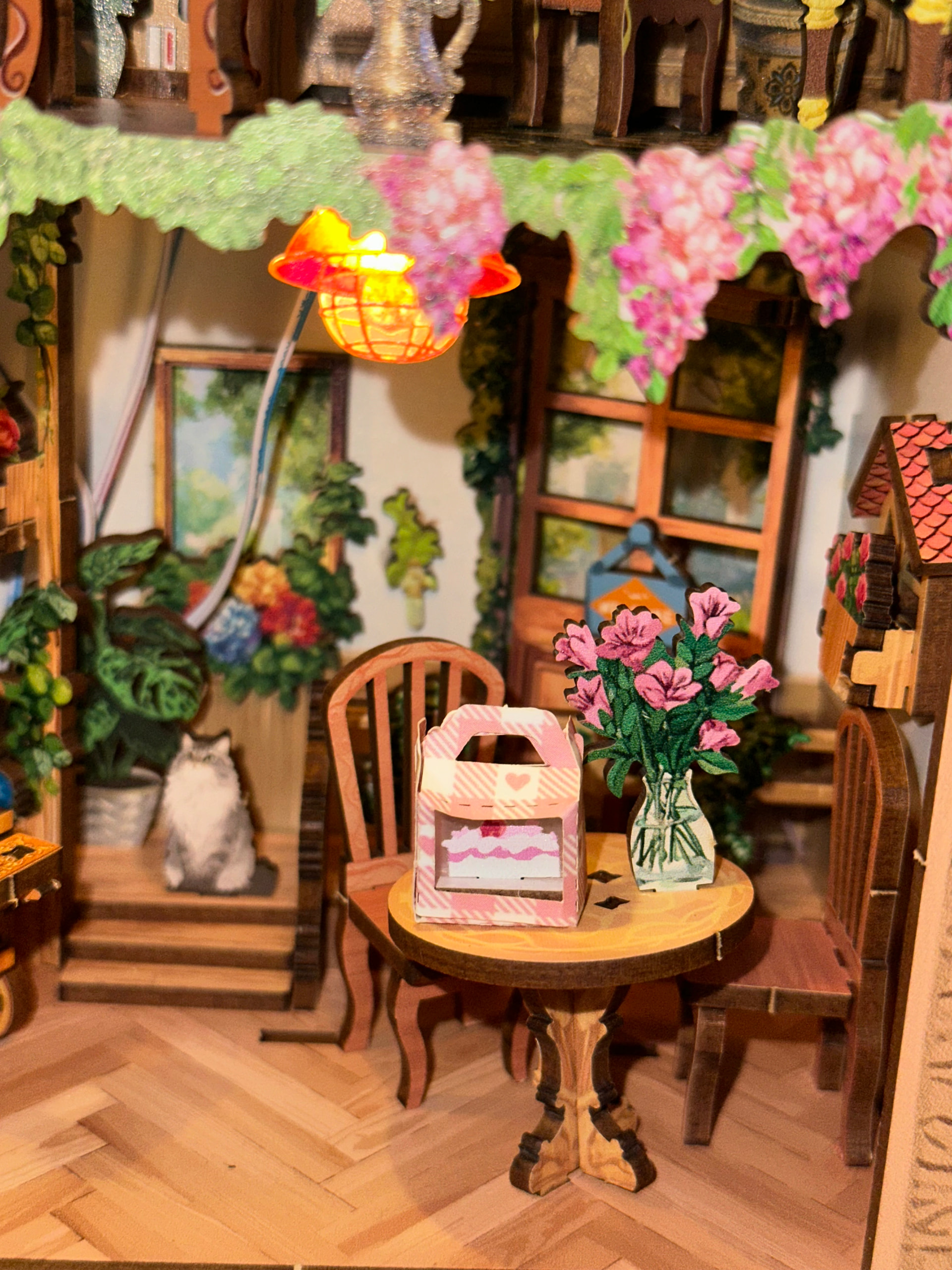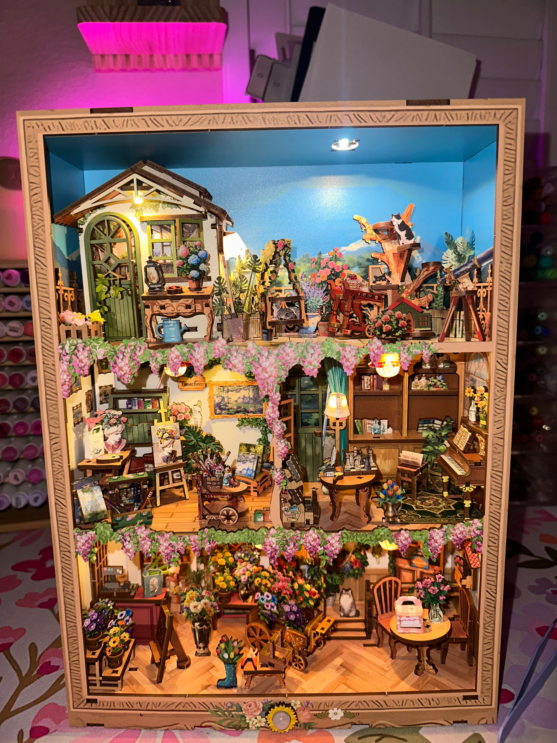 The layered rooms, tiny art details, florals, and warm lighting make this feel like a full little storybook world inside a frame. The warm lighting makes it glow so beautifully at night and the depth of the design makes it such a statement piece on the shelf or you can hang it up on the wall! I just haven’t found a place for it yet