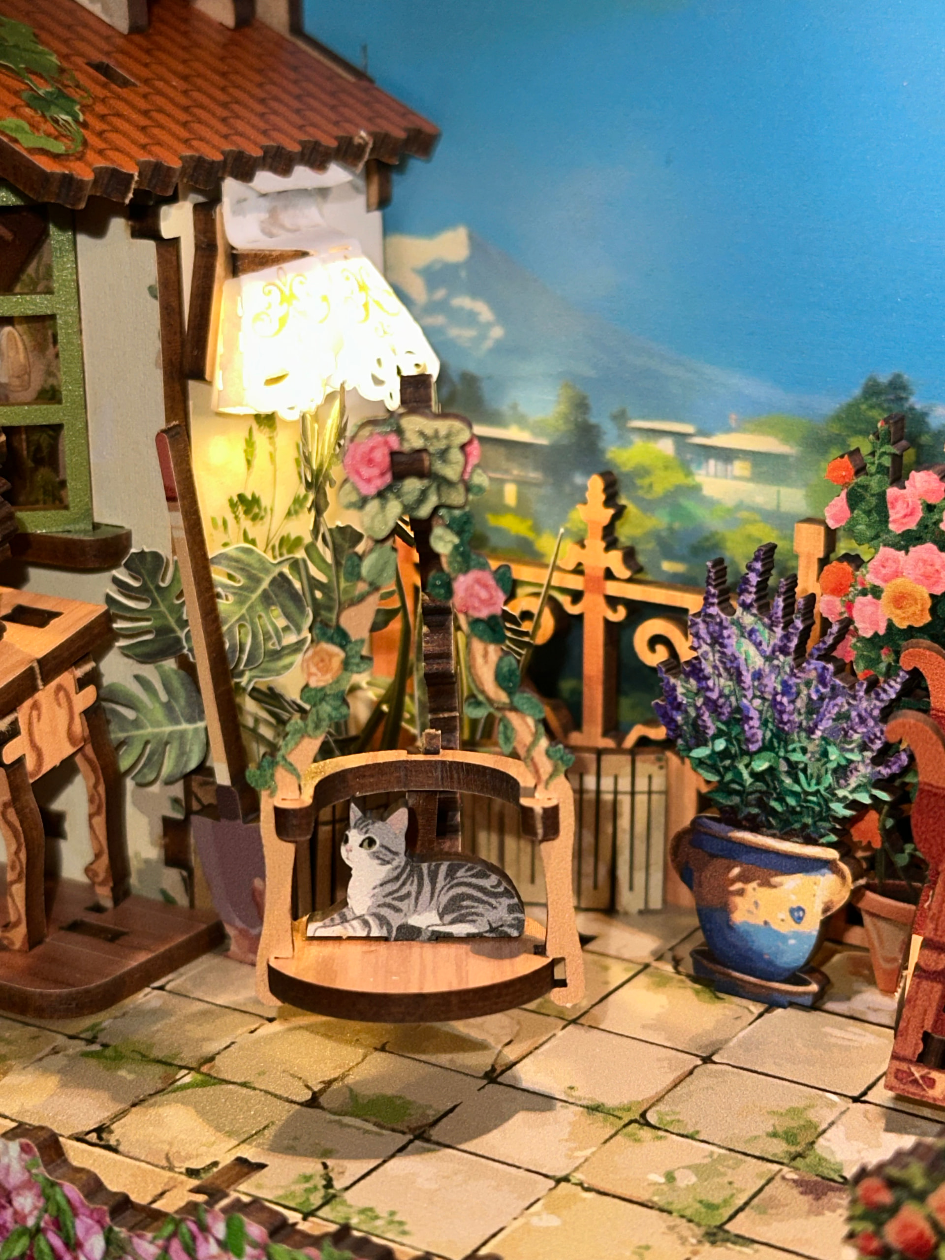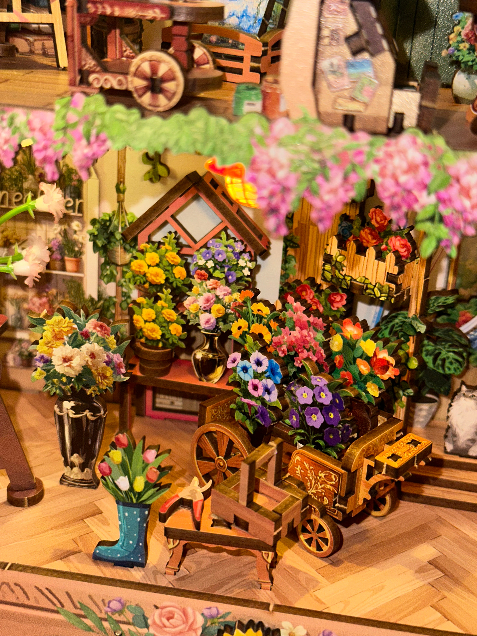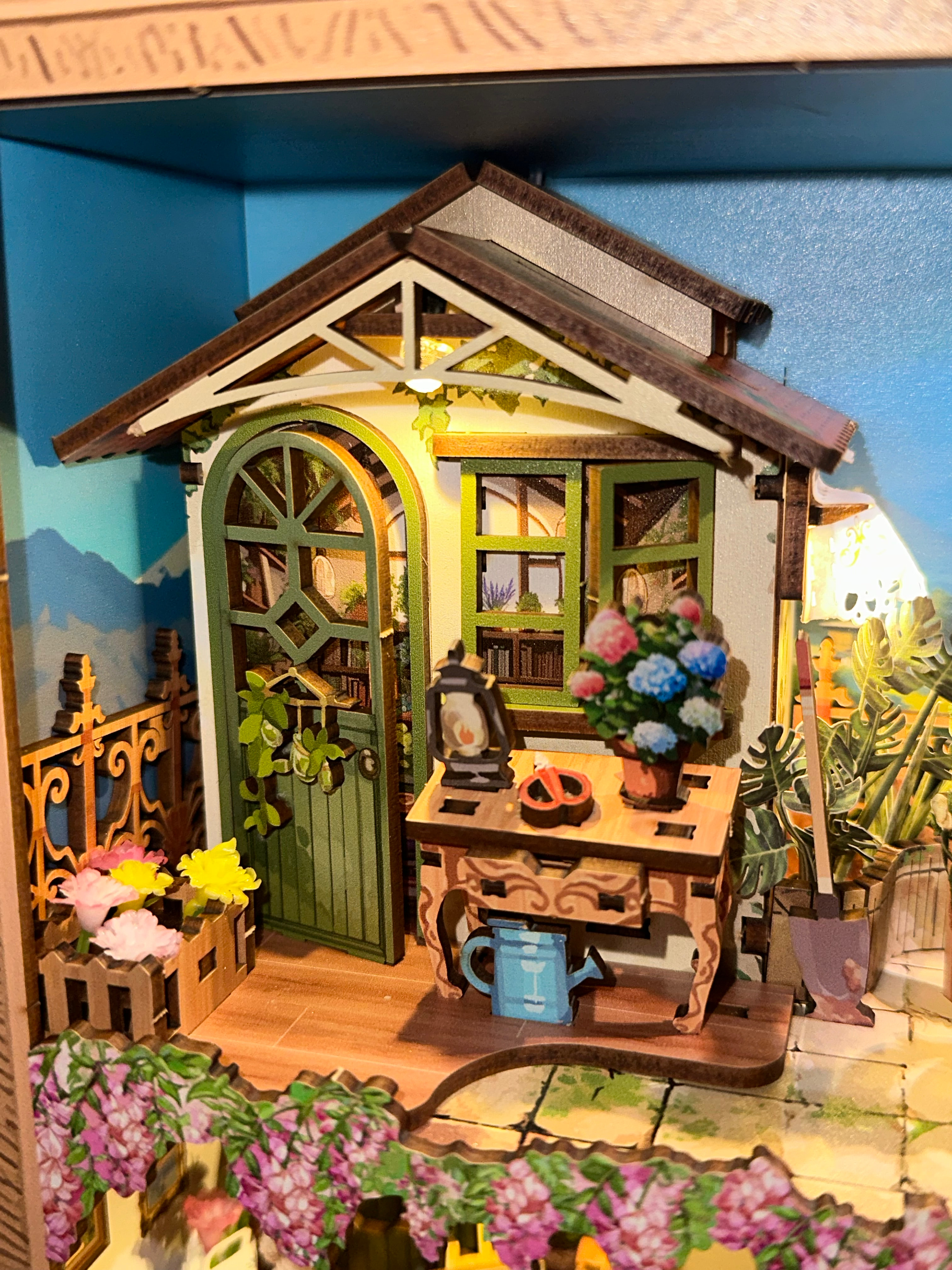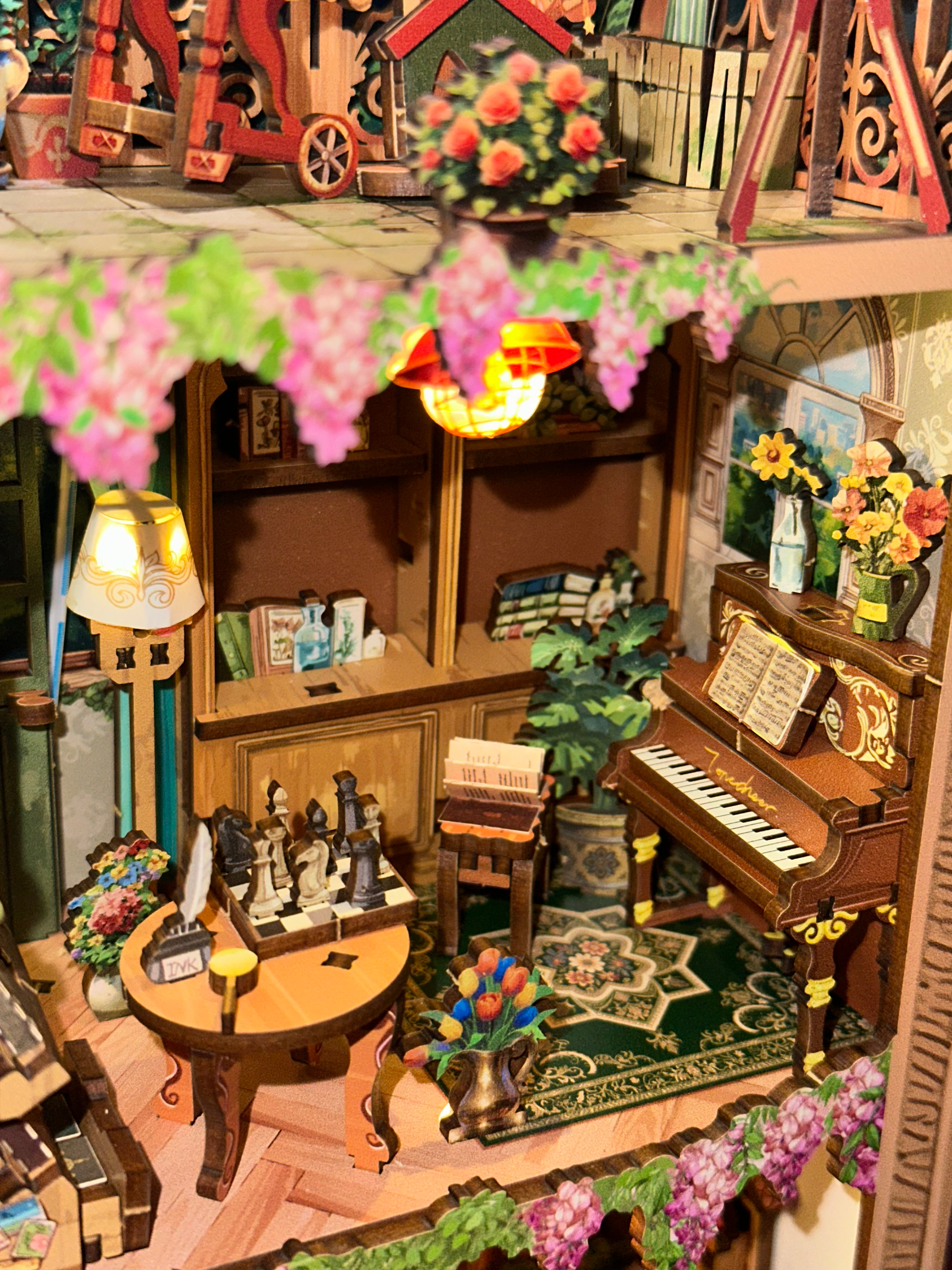 The layered rooms, tiny art details, florals, and warm lighting make this feel like a full little storybook world inside a frame. The warm lighting makes it glow so beautifully at night and the depth of the design makes it such a statement piece on the shelf or you can hang it up on the wall! I just haven’t found a place for it yet