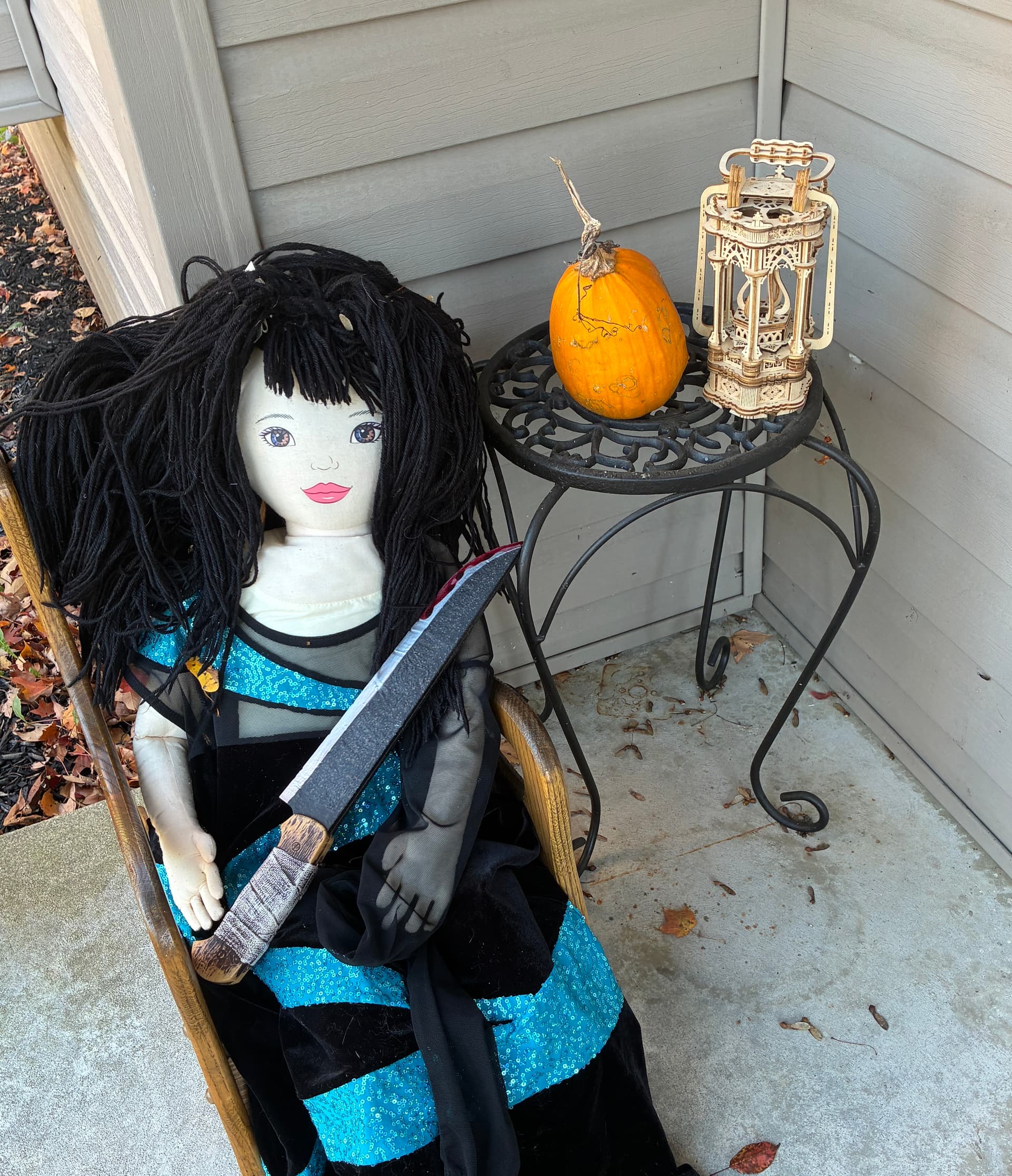 That’s so sweet — even if it’s just one pumpkin, it’s such a special one after all that care! It looks adorable next to the lantern and Scary Girl. Happy Halloween!