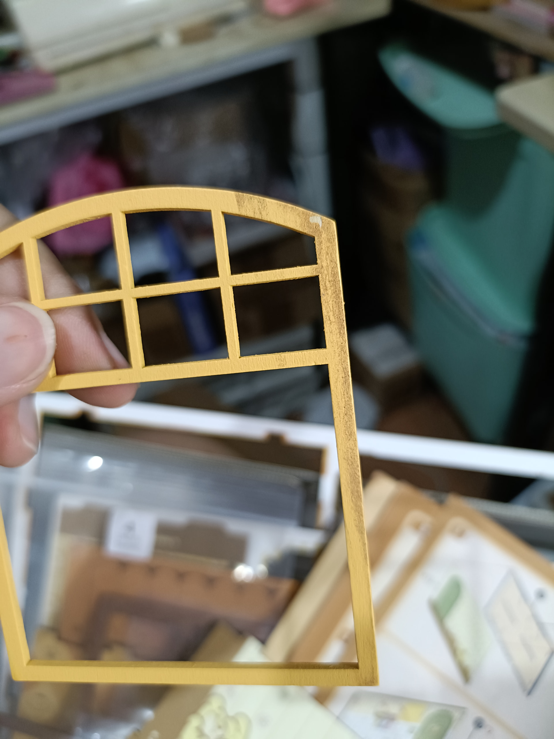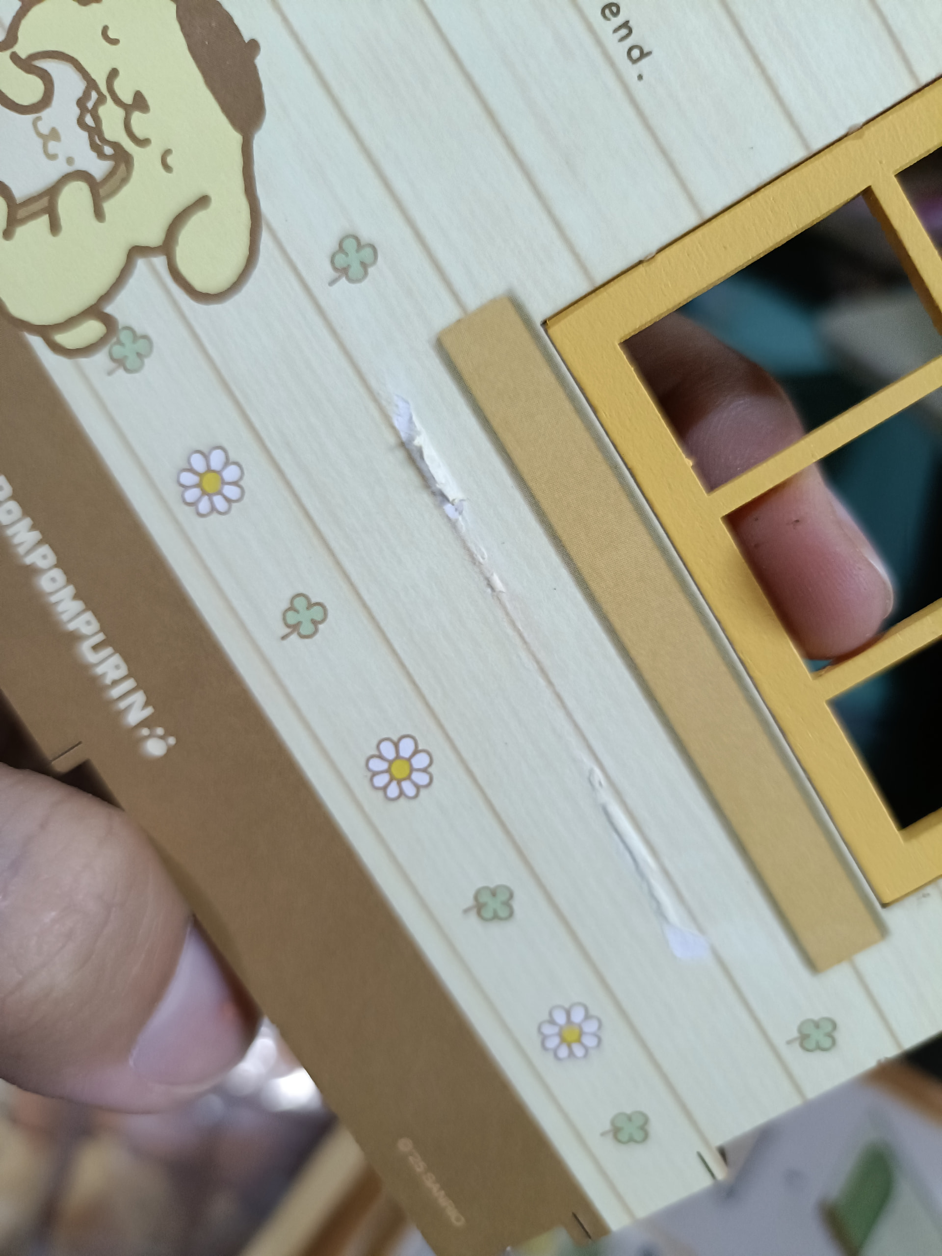 Anyway, I found some problems with this kit mainly because the yellow wooden parts’ paint seem to be not fully cured when this kit was packed in the factory? Because some of the yellow painted wooden parts stuck to the other parts of the kit making some damages that are hard to fix like this printed wall paper: