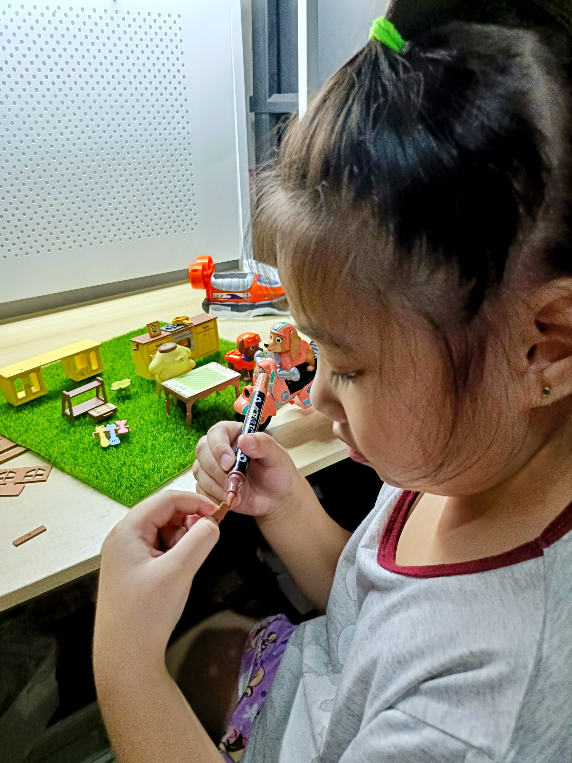 We worked on it the whole afternoon on and off. She helped me with applying the stickers, painting the sides of the wooden parts (because we are extra:sparkles: like that), and connecting small wooden parts like the stool, chairs, table, picture frame, and some parts of the kitchen counter.
