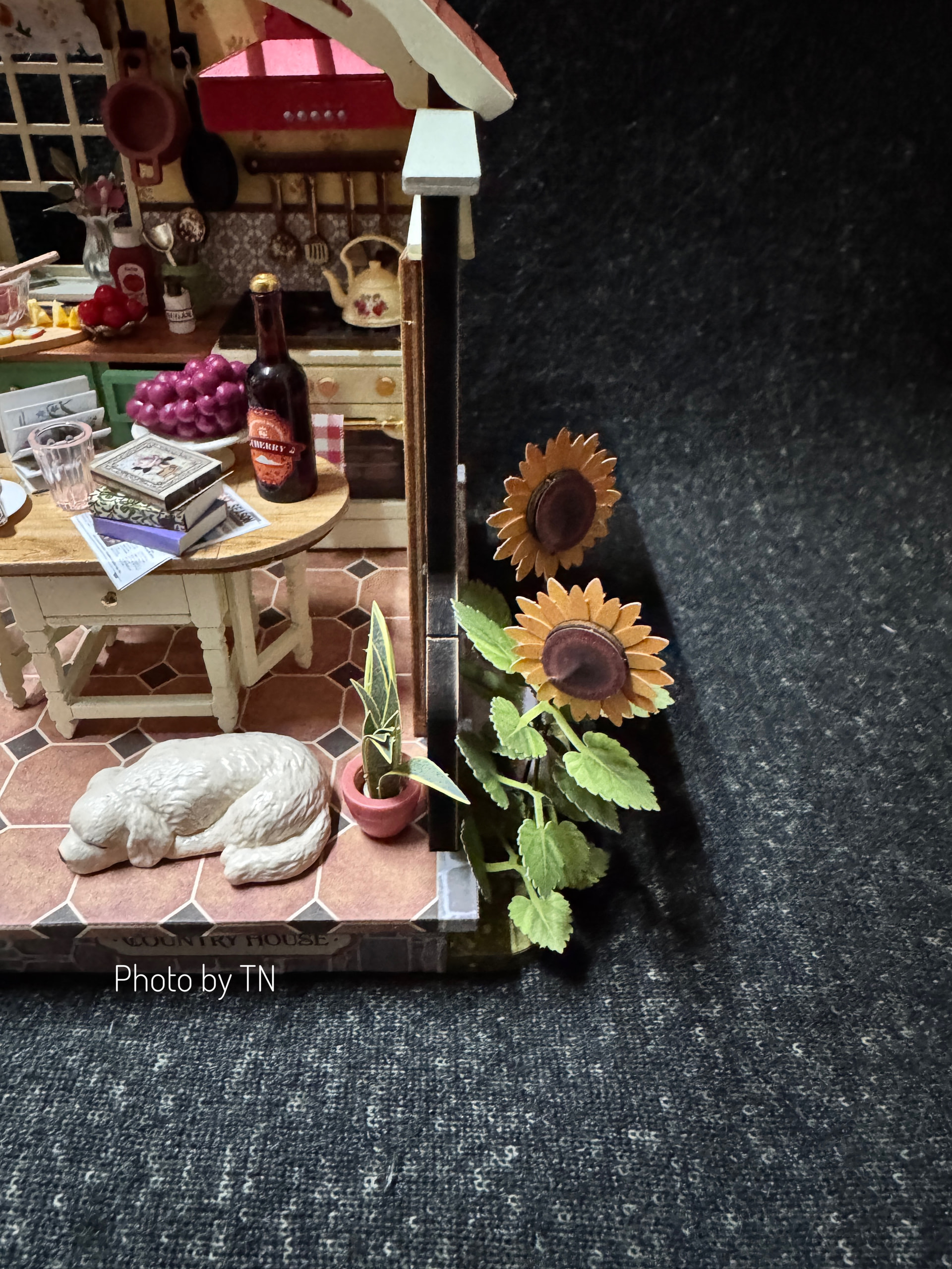 Outside, a small dog curls up asleep, nestled among potted plants and vibrant sunflowers. The stone-paved path leading to the house further enhances its rustic and familiar charm.