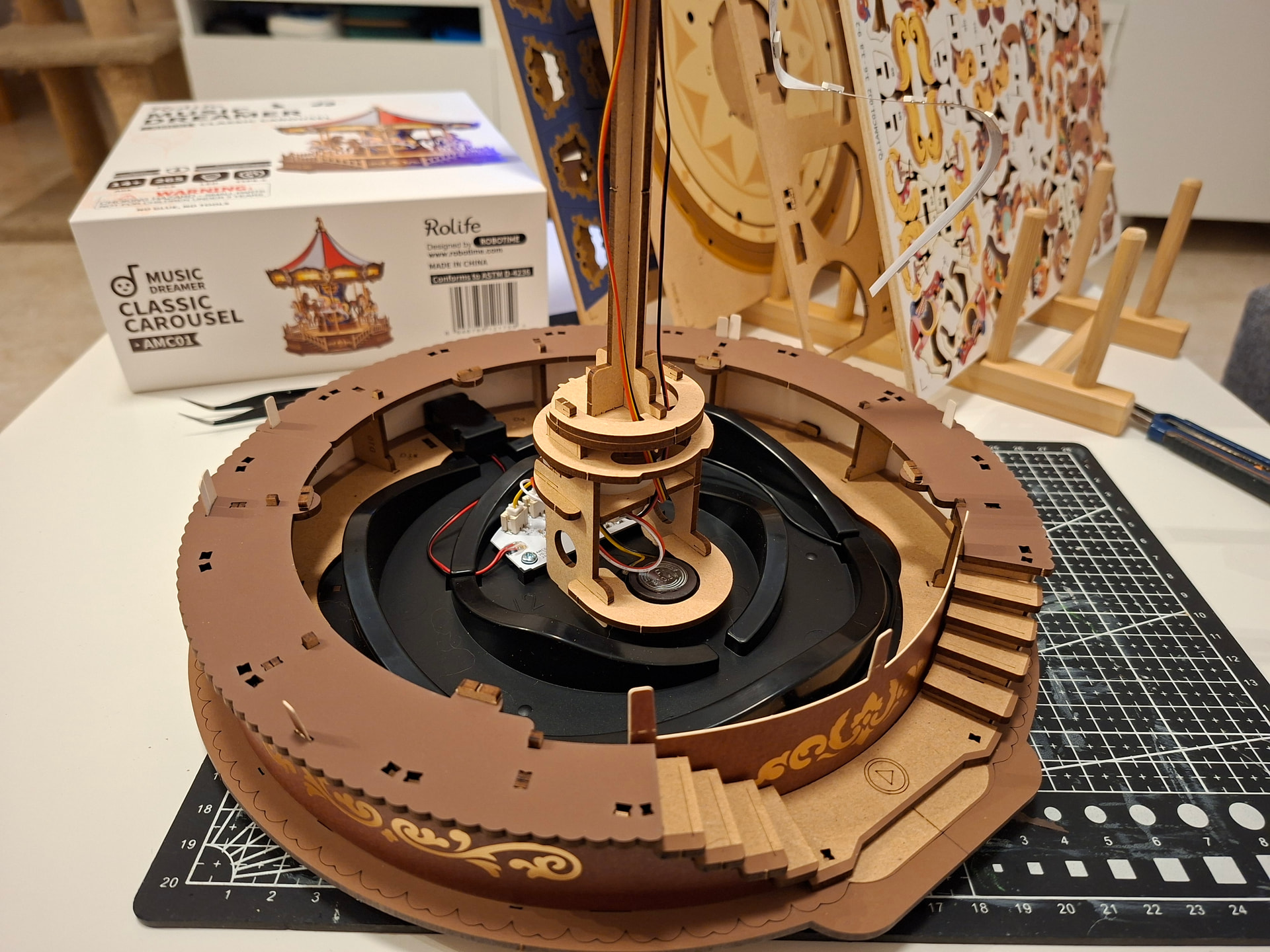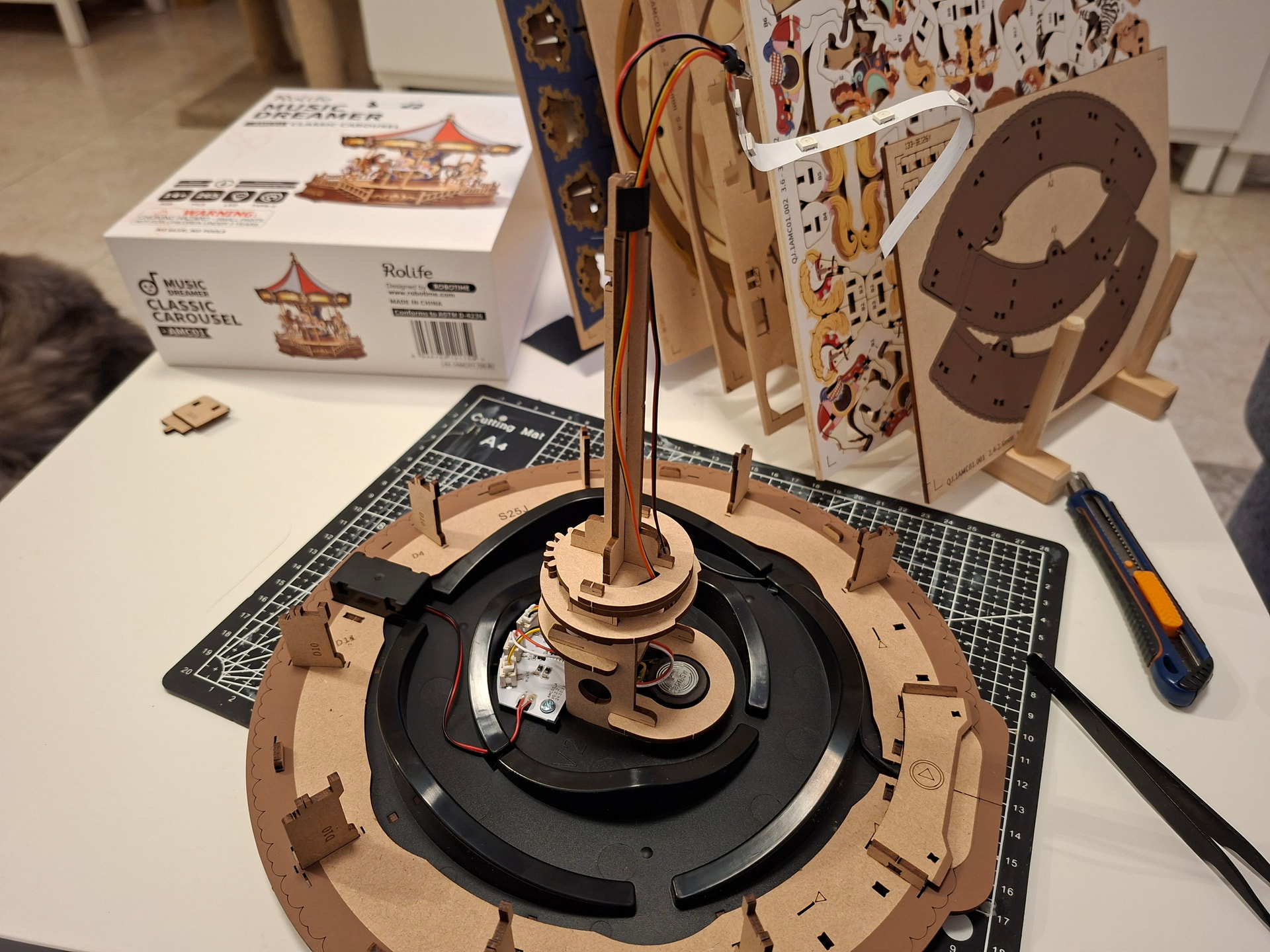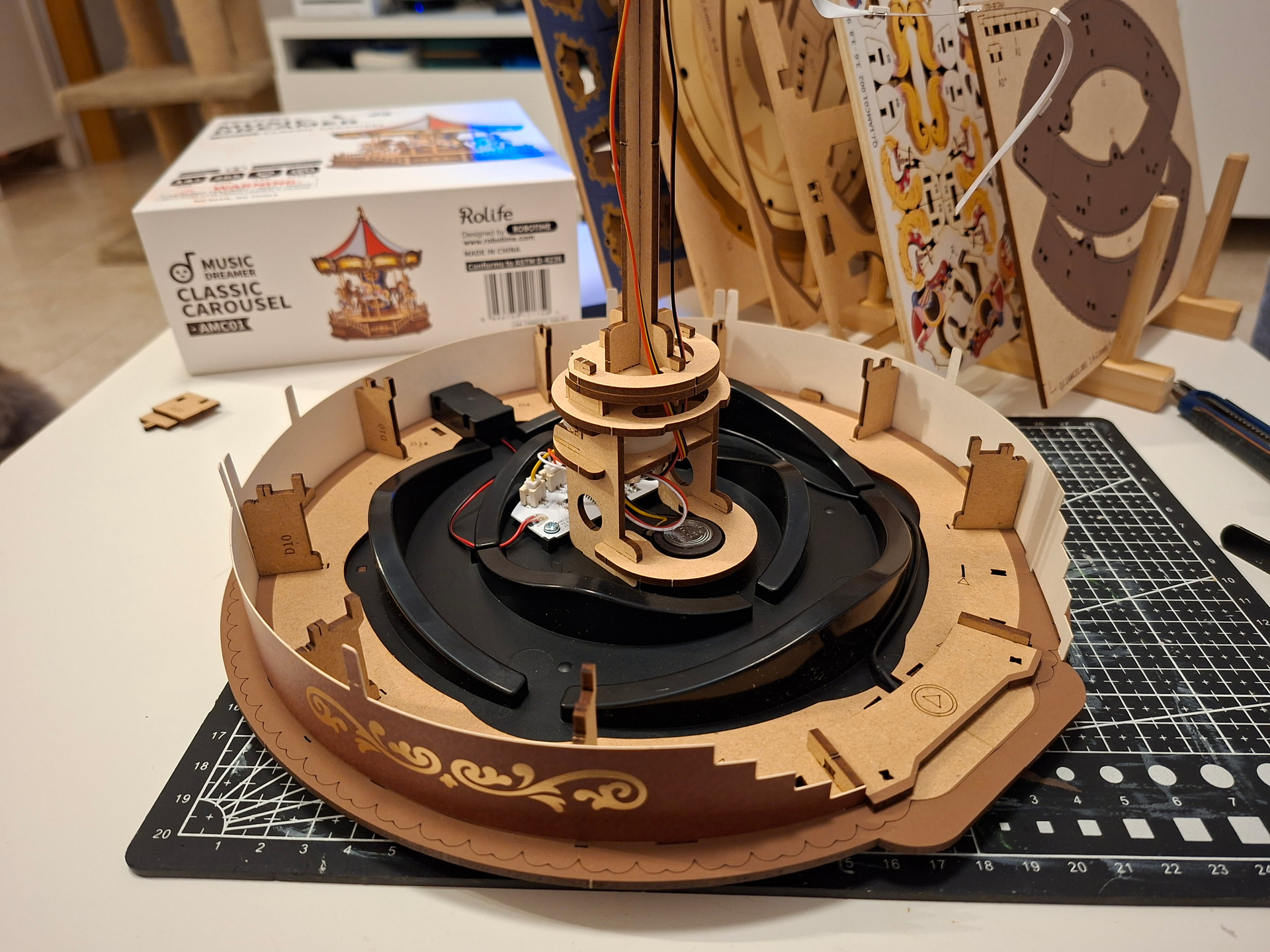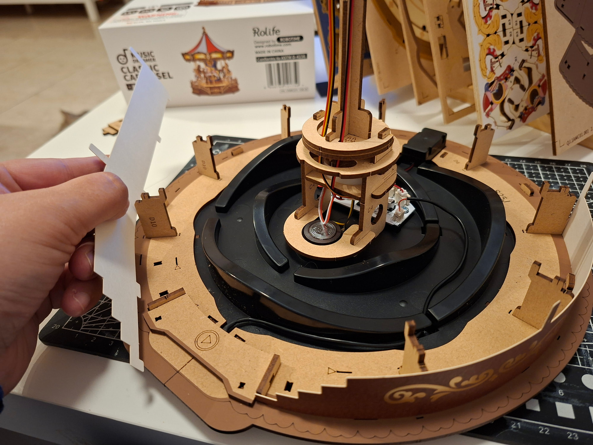 The last thing I did in this first session was add the cardboard pieces that wrap around the carousel. And honestly… this is the kind of part I’m never a huge fan of. Those little cardboard tabs are very delicate and bend so easily while you’re trying to fit the others into place. If one bends, it becomes such a pain because getting it properly lined up again is really tricky, and it happens very easily. When that happens, I use tweezers to help straighten them and guide them back in, but it’s still fiddly. On top of that, the wooden pieces that go over them fit quite tightly, and the tabs have to pass through the wood above. The good part is that trimming the excess afterward is easy, but if the tabs do not go in properly first, then yes… it can be a bit of a nightmare.