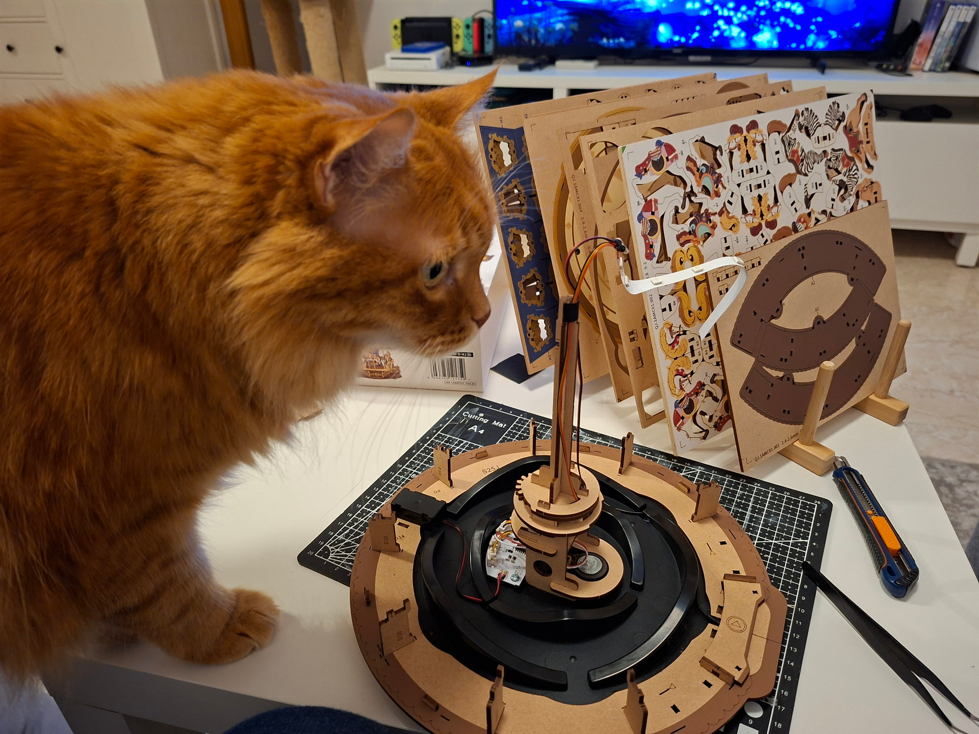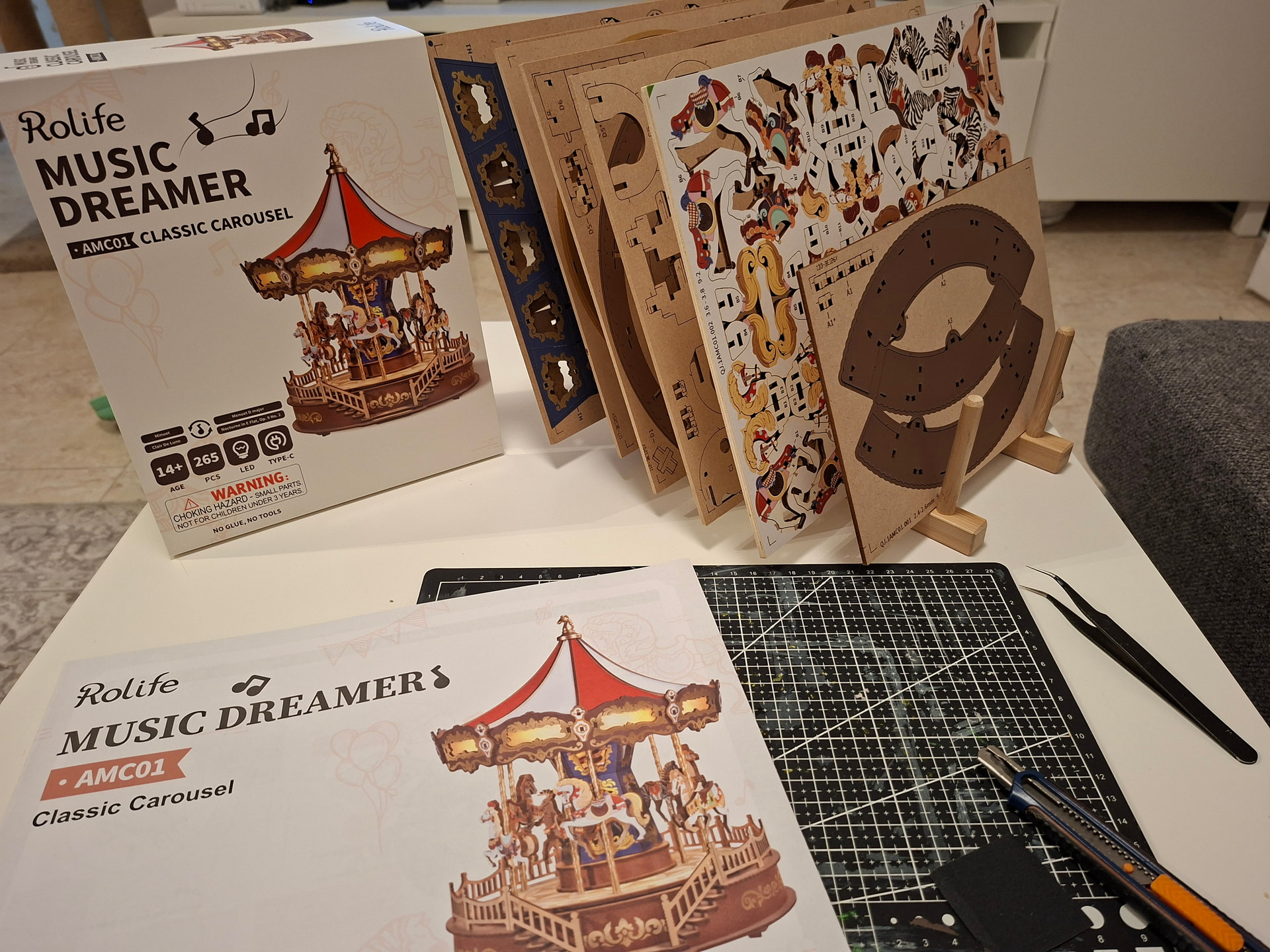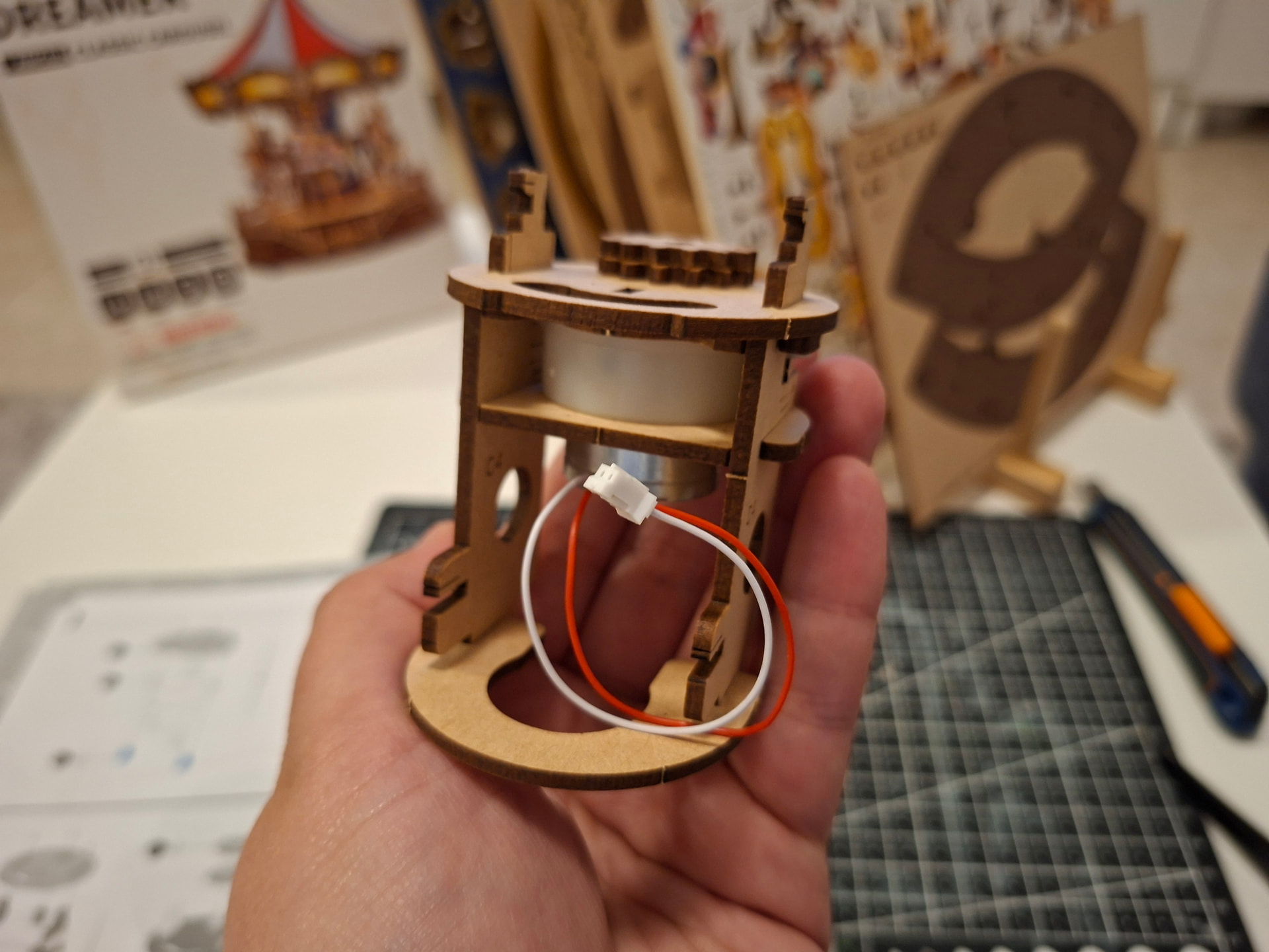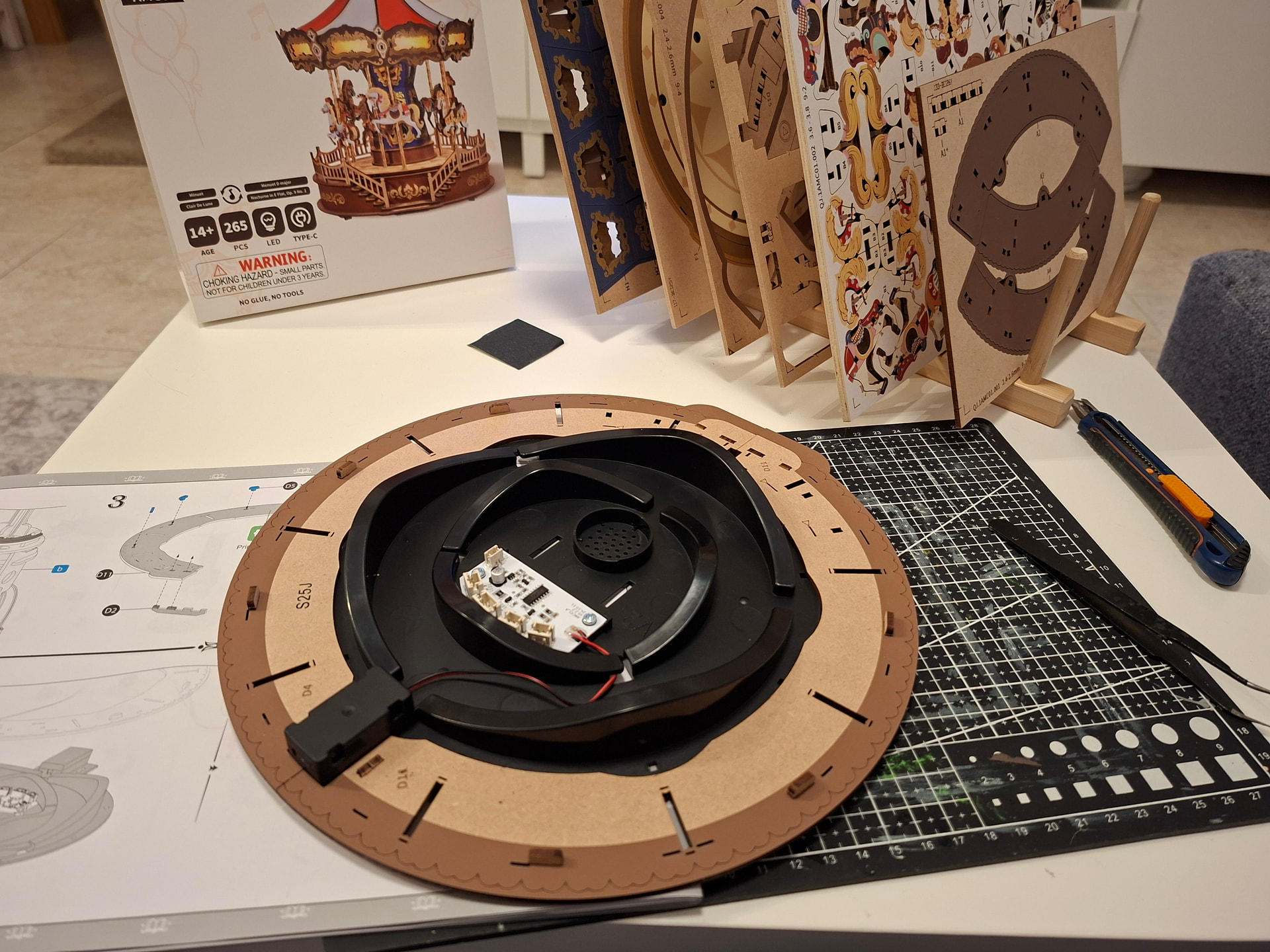 The last thing I did in this first session was add the cardboard pieces that wrap around the carousel. And honestly… this is the kind of part I’m never a huge fan of. Those little cardboard tabs are very delicate and bend so easily while you’re trying to fit the others into place. If one bends, it becomes such a pain because getting it properly lined up again is really tricky, and it happens very easily. When that happens, I use tweezers to help straighten them and guide them back in, but it’s still fiddly. On top of that, the wooden pieces that go over them fit quite tightly, and the tabs have to pass through the wood above. The good part is that trimming the excess afterward is easy, but if the tabs do not go in properly first, then yes… it can be a bit of a nightmare.