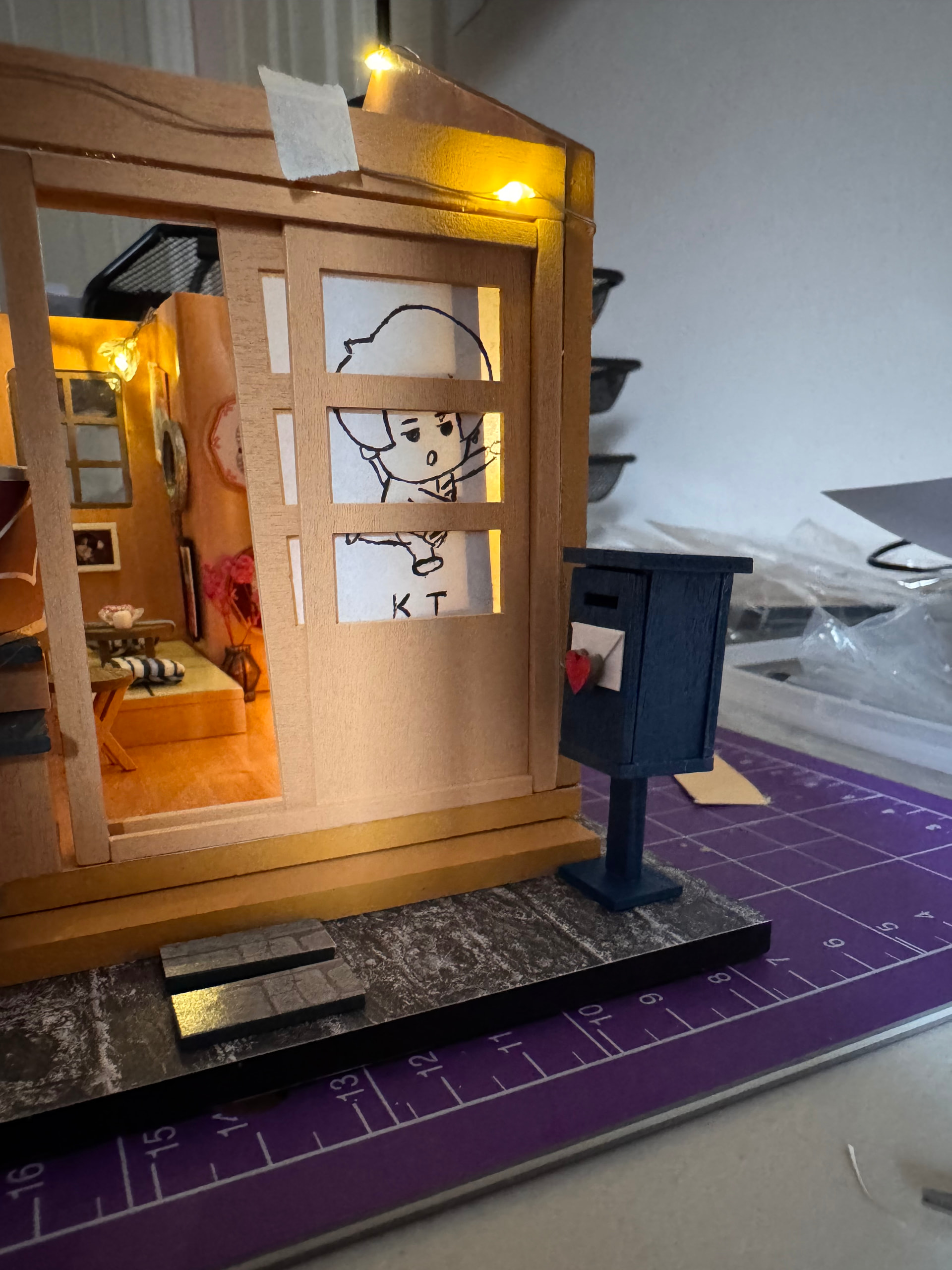 After that, I neatly sealed everything up, arranged the photos into proper frames, and styled all the fan support items inside the “house” so it feels cozy and full of character. I also refined the finer touches — like fixing up the mailbox and tidying the tabletop — just to make the whole display look more polished and cohesive.