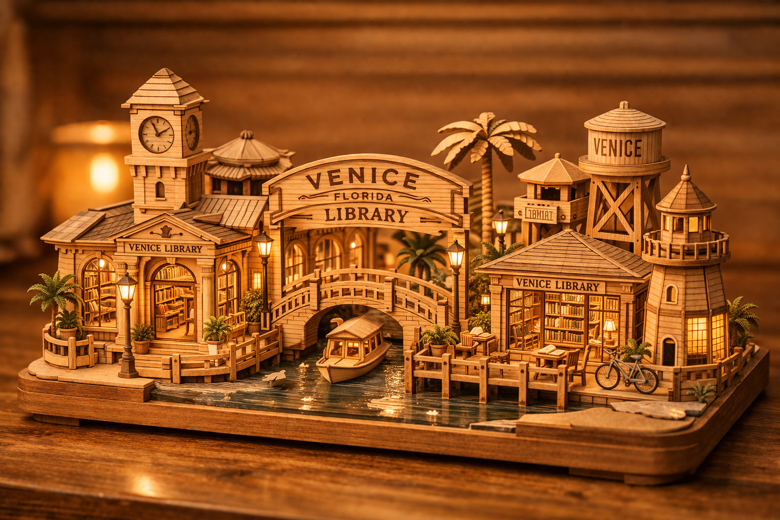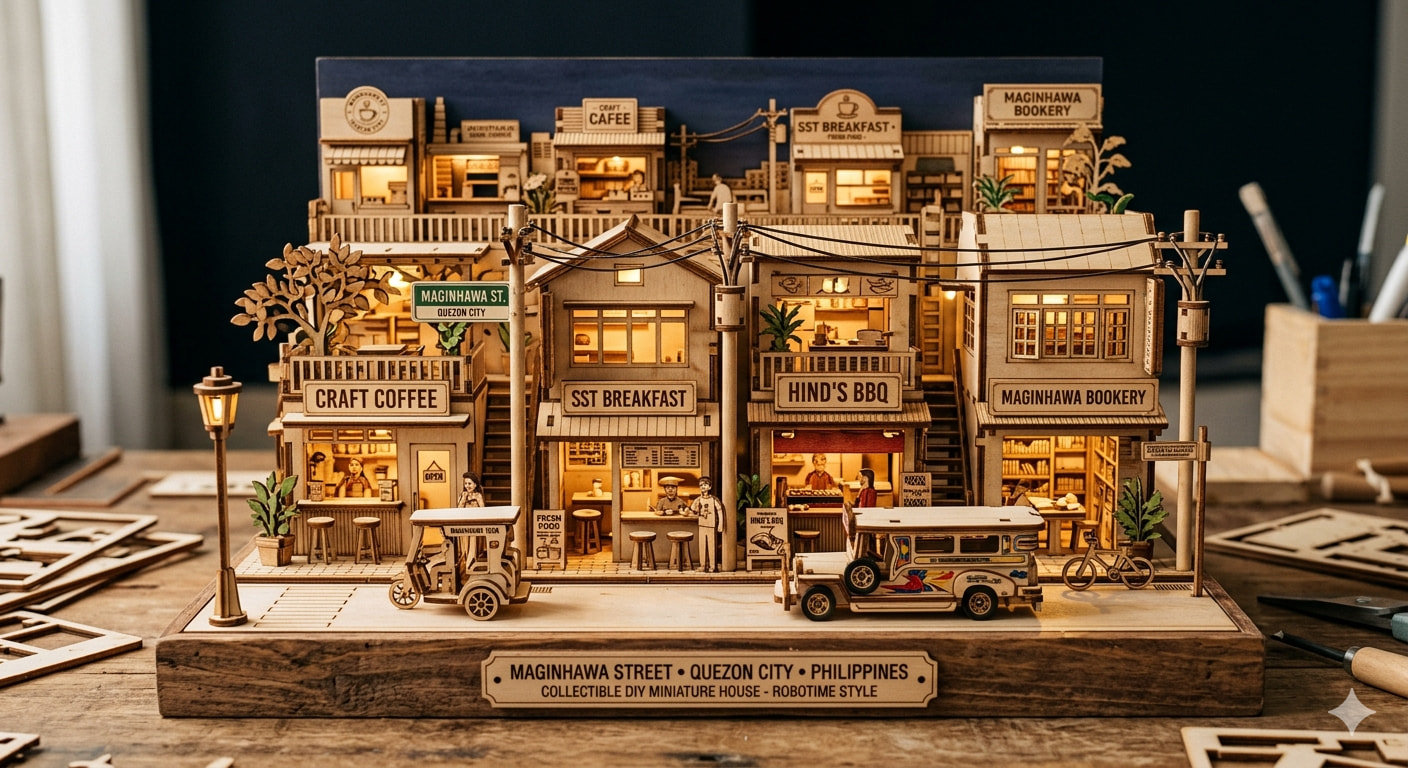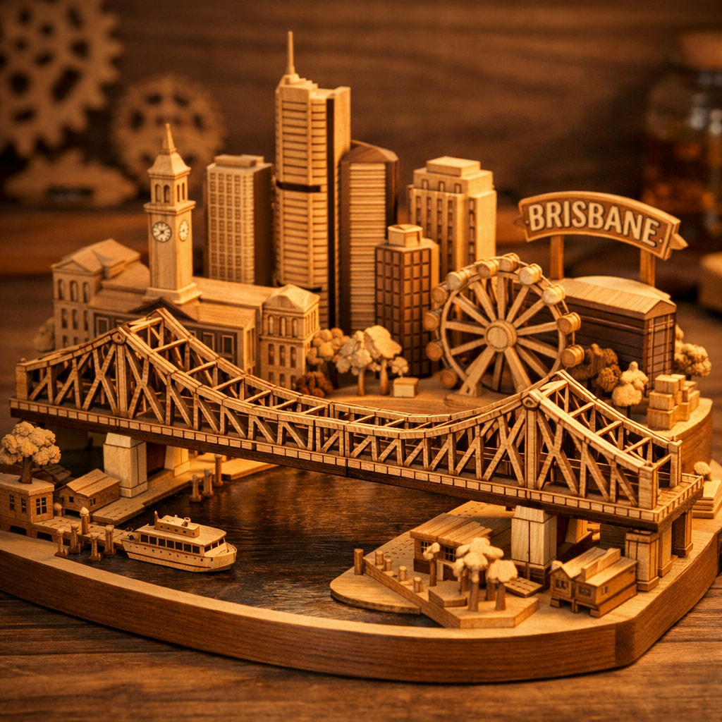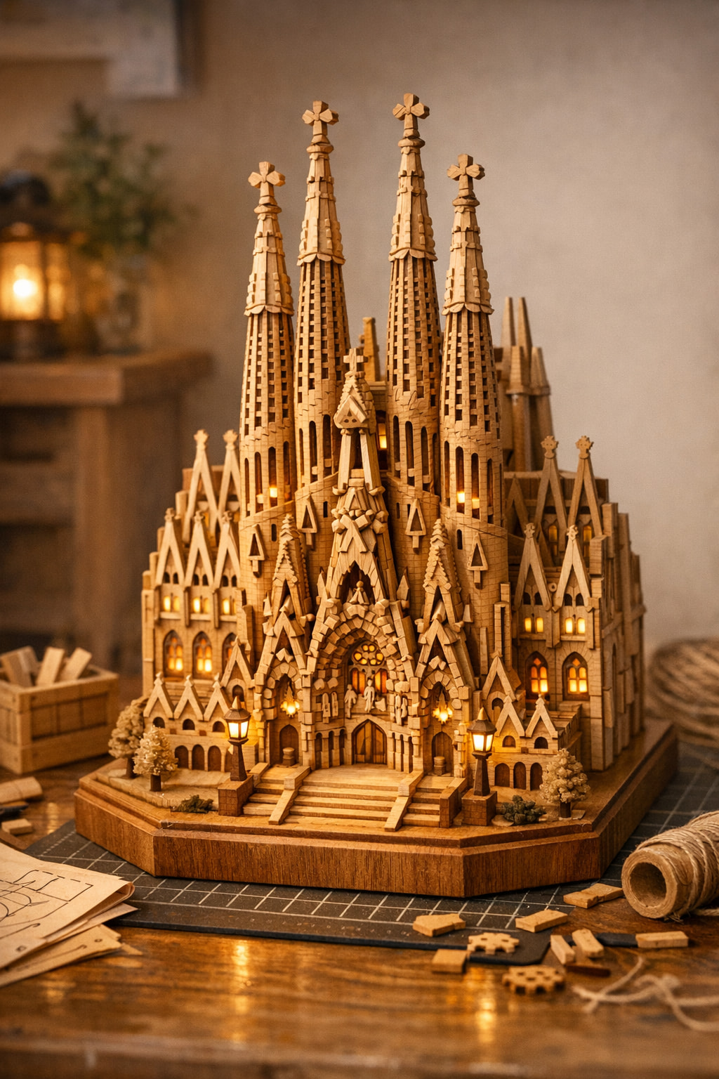 A detailed wooden miniature model of [LANDMARK], in the style of Robotime DIY kits, warm natural wood texture, soft lighting, intricate structure, collectible scale, realistic craftsmanship, cozy atmosphere