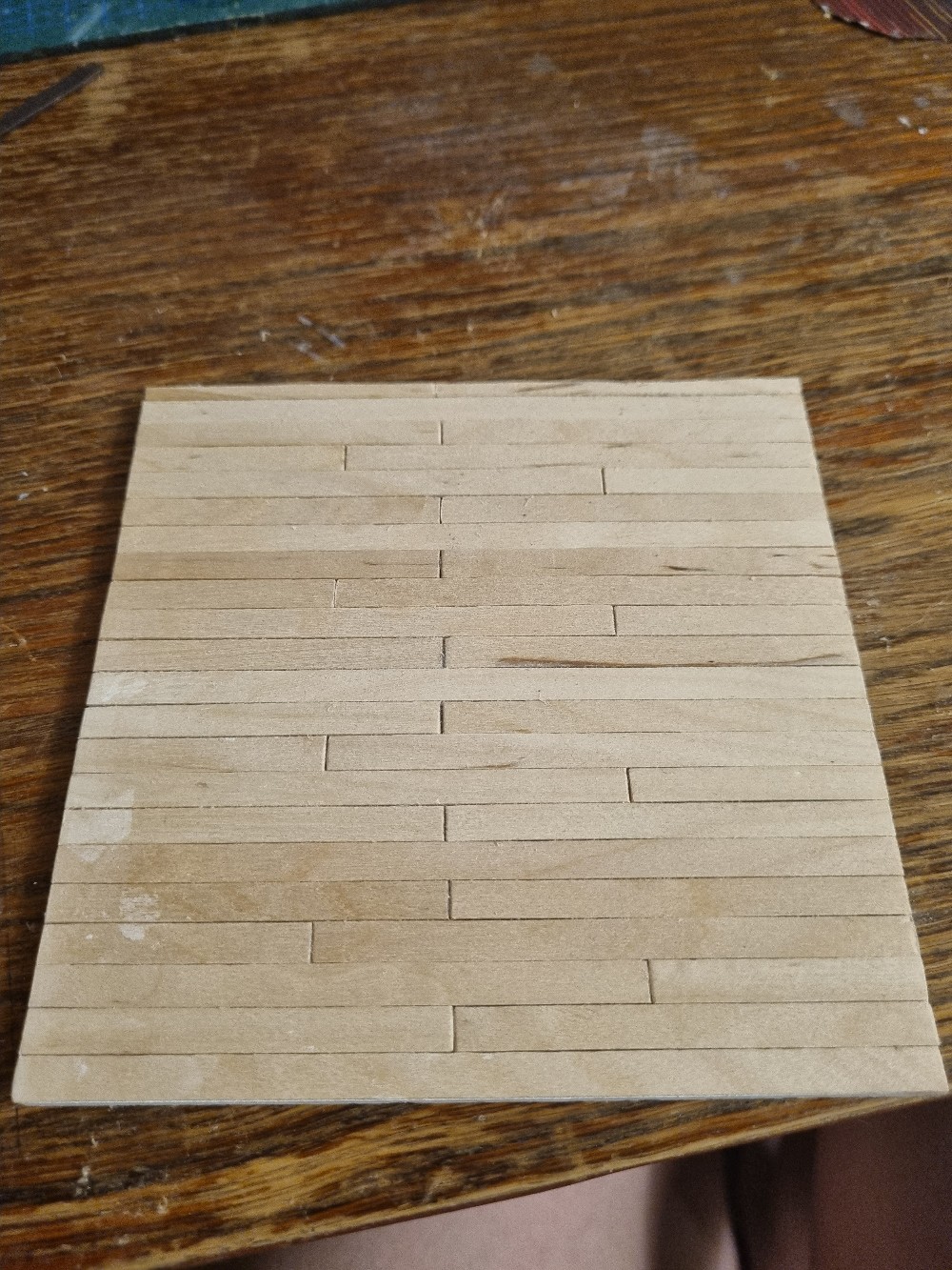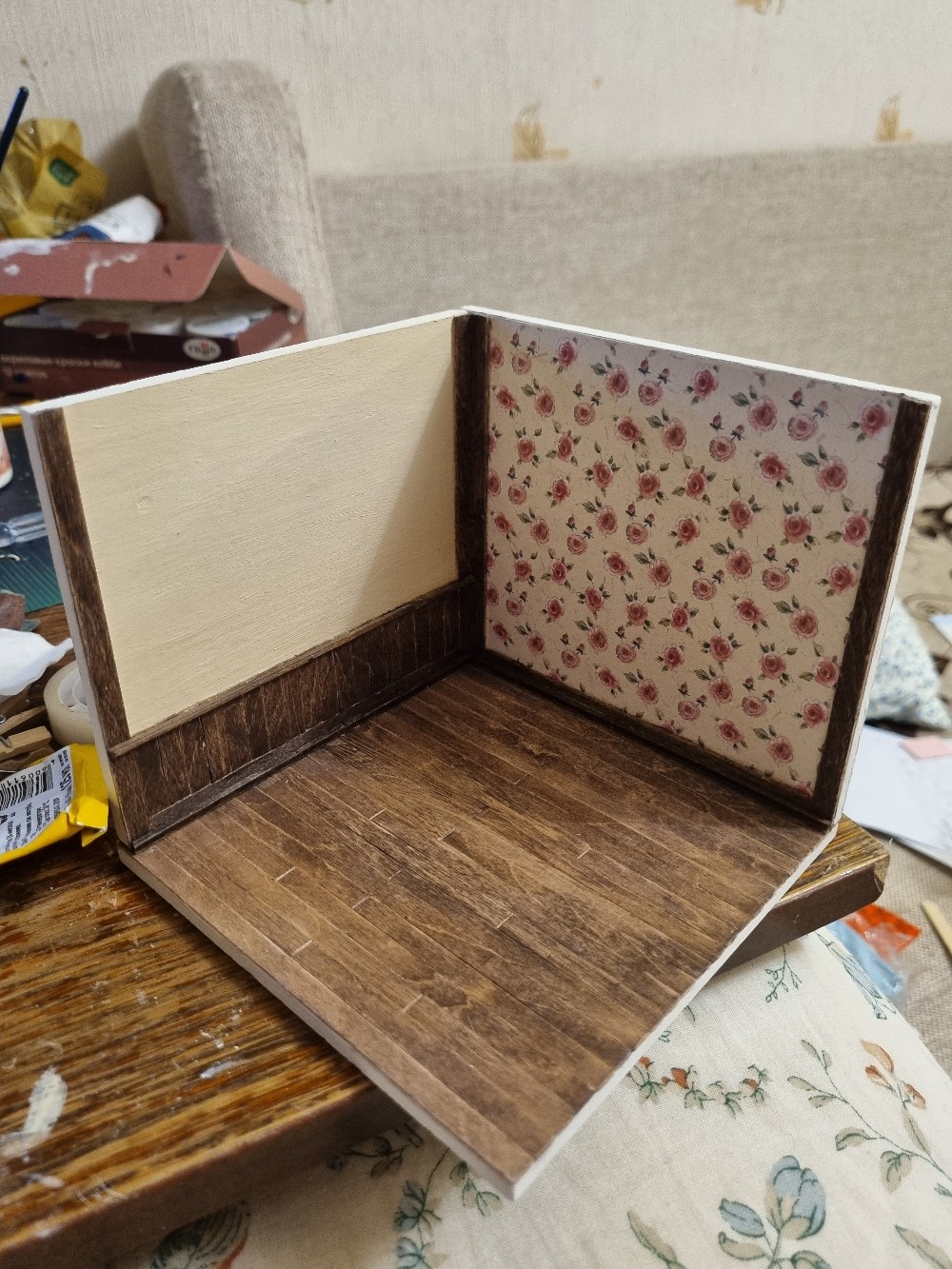 I started with the floor. For some reason it was the most enjoyable part to do lol. With the wood cutter, some coffee sticks and later on wood oil I began creating:
