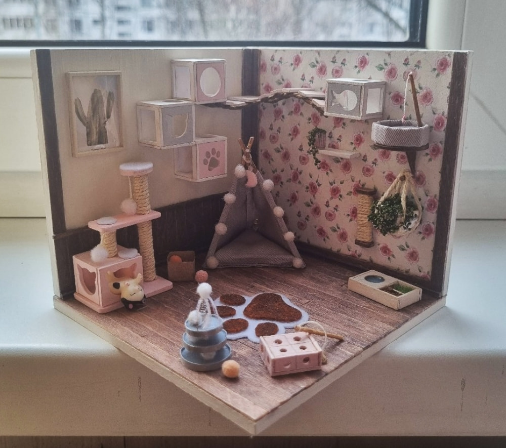 I love how your custom kit turned out, especially the cat tree and the tent! For painting the walls, I heard spray painting them makes it look smoother and even. Incredible job!