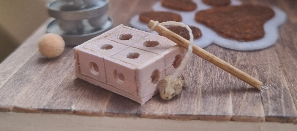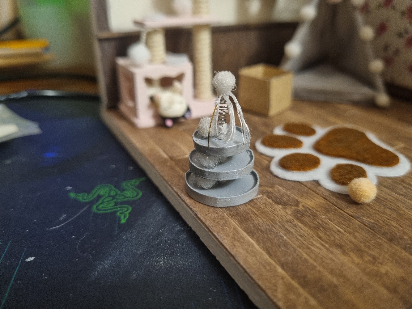 Then I started making custom details. Never used resin before and didn’t know how to color it, so the bowl might look a bit weird. Same goes for the pot, I molded it out of a wierd thing (usually used for evening out walls). As for cat toys: cut little pieces of wood and drilled holes for the box; used a little rock for the mouse; cut out paper and used a spring for the tower; crafted a little tent with fabric~