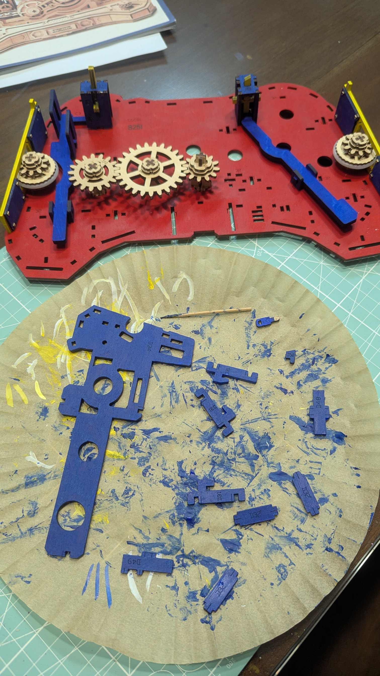 This is going to be stunning. All of those gears in the picture will be hidden below the ‘floor’ that goes over it. If you choose to paint the couple of gears that will be seen on the upper section. It is perfectly fine to do so. I wouldn’t paint between the teeth of the gears, though. Be sure to paint before sanding and waxing if you choose to do so…as paint doesn’t stick well to wax. Wishing you the best in this new adventure for you…and your son.