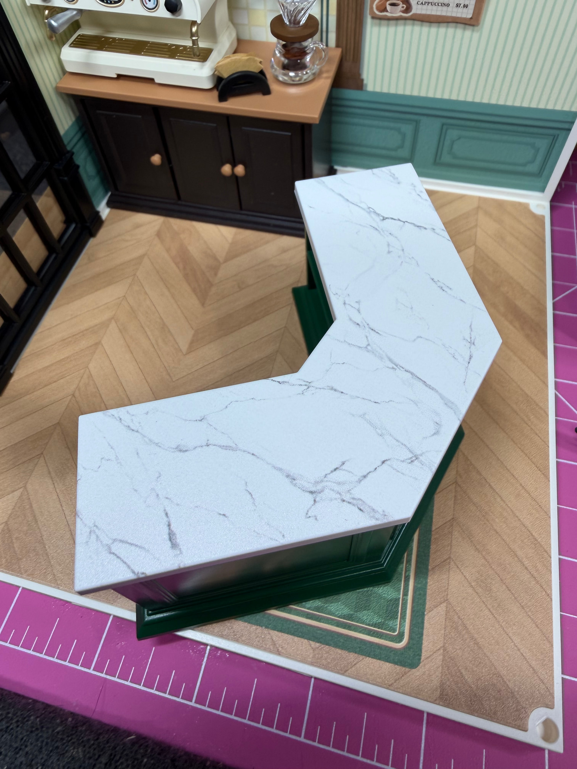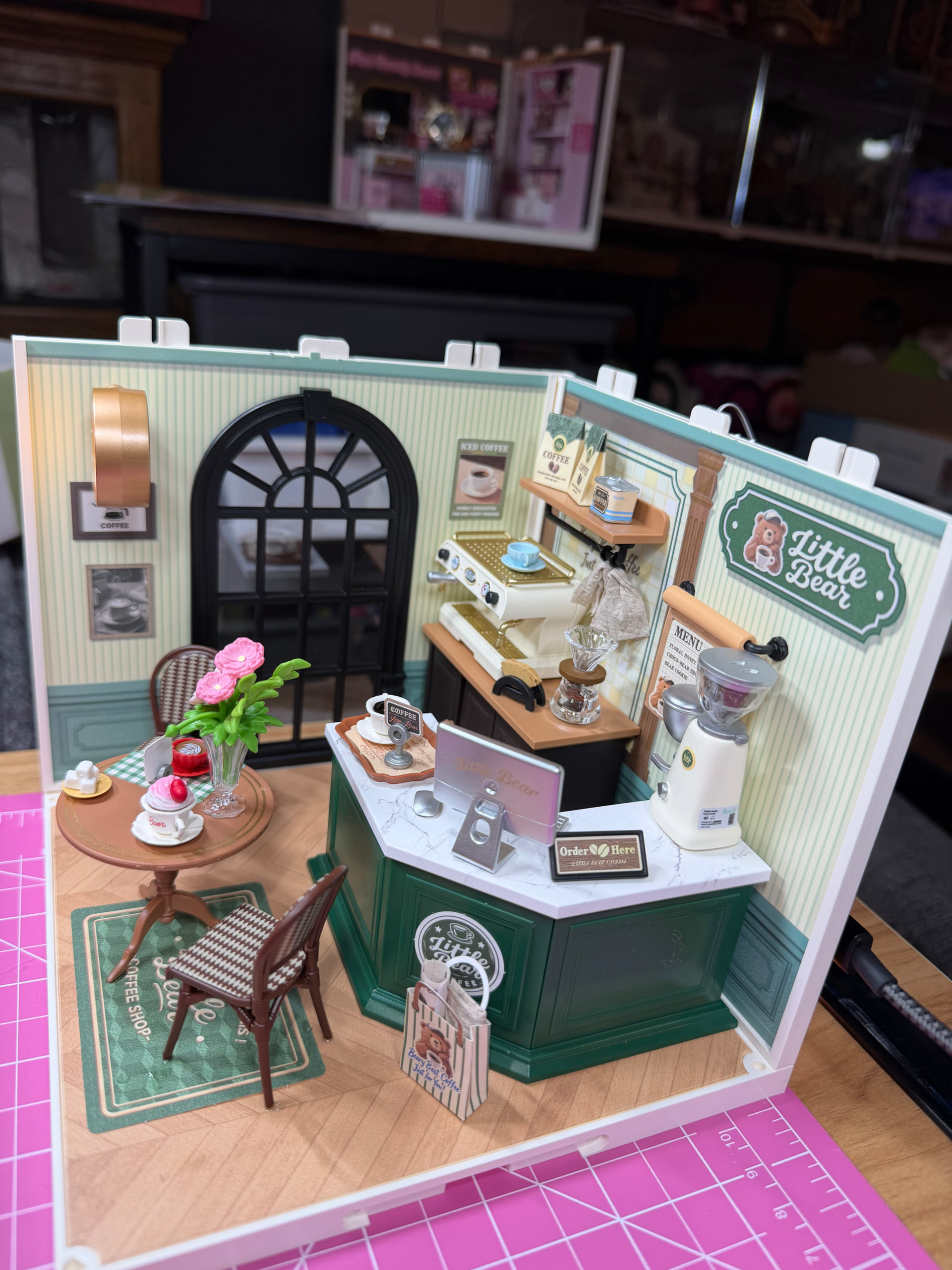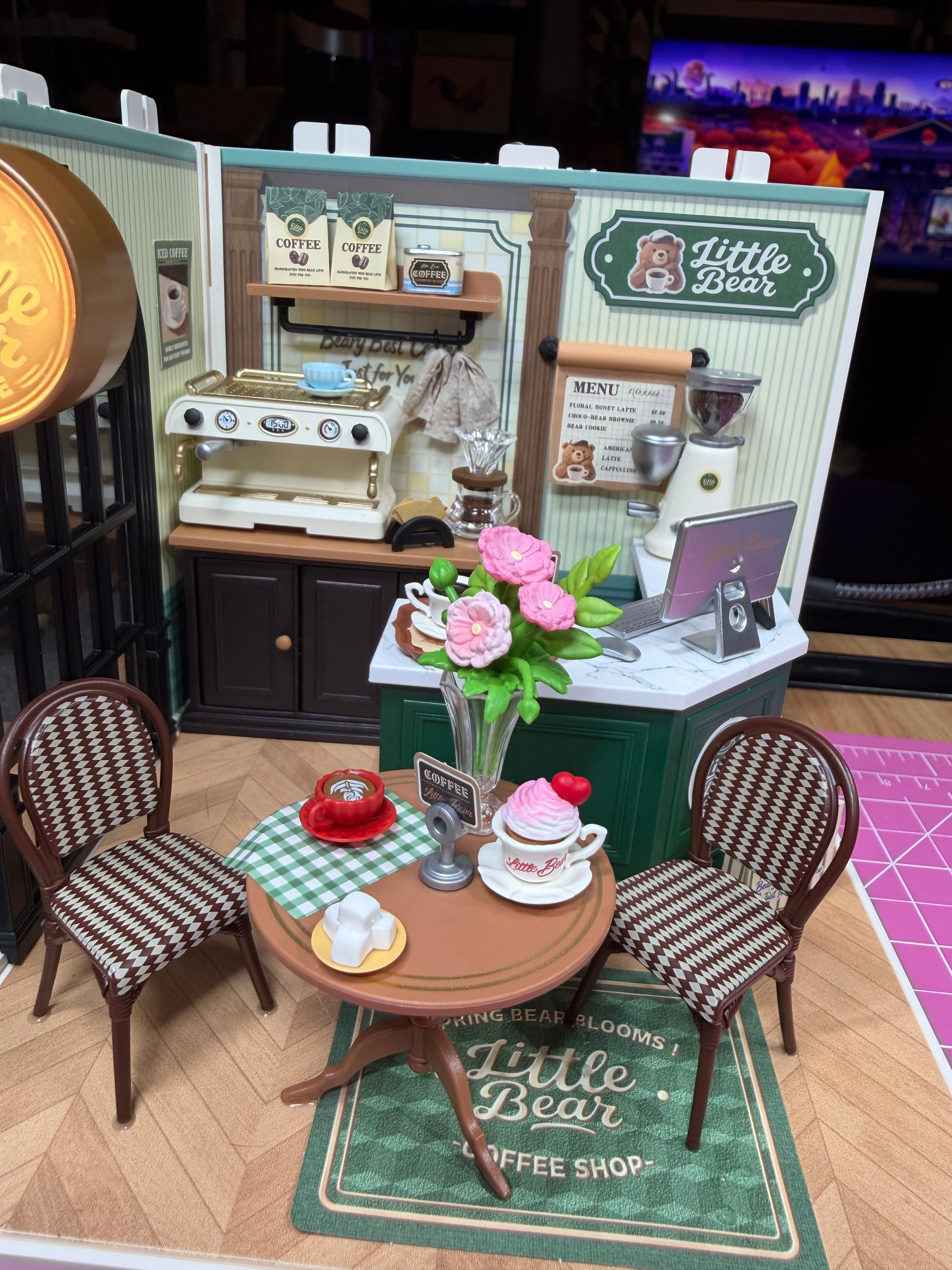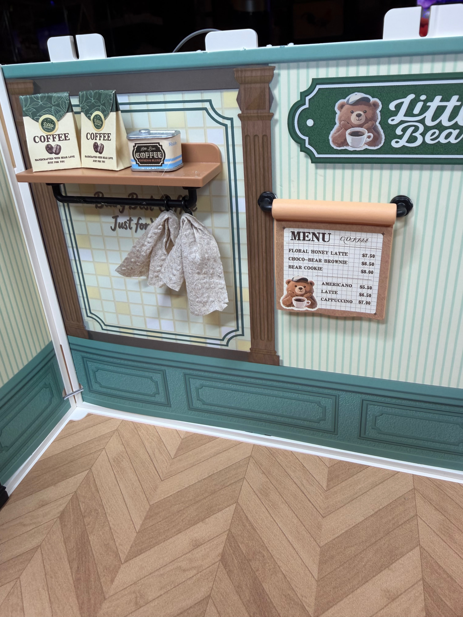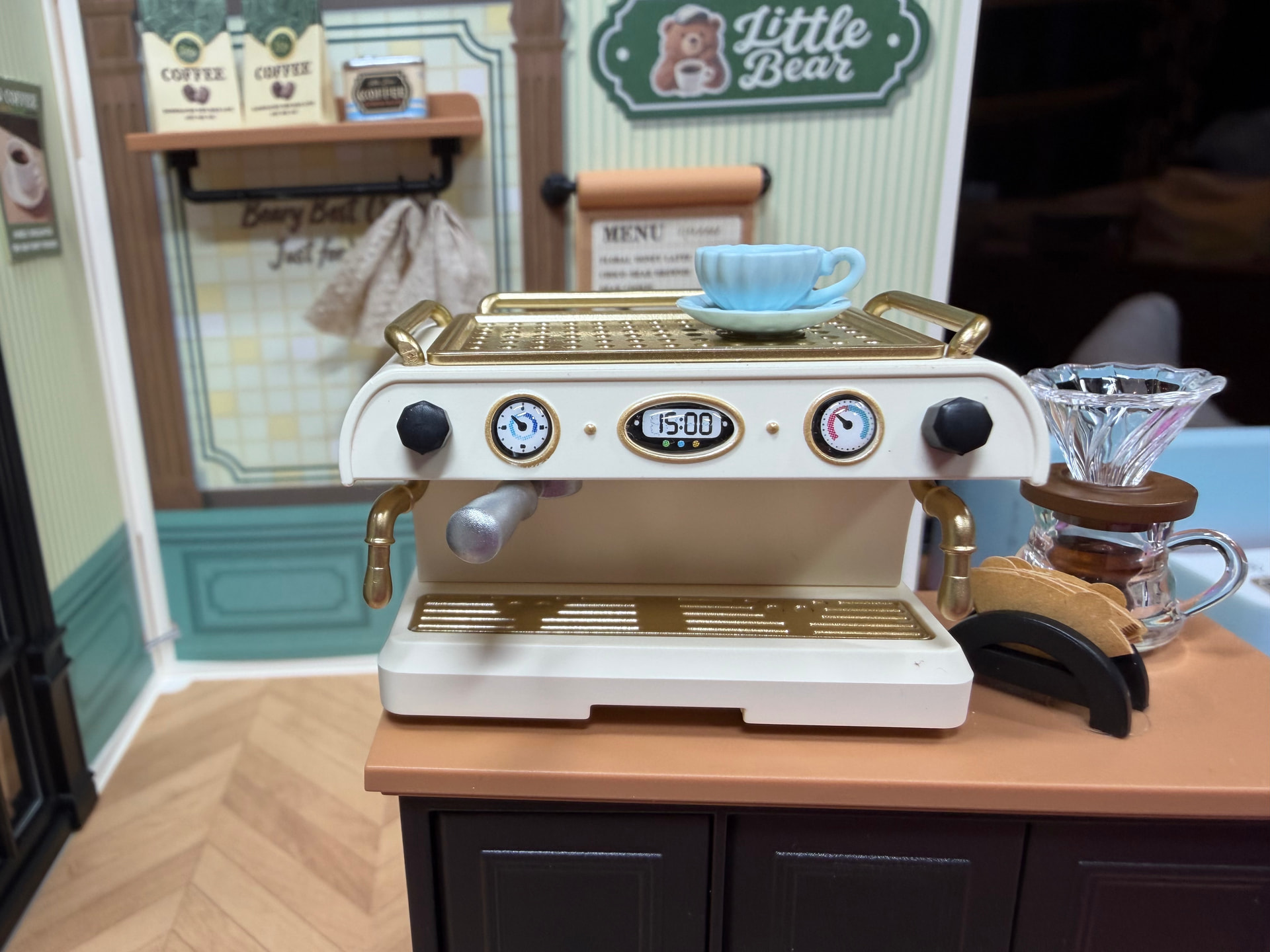 The espresso machine is honestly one of my favorite parts. It has that industrial coffee shop look, and the level of detail on it is impressive for something so small. The service counter also stood out to me — it has a marble-style finish that gives it a more polished, upscale feel.