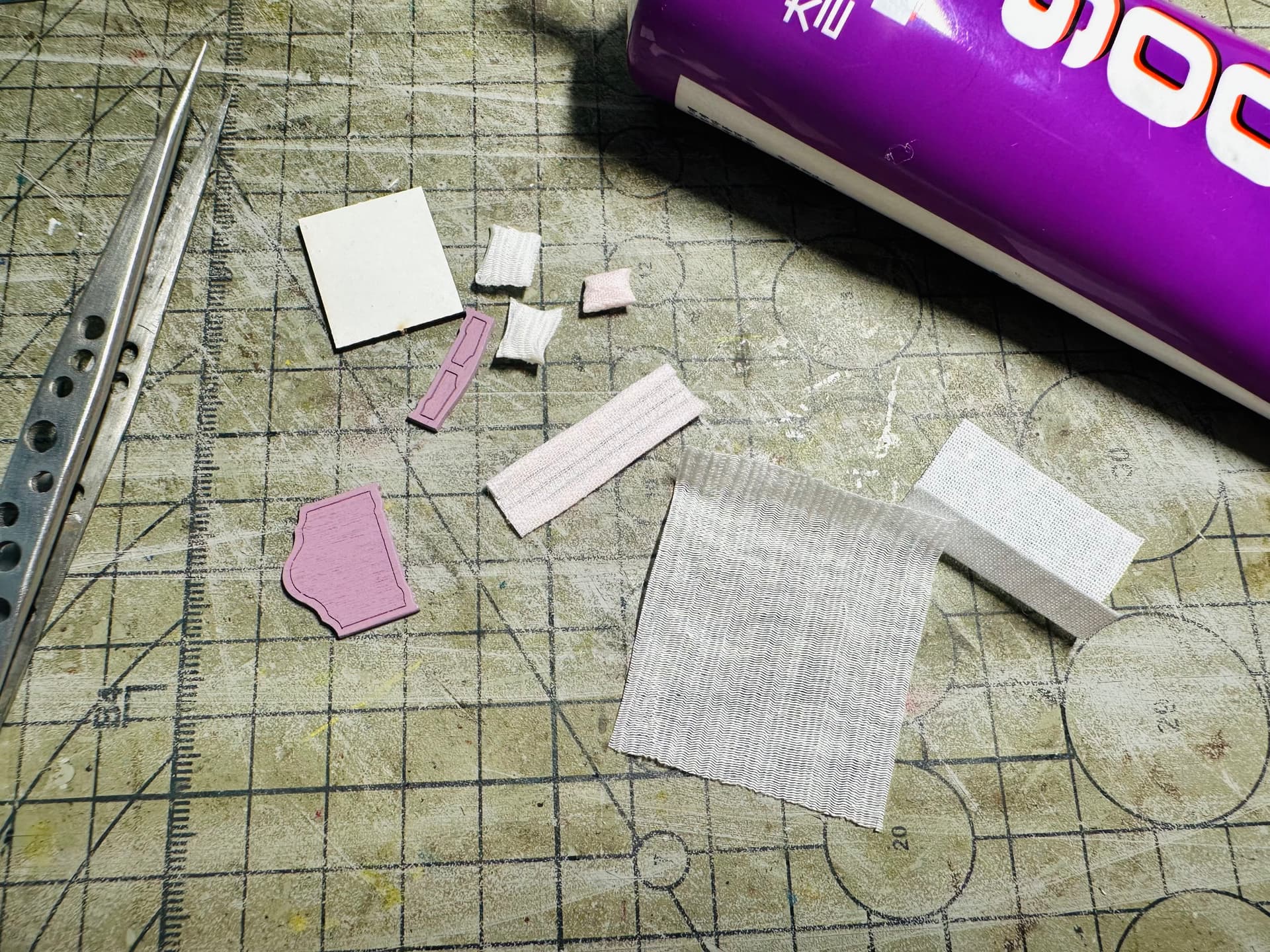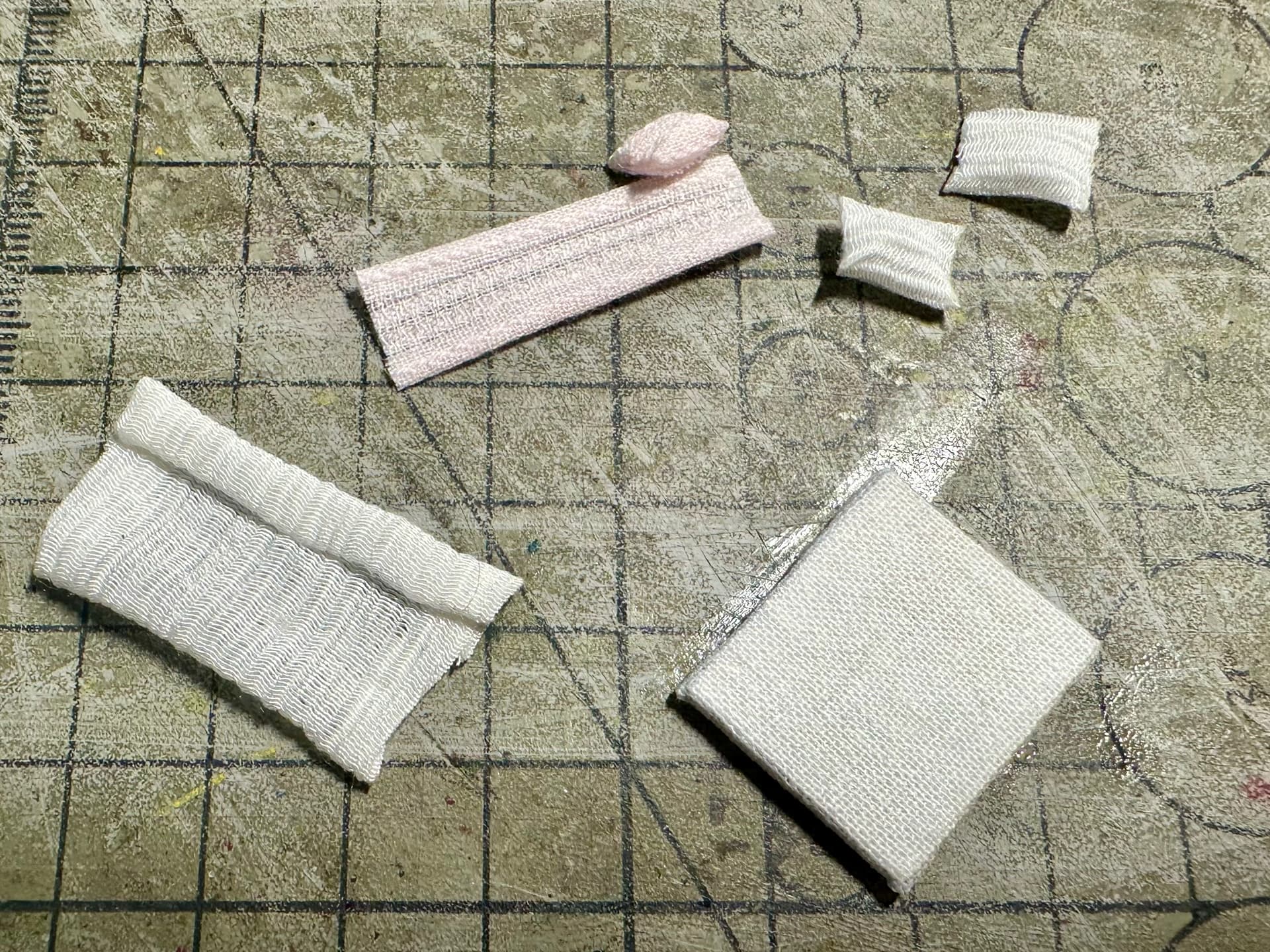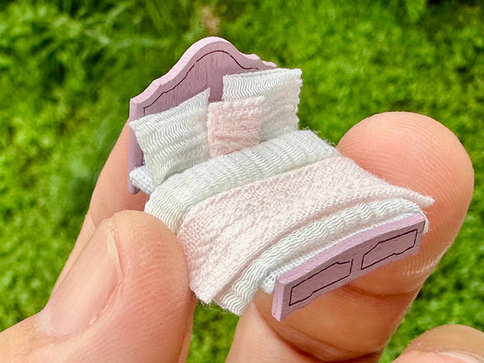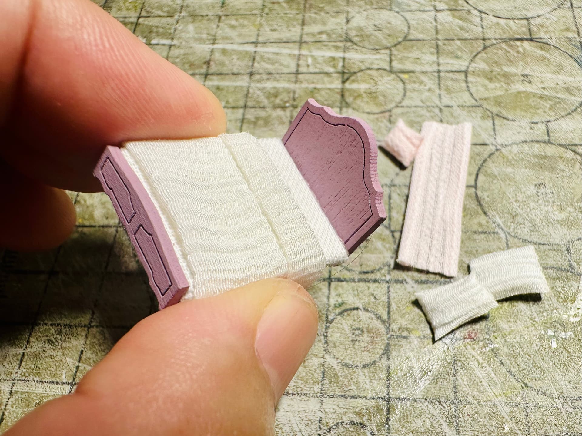 I made a tiny bed. The materials were fabric, wood, and cardboard. I made three pillows, a mattress, and a blanket.