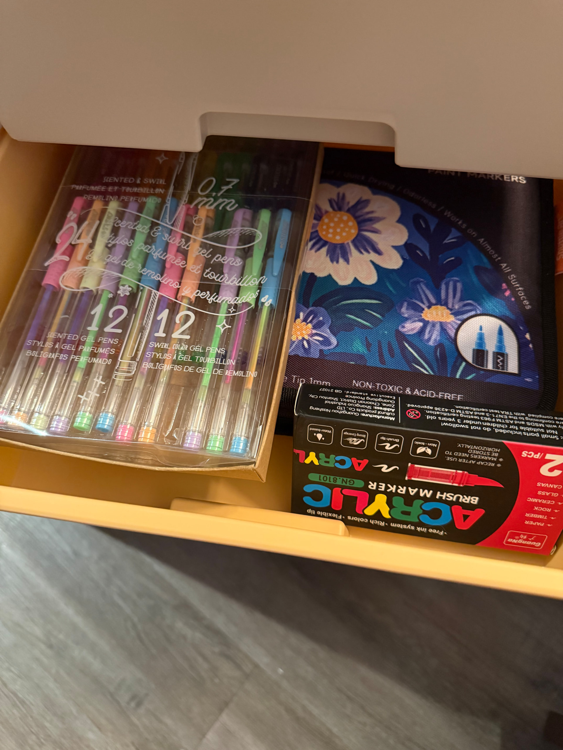 Drawer #8 has my paint markers as well as a pack of gel pens! I find the gel pens work really well when you are measuring black wire, it’s clearly visible and easy to wipe off after!
