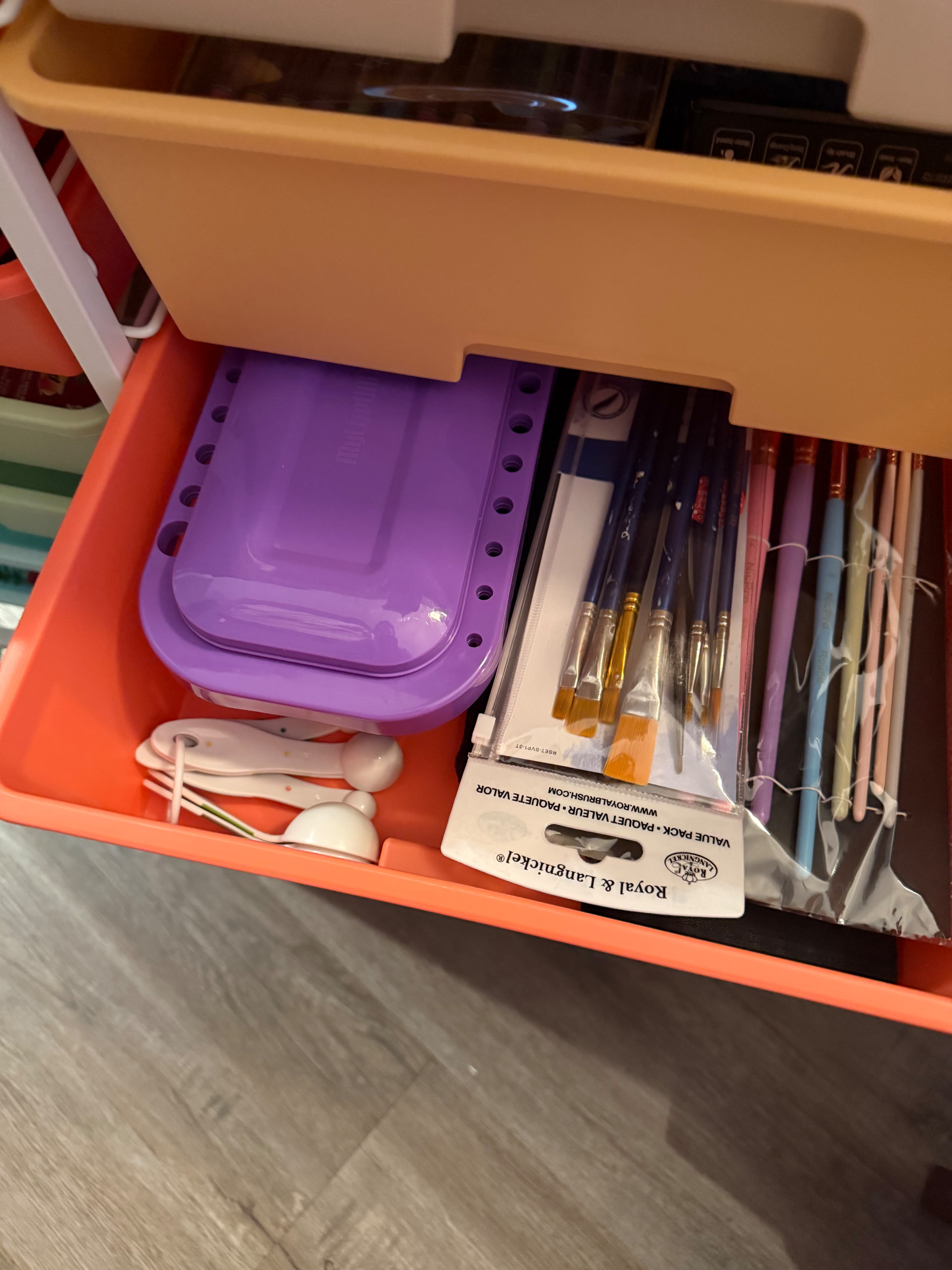 Next drawer is just paint supplies like brushes, soak bin, and measuring spoons for when I need to make a stain out of paint!