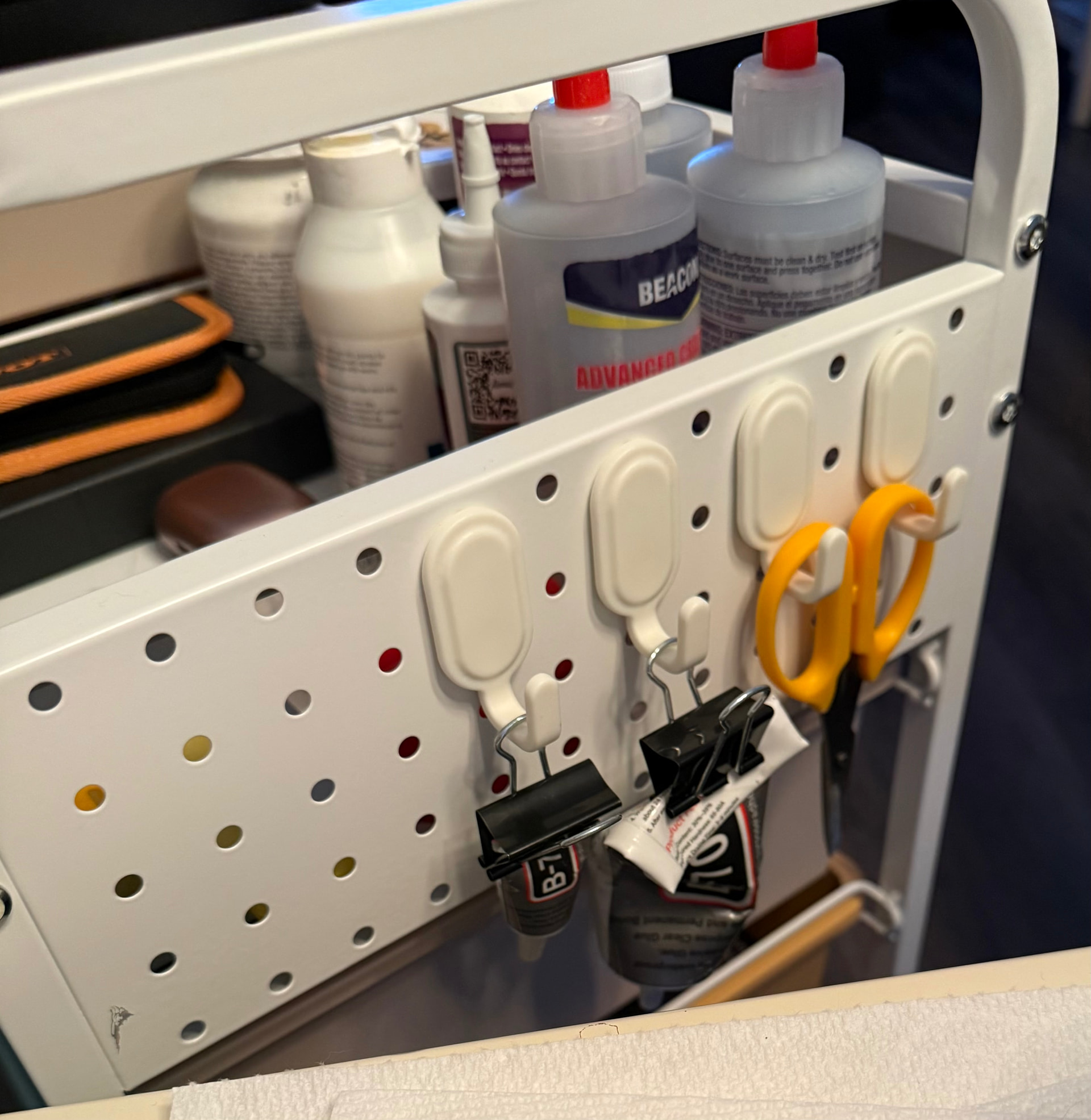 On the hooks on my cart, I like to keep the current tubes of glue that I’m using, as well as my scissors! I really like the Olfa brand for my scissors and craft knives, they are a Japanese brand that you can find on Amazon, or online hobby shops!