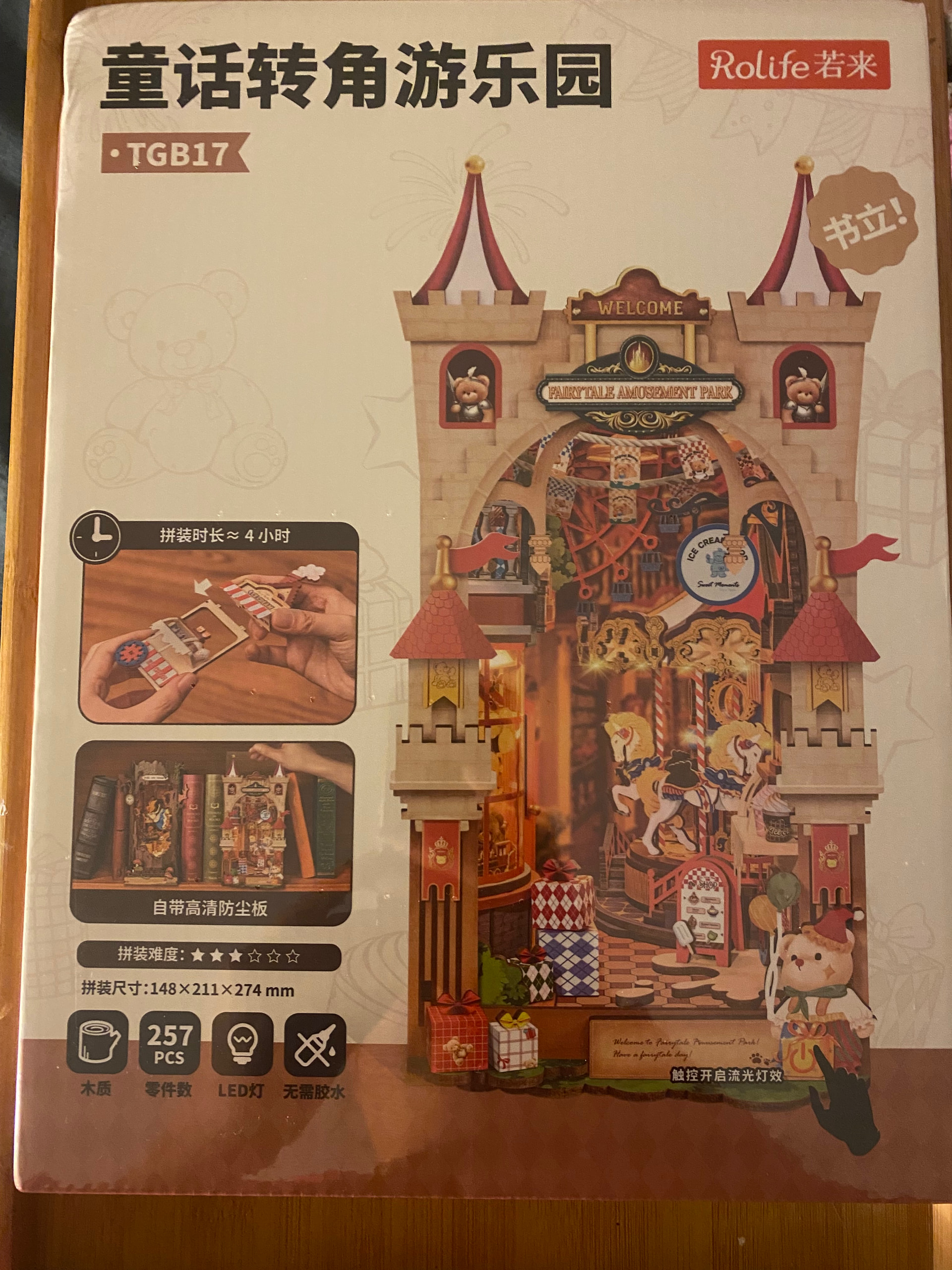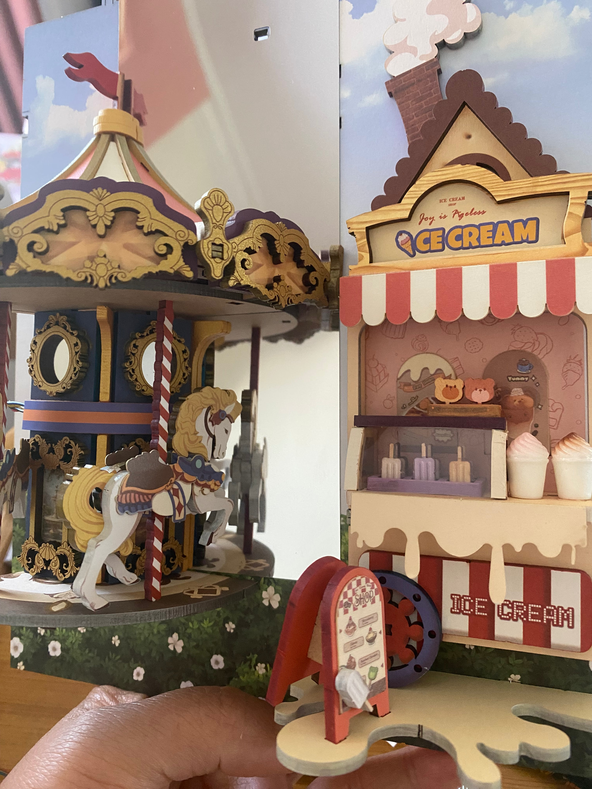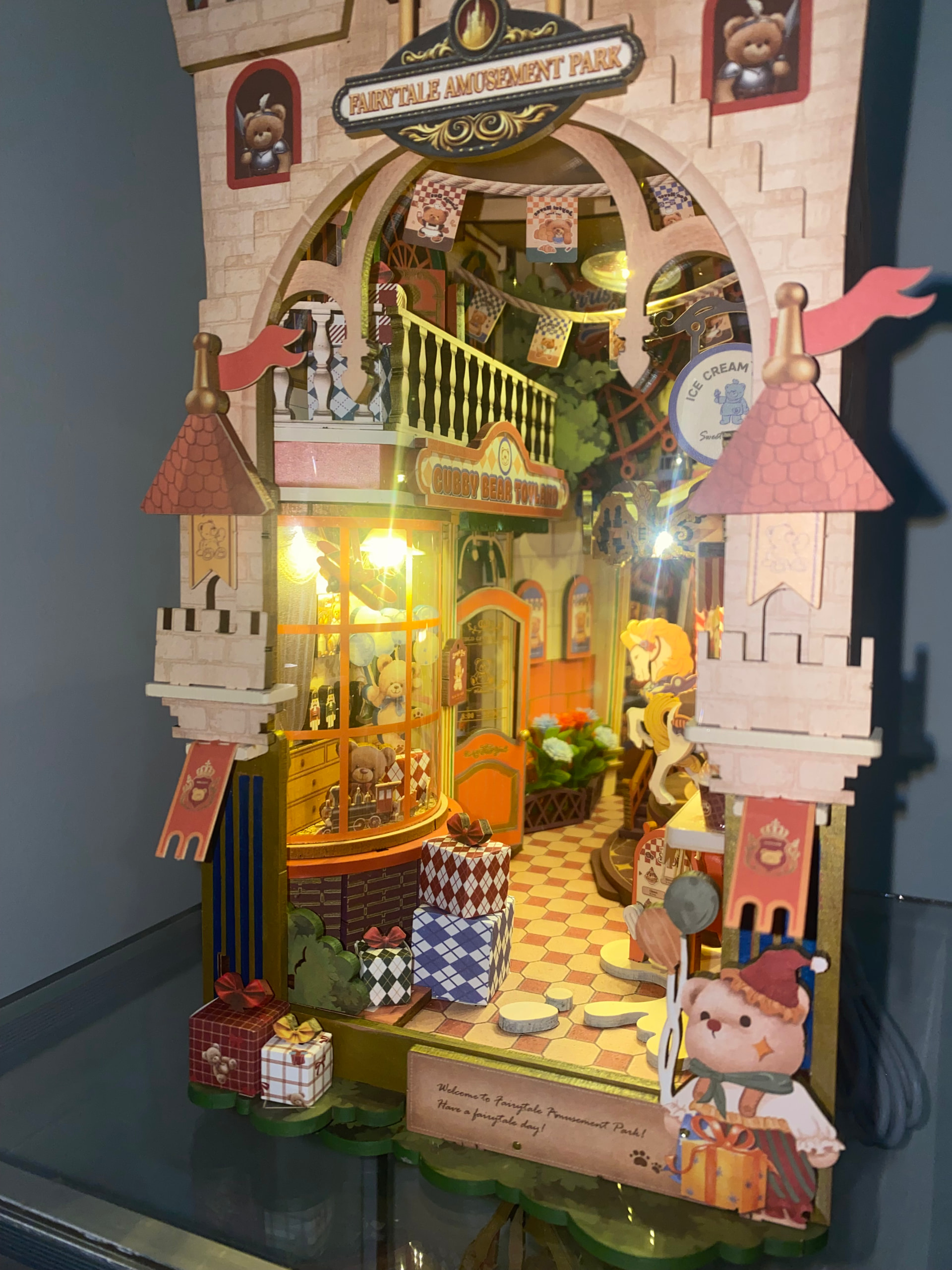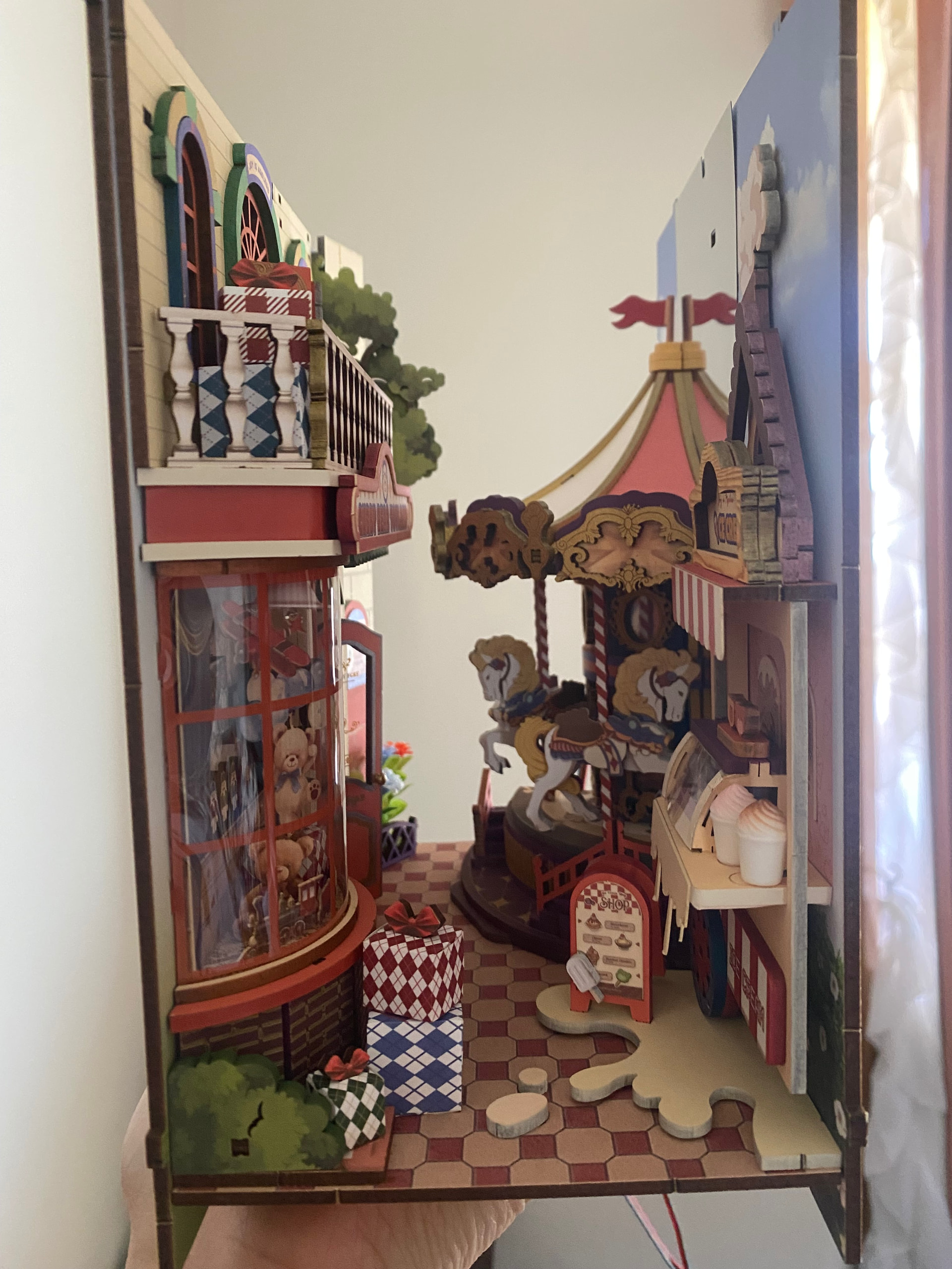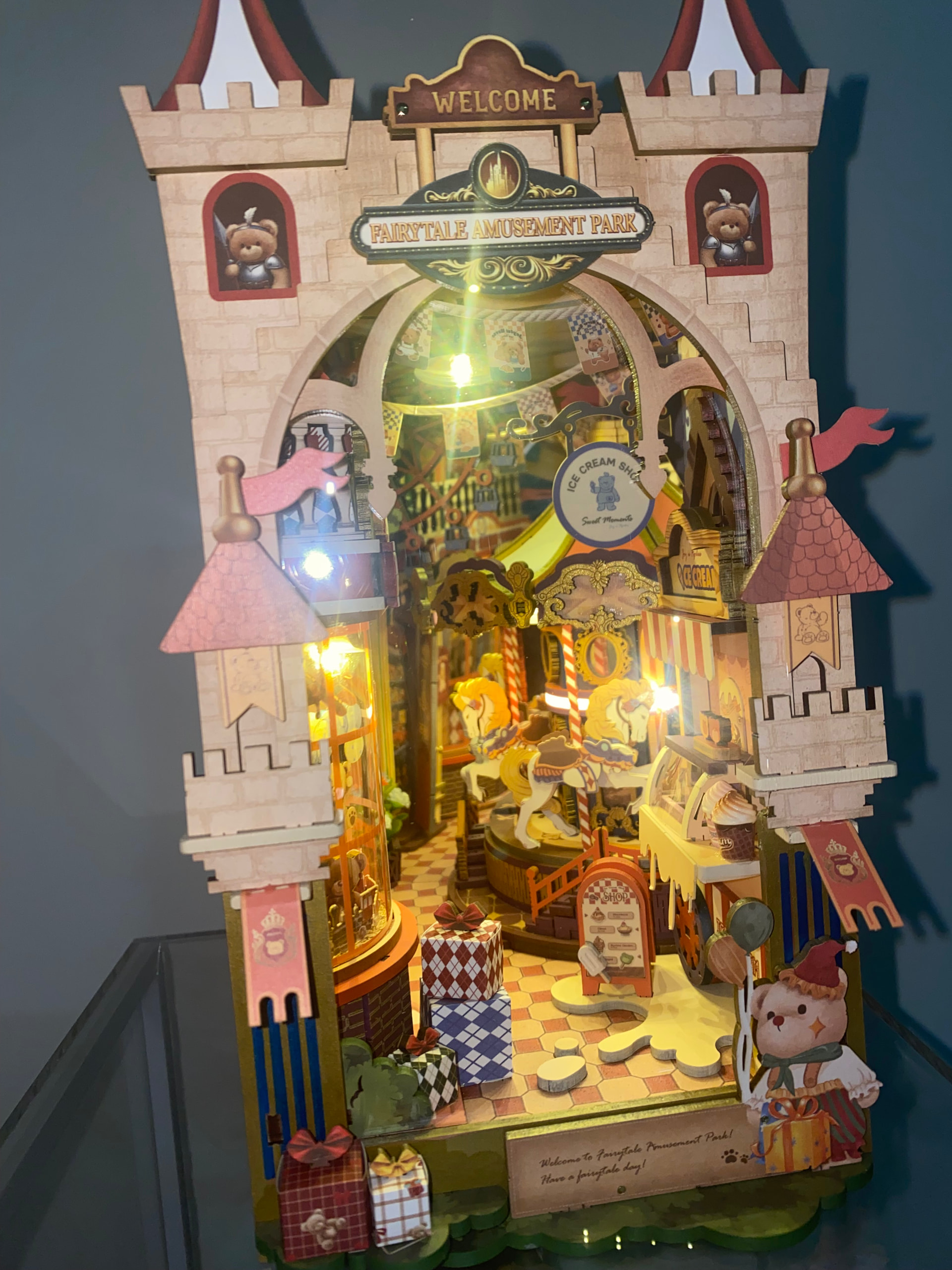 This is my second book nook and I absolutely fell in love with it the minute I saw it.The fact that it comes with the clear dust cover just gave me that piece of mind that my kit won’t get dusty. I enjoyed every moment of building this kit and will absolutely be looking for more. This is a perfect gift for anyone that enjoys the theme of the amusement park. The lighting of this kit is very straight forward so you will be able to put it together with ease.