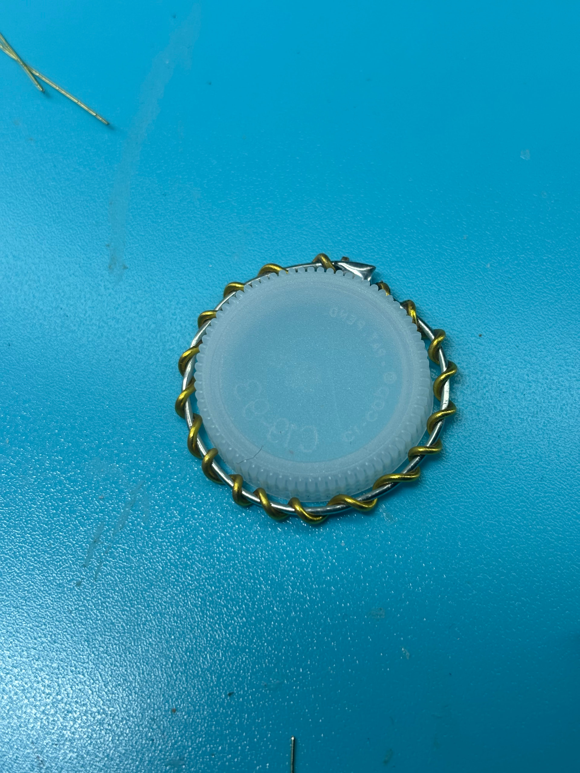 But since I couldn’t fix those pieces, I came up with the idea of twisting a gold and silver wire together and shaping it into a circle. Since I also make stained glass, I had a soldering iron on hand, so I soldered the ends of the twisted wire as it made a circle around a water bottle cap that happened to be the perfect size that I needed the ring to be.