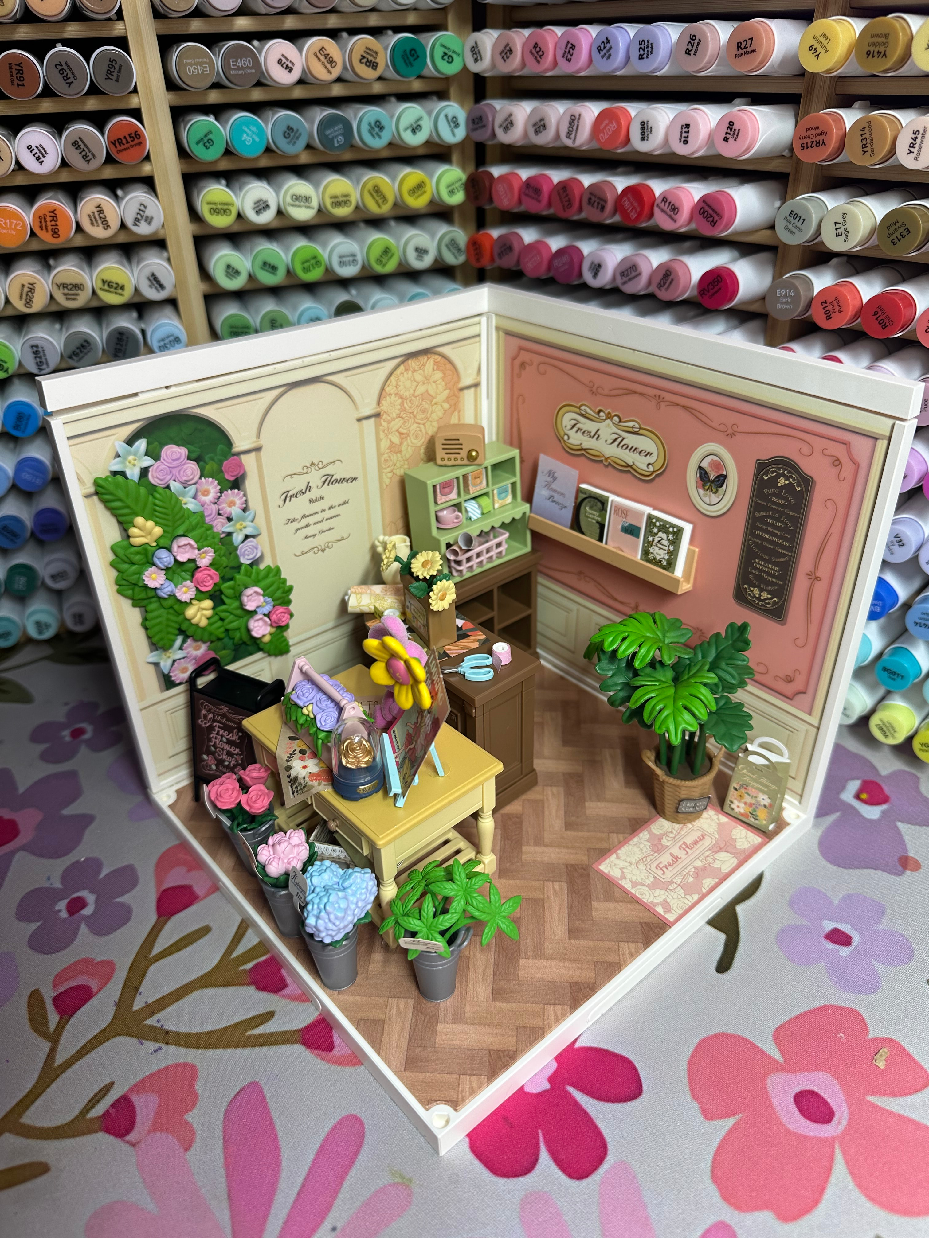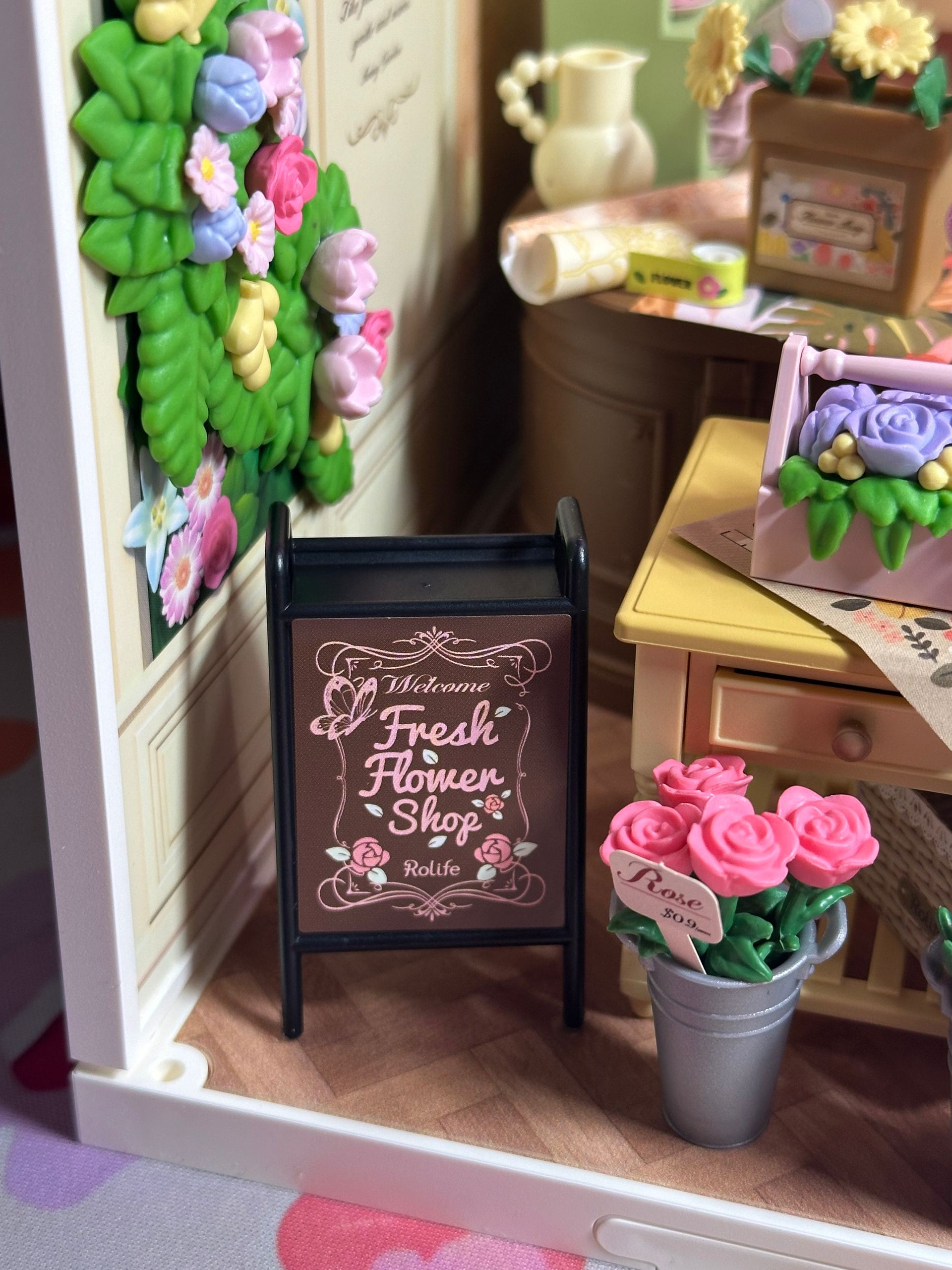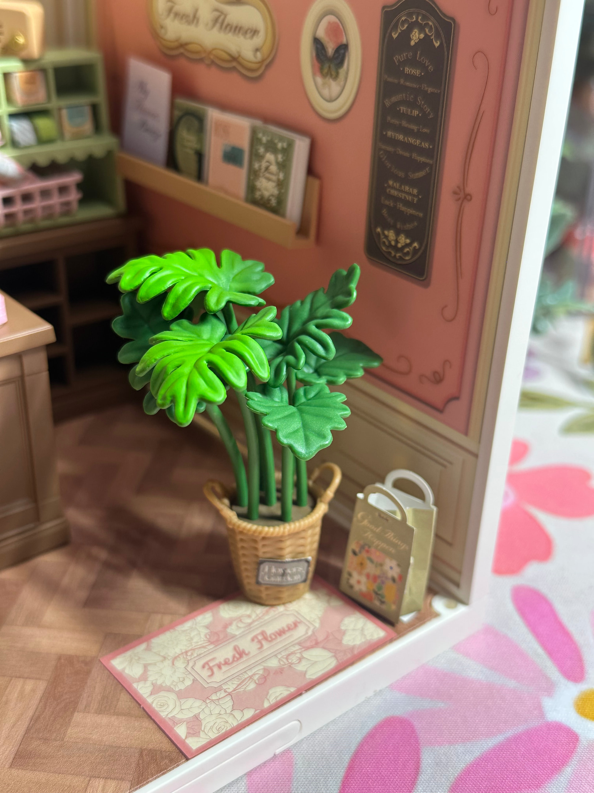 There was something so calming about it — placing each tiny flower, organizing the little displays, and watching this soft pastel shop come to life piece by piece. And I have to say… I was SO thankful the flowers were plastic this time it made the whole process feel relaxing instead of stressful.