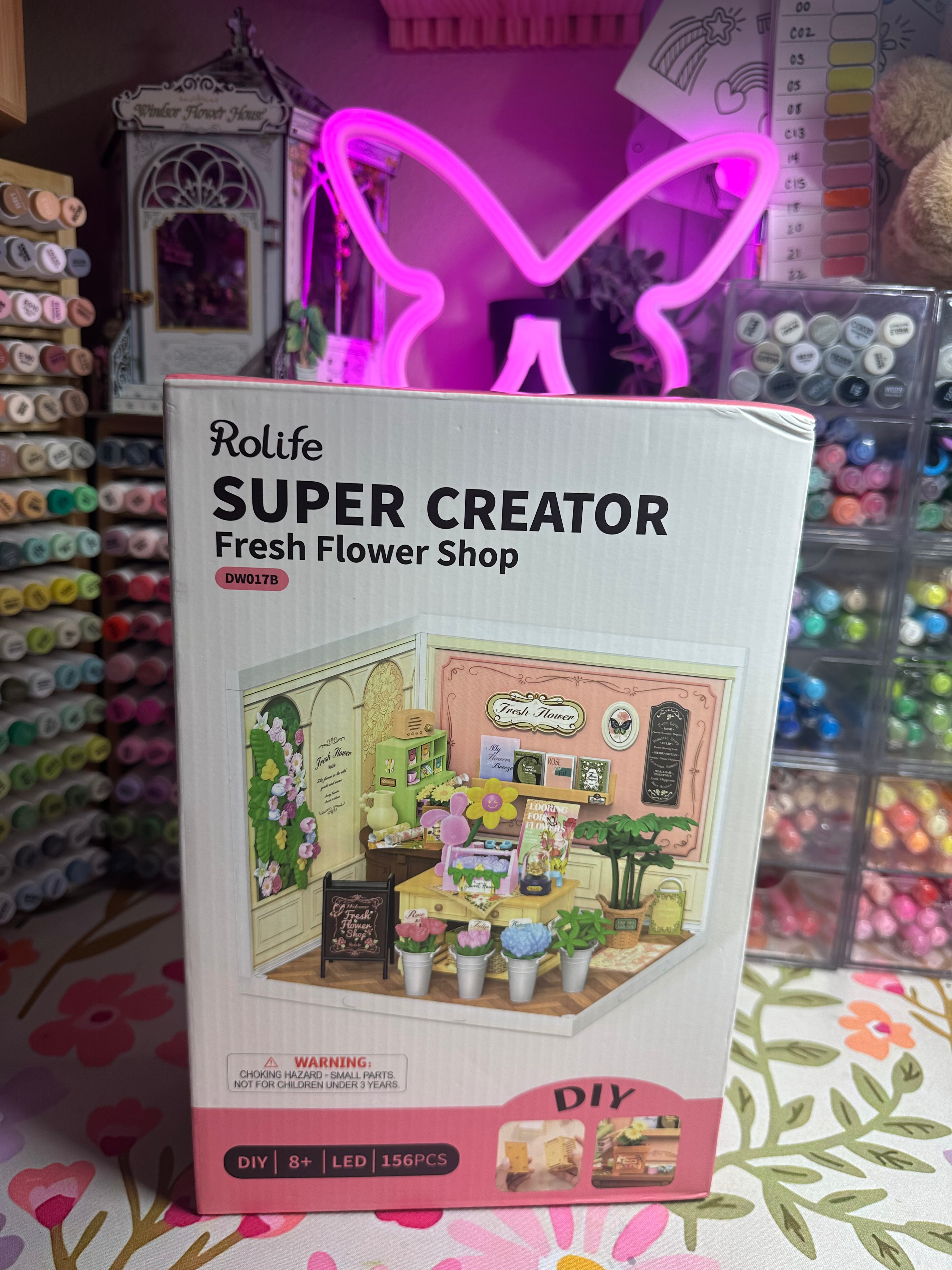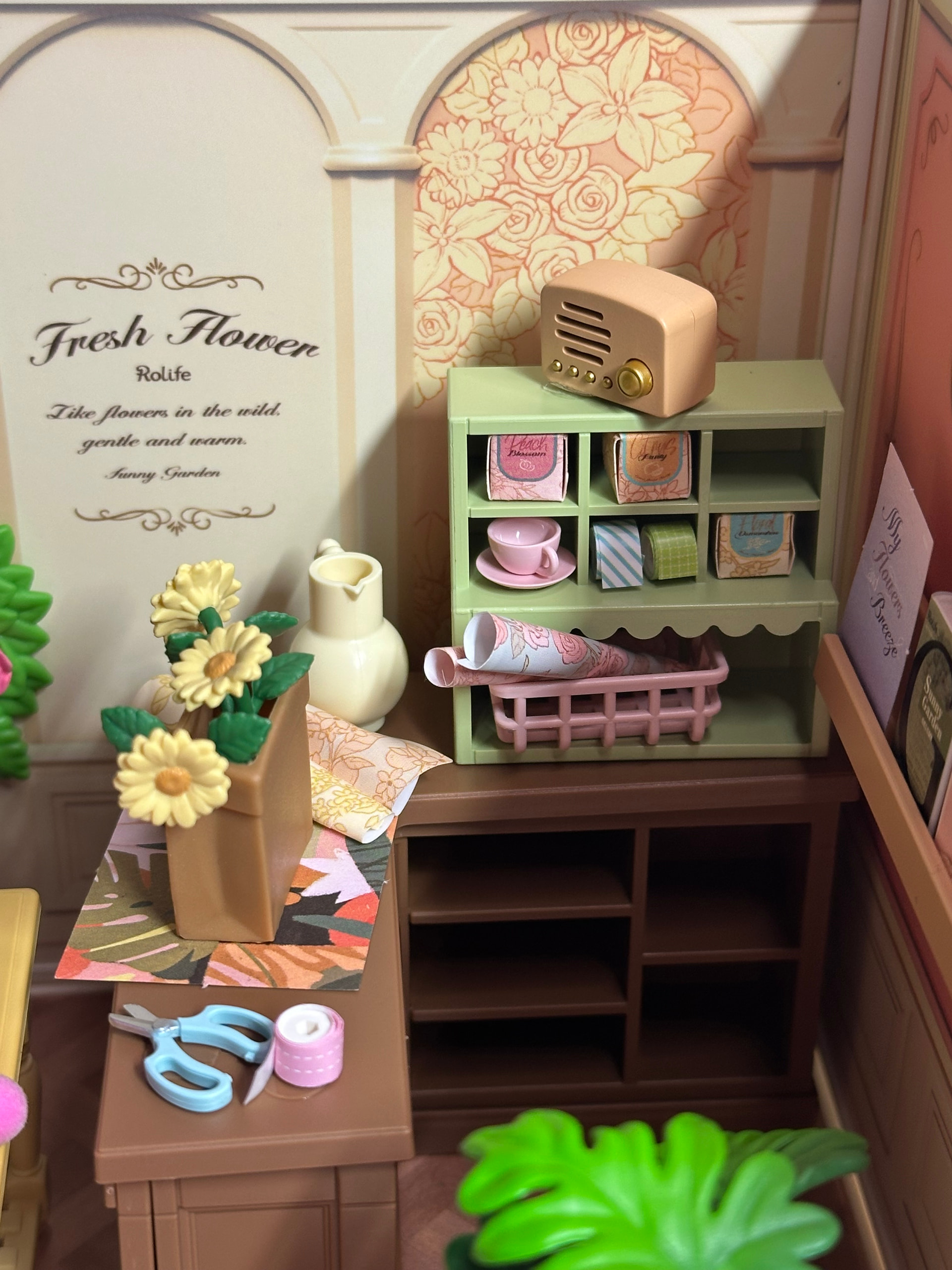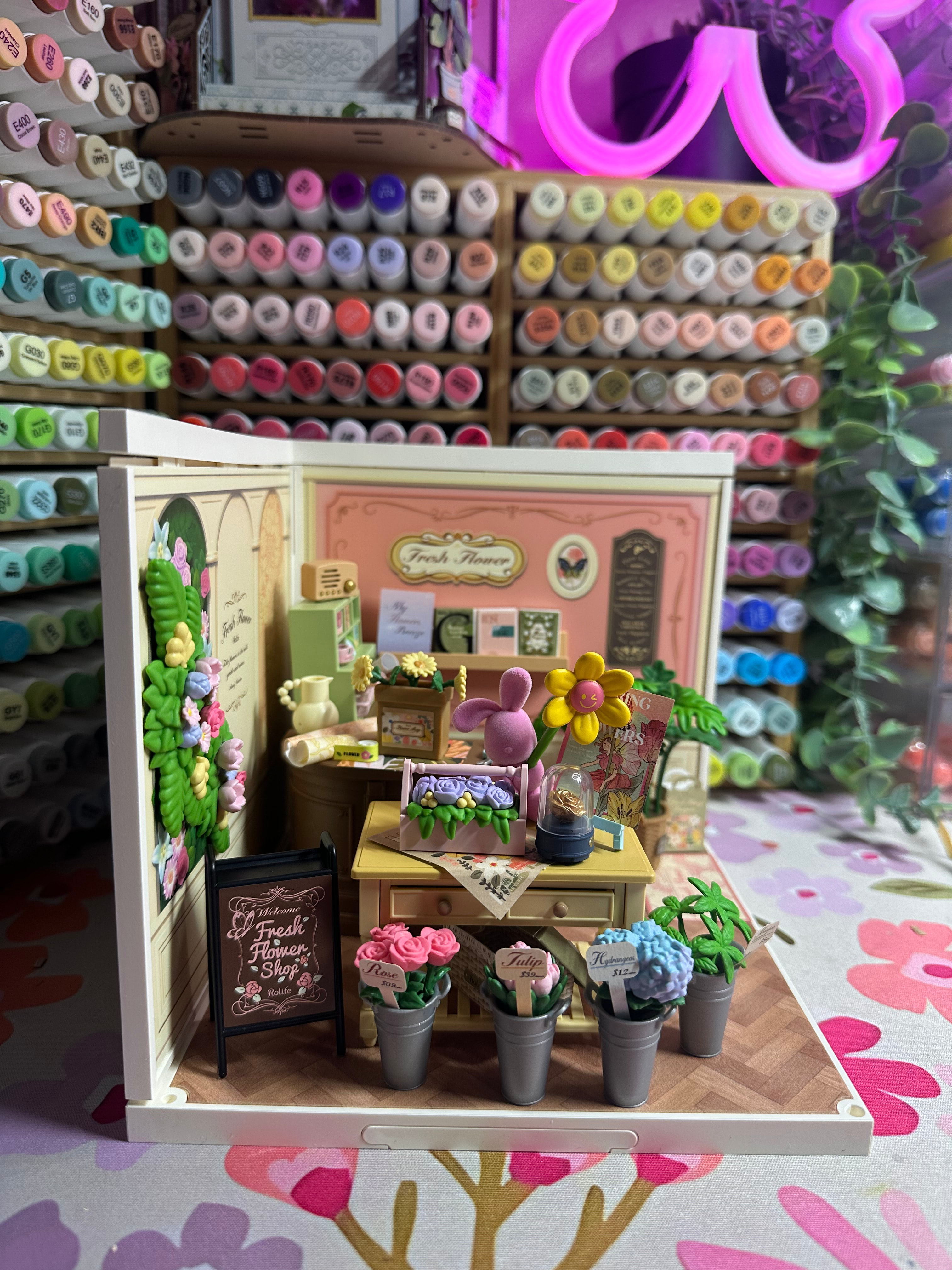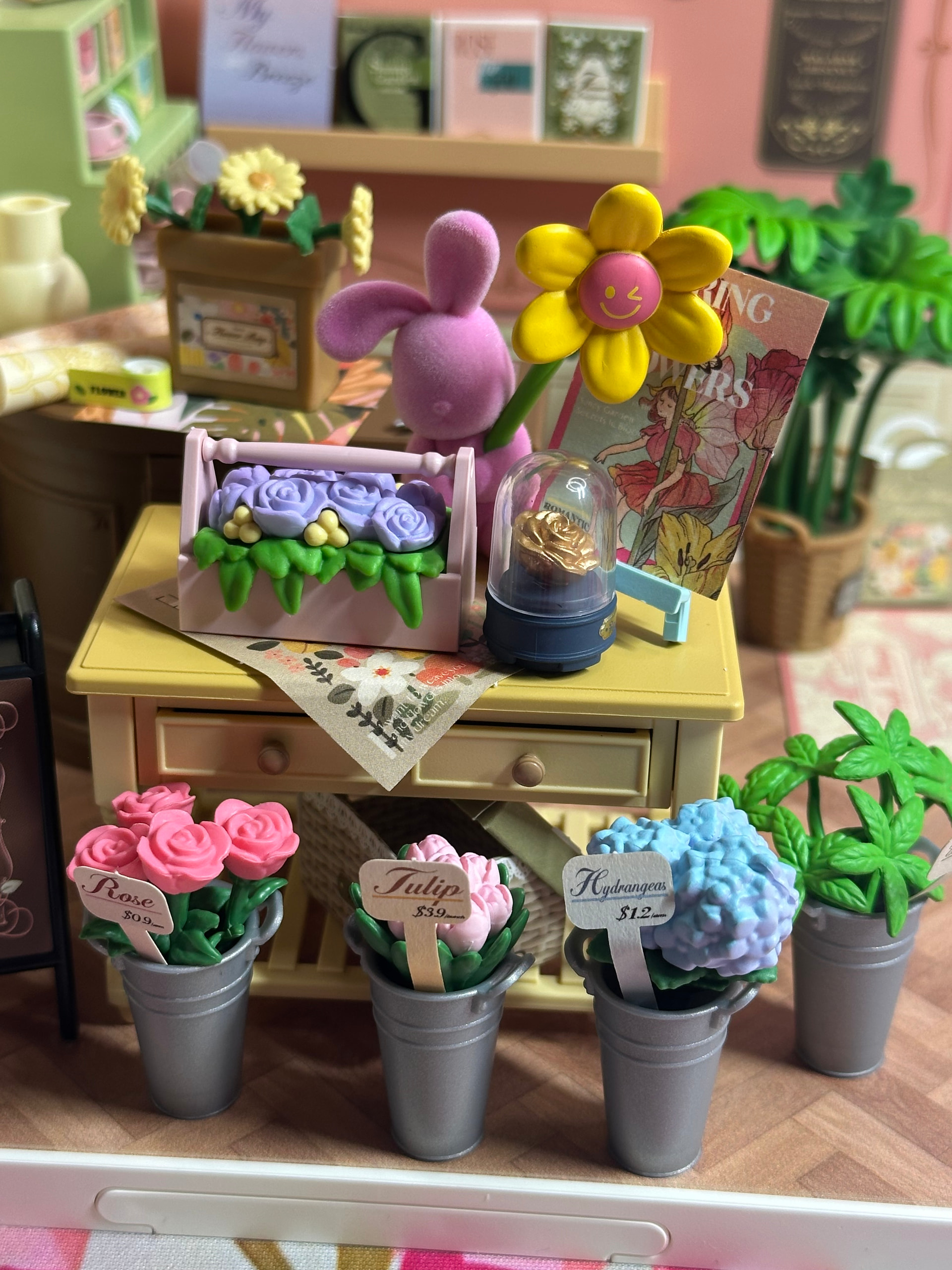 There was something so calming about it — placing each tiny flower, organizing the little displays, and watching this soft pastel shop come to life piece by piece. And I have to say… I was SO thankful the flowers were plastic this time it made the whole process feel relaxing instead of stressful.