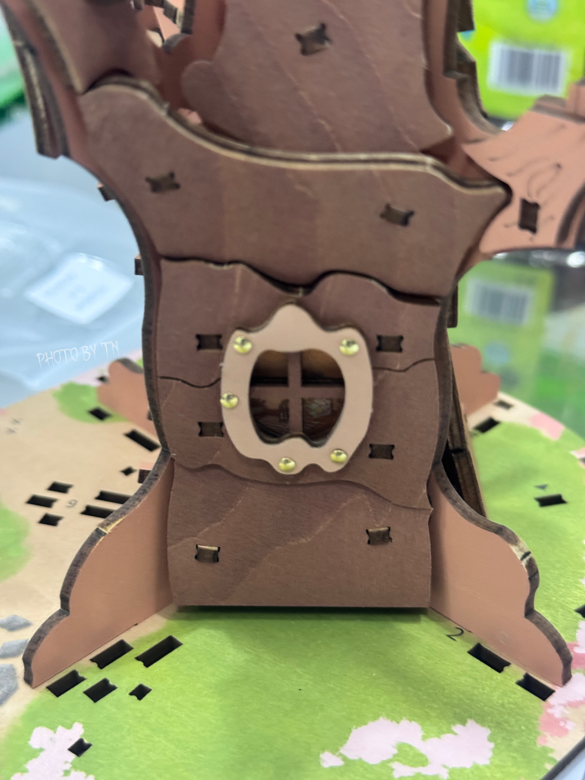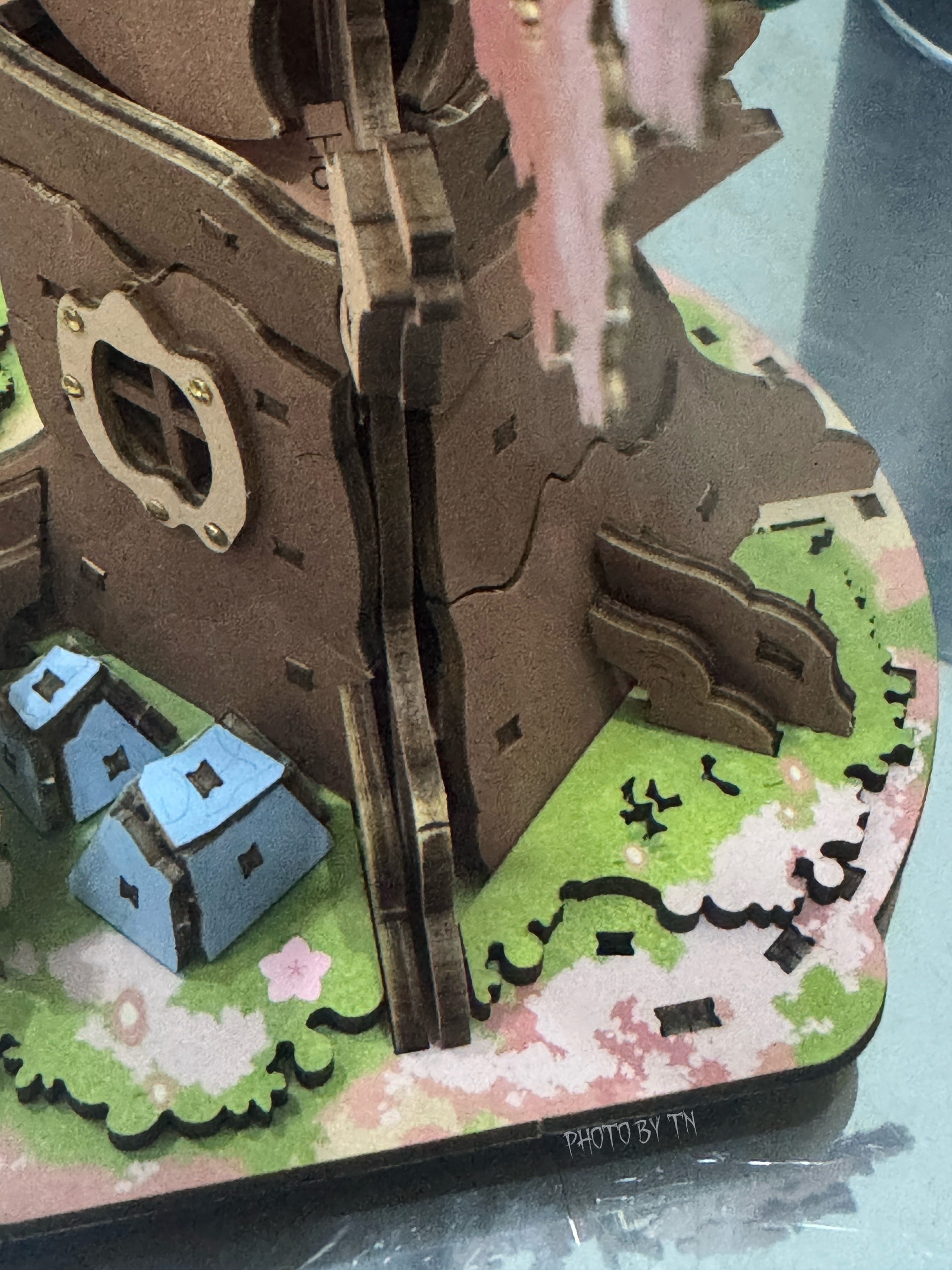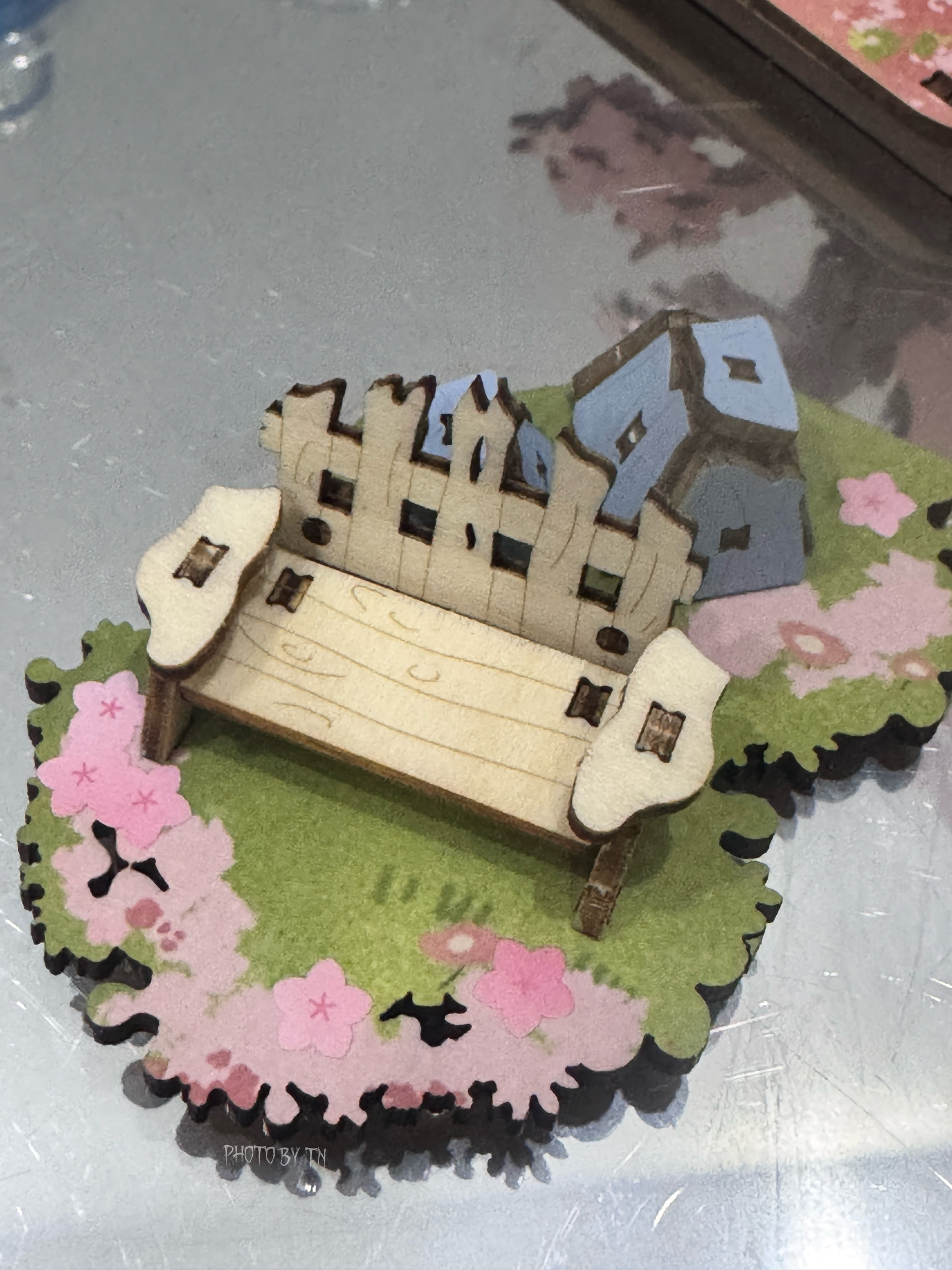 After finishing the cherry blossom layers, I started attaching the tree. Everything was detailed with instructions; I just followed each step, and the complete tree was finished. I really like the little bench next to the base. It gives me a feeling of tranquility, like sitting under the tree in the afternoon, watching everything around me. No noise, no busyness, just a moment to find peace of mind.