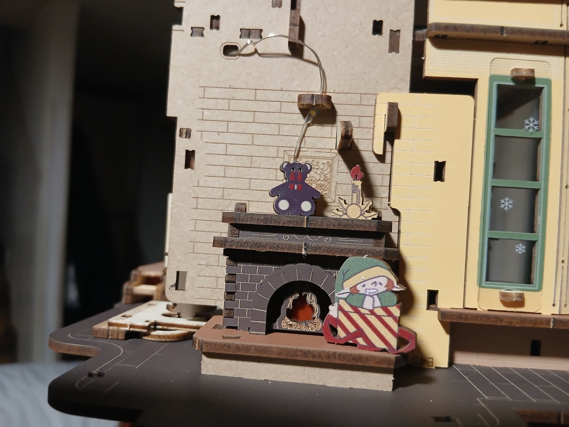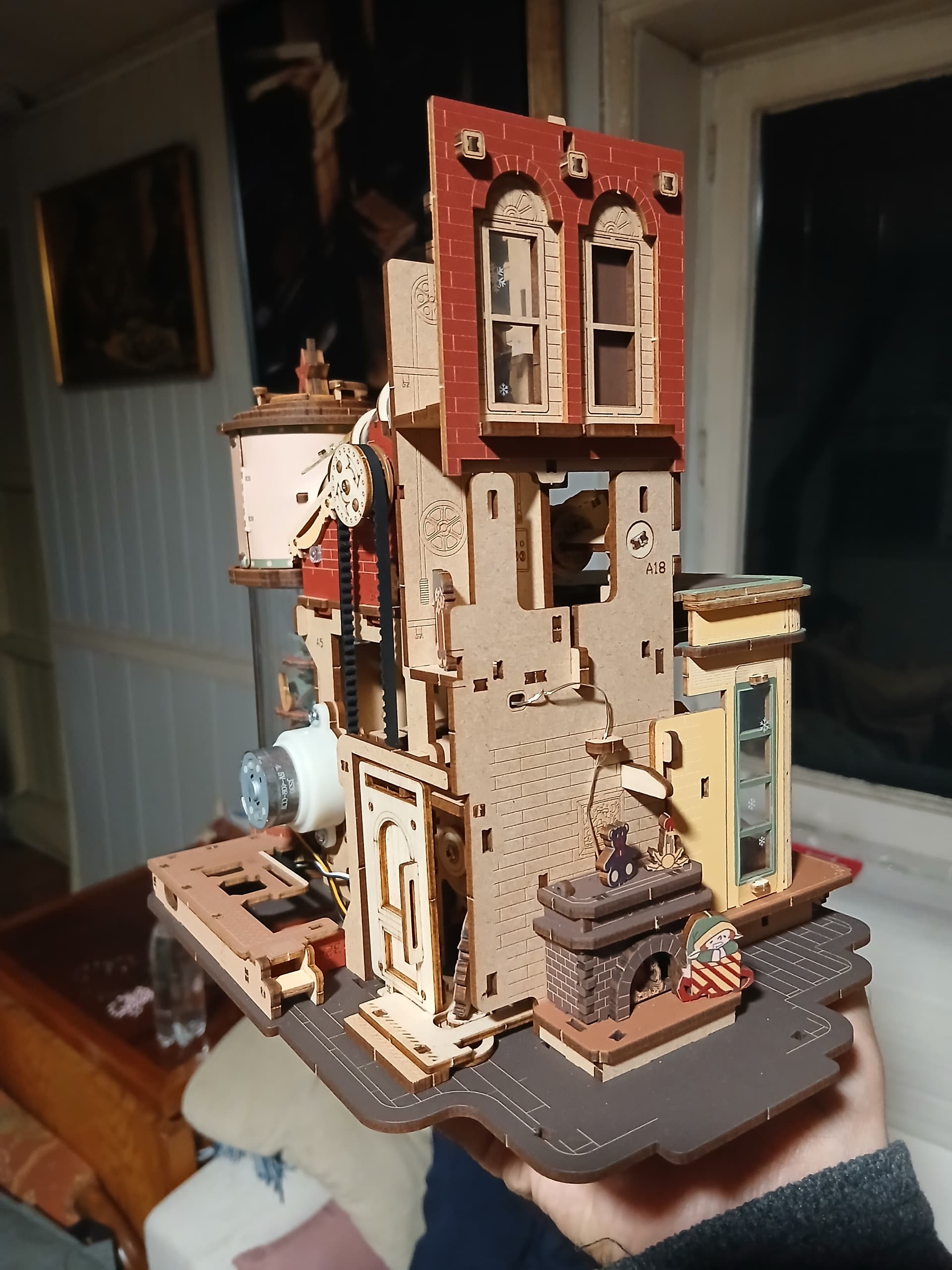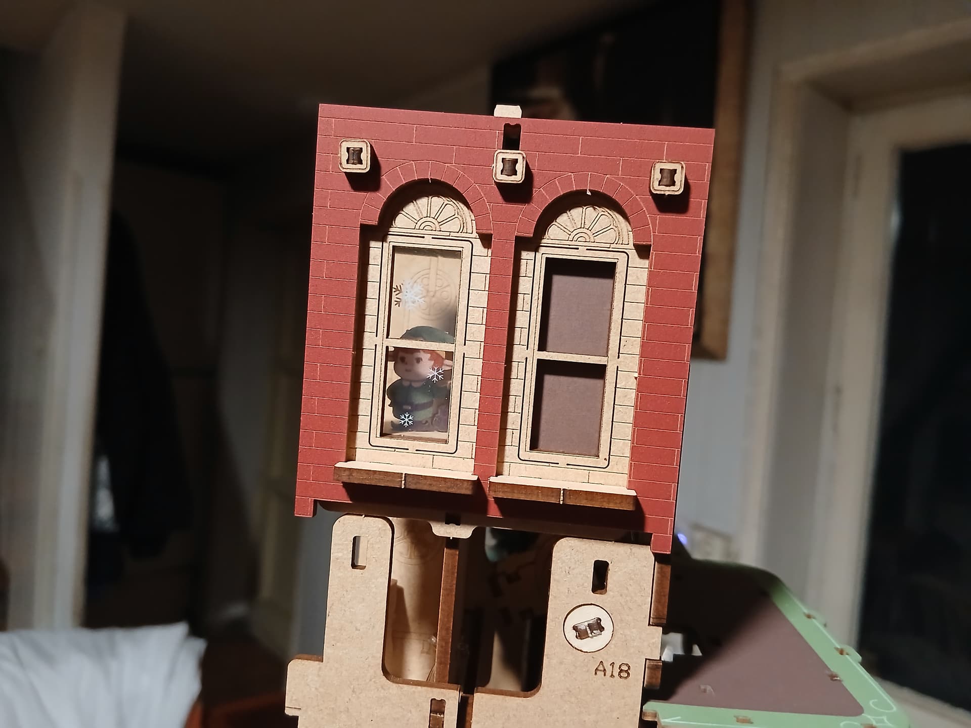 Conveniently enough, today I didn’t have much time and it was time to make “section” 16, which is short and it basically meant to build the side top window (through which you can see the cute elf) and the chimney. It’s also nice to focus on these tiny cute details, right? Like assembling a window and a chimney and adding it to the main structure. Sometimes we focus on the bigger parts or the ones that make it all work together (like the gears, the big parts, the main body) and we forgot that these and those details are what make this kind of builds unique, so it’s nice from time to time to leave the “put all this together” or “twist the string here and there” or “wax those gears” and just put little and colorful details together.